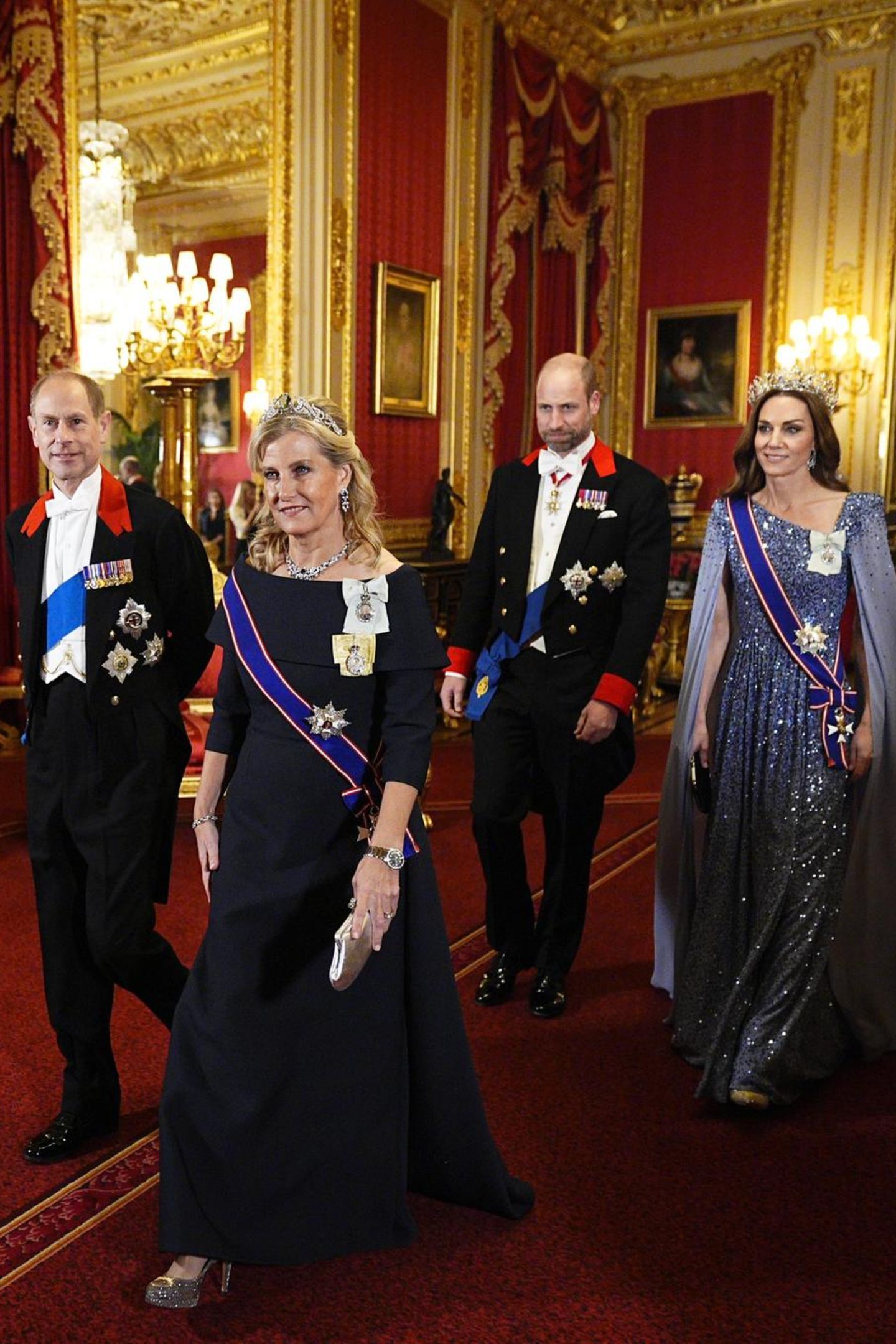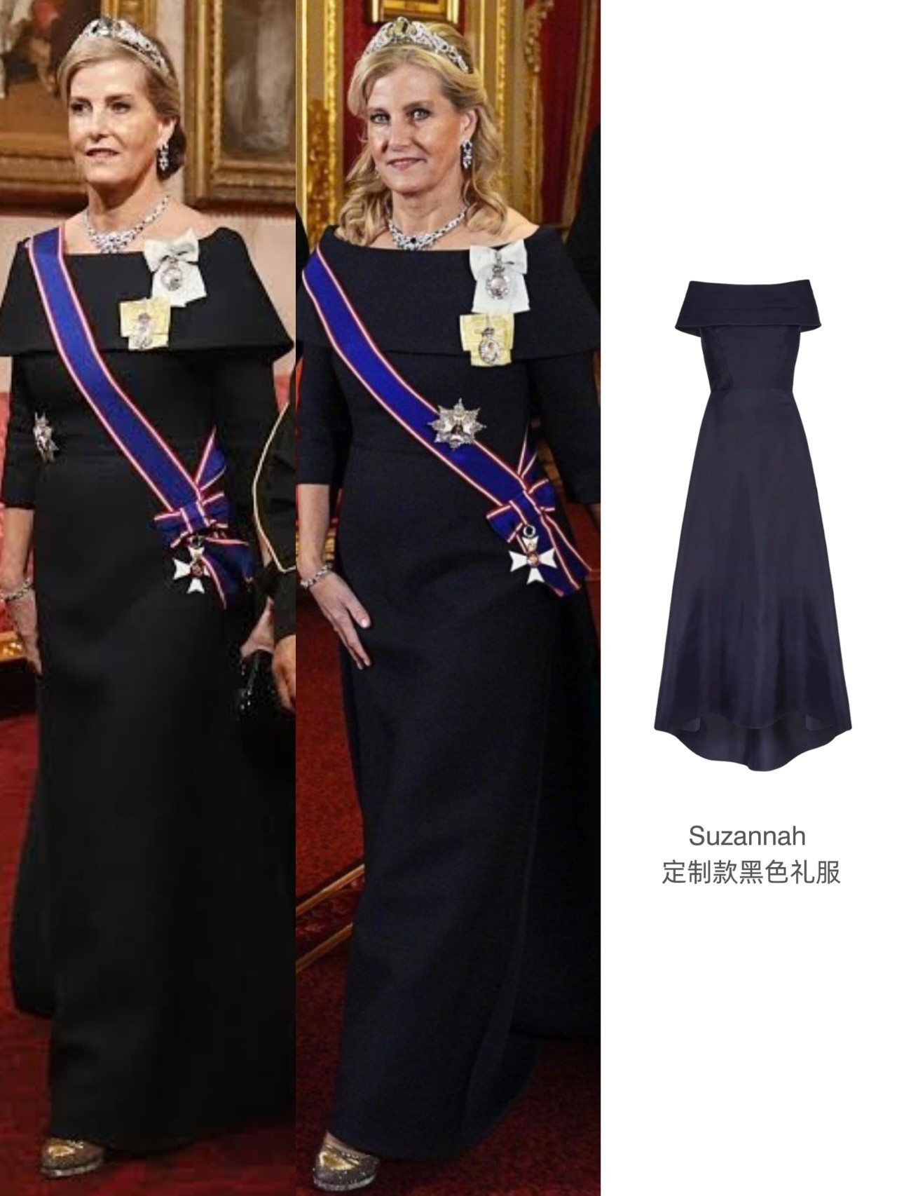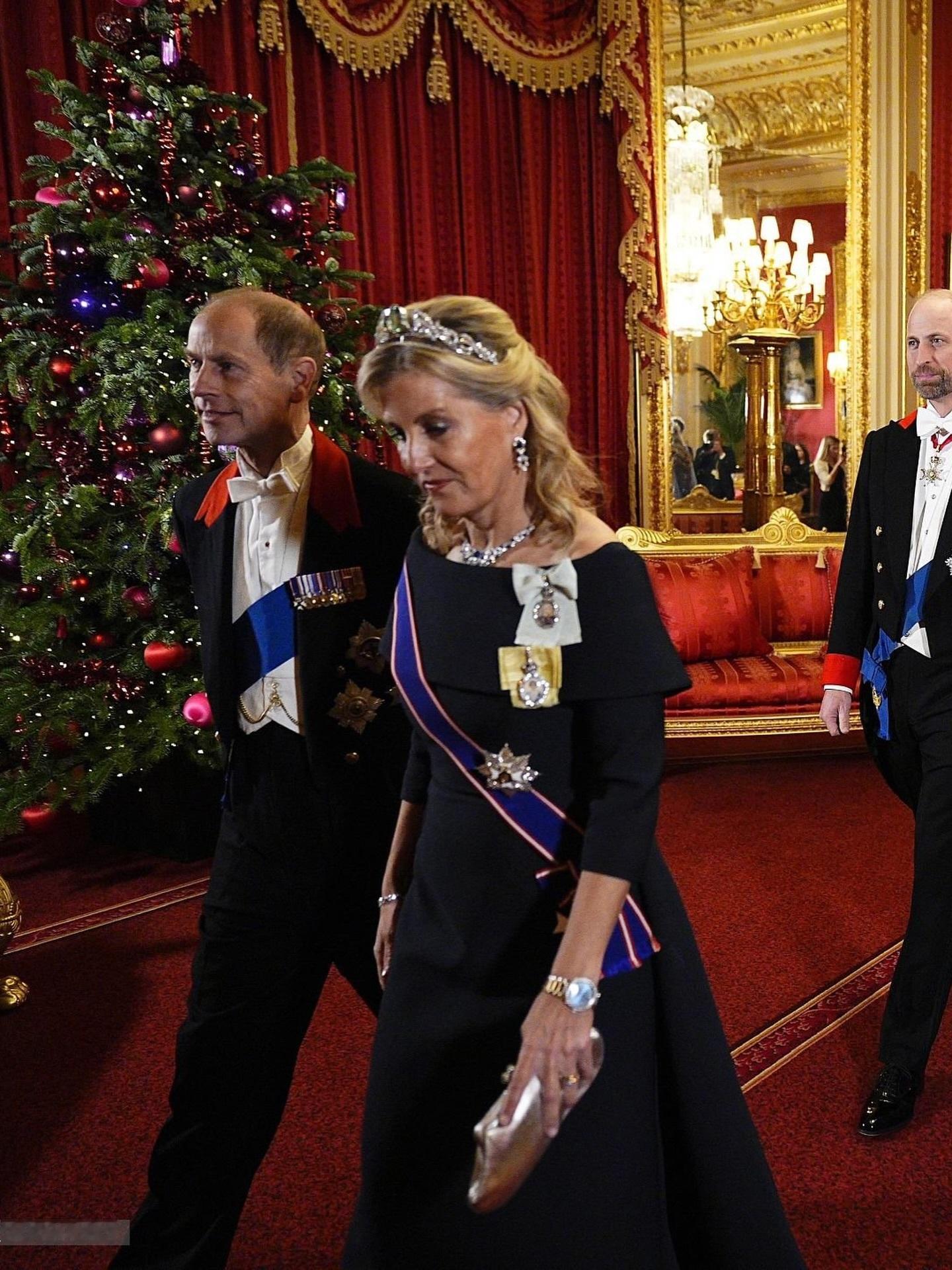 12月3日,爱丁堡公爵夫妇出席于温莎城堡圣乔治大厅为德国总统施泰因迈尔及其夫人所举办的欢迎晚宴🍴~苏菲和凯特有些共通点,两人一起披发戴Tiara,一同拿了Anya Hindmarch的晚宴包……苏菲这一身LOOK基本Copy的24年出席卡塔尔欢迎晚宴的那一身,礼服+Tiara+Graff蓝宝石半套装+LK Bennett高跟鞋+伊二&查尔斯国王家族勋章,唯一“变”的就是盘发变披发~