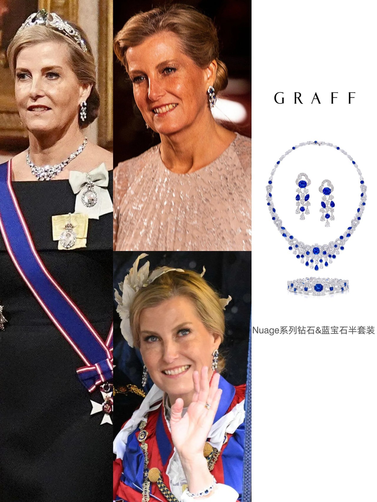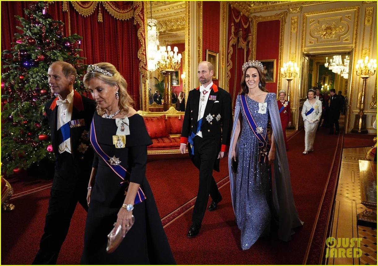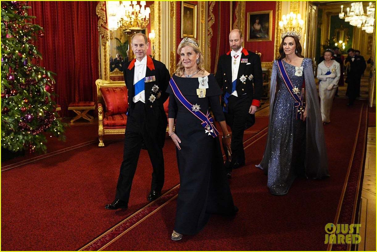 12月3日,爱丁堡公爵夫妇出席于温莎城堡圣乔治大厅为德国总统施泰因迈尔及其夫人所举办的欢迎晚宴🍴~苏菲和凯特有些共通点,两人一起披发戴Tiara,一同拿了Anya Hindmarch的晚宴包……苏菲这一身LOOK基本Copy的24年出席卡塔尔欢迎晚宴的那一身,礼服+Tiara+Graff蓝宝石半套装+LK Bennett高跟鞋+伊二&查尔斯国王家族勋章,唯一“变”的就是盘发变披发~