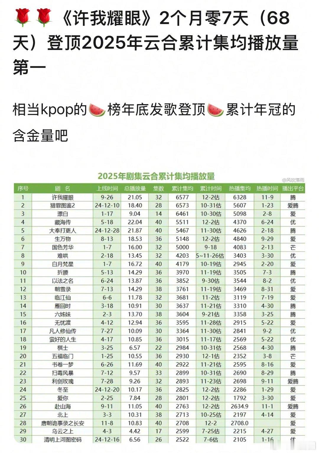 赵露思的许我耀眼68天登顶2025年云合累计集均播放量第一~