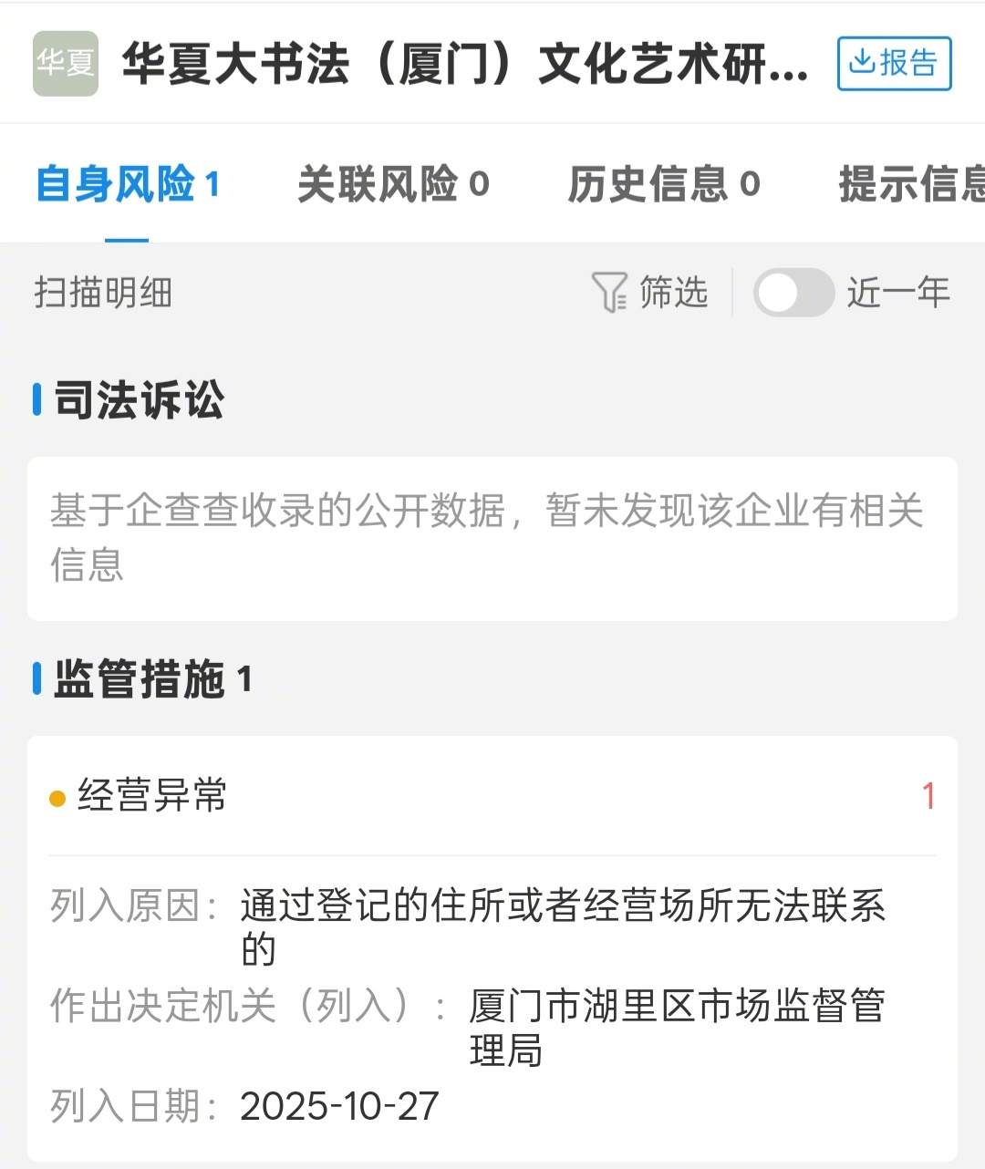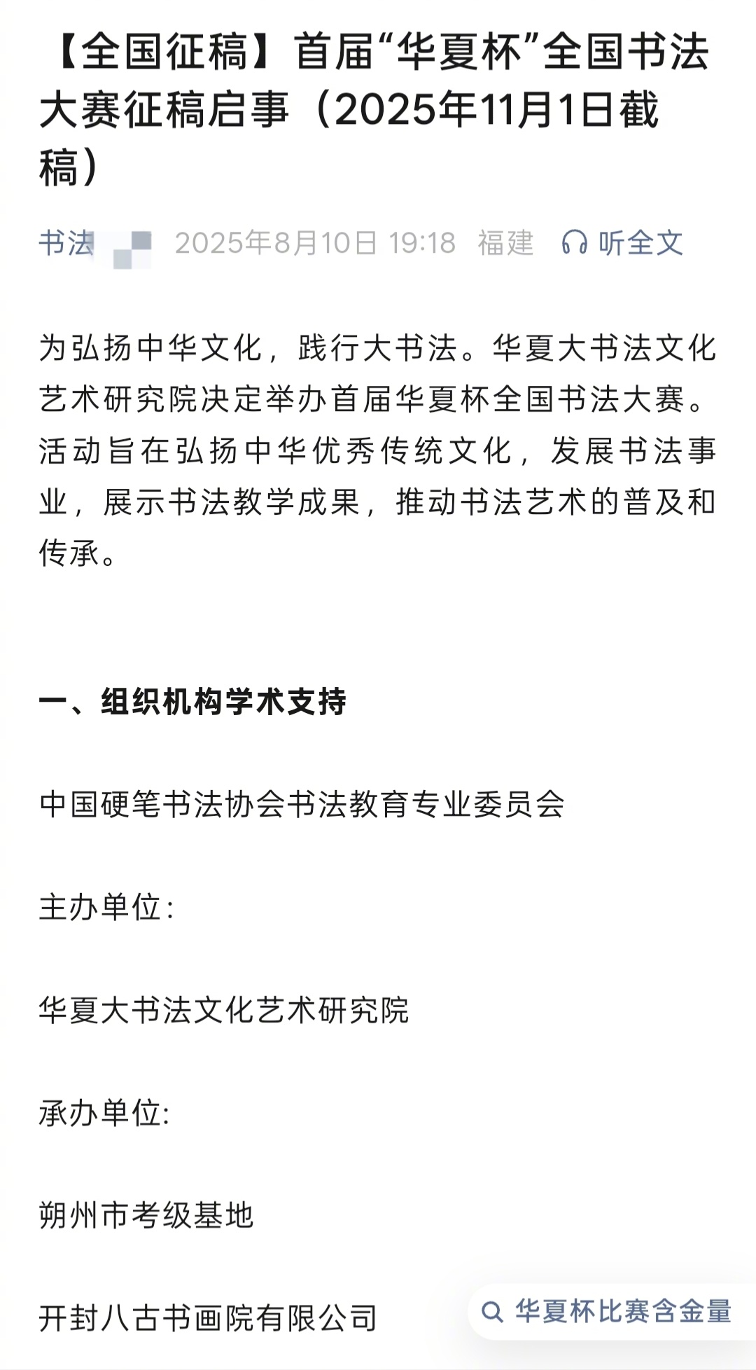 【#书法大赛获奖名单被曝网上复制粘贴人名#】#部门回应书法大赛获奖者名单造假# 连日来,有网民发帖反映,一个名为首届“华夏杯”全国书法大赛的赛事公布的获奖名单竟然是网上复制粘贴的人名,引发关注。对此,12月4日,主办方回应大皖新闻记者称,合伙人已“跑路”,正在退款。有关部门则表示,属地政府已介入处置。书法大赛被曝造假,获奖名单竟是网上复制粘贴网民发布的帖子内容显示,该比赛设置了成人组特、一、二、三等奖以及学生组特等奖、金奖等奖项,并公布了获奖名单。但是这些获奖者姓名却与某文库2022年发布的《10000中国普通人名大全》和某中学公布的上世纪90年代学生花名册重合,引发热议。在评论区,网民纷纷留言,认为此举有造假、骗钱之嫌。大皖新闻记者注意到,今年8月,有多个书法相关的账号发布了首届“华夏杯”全国书法大赛征稿启事,提到该赛事主办单位为华夏大书法文化艺术研究院,承办单位为朔州市考级基地和开封八古书画院有限公司,组织机构学术支持为中国硬笔书法协会书法教育专业委员会。征稿对象为全国各界成人、学生、广大书法爱好者等,征稿日期为2025年8月1日至11月1日。启事中还称,此次大赛每幅作品收取通联费用30元(包含邮寄费,证书费),统一添加作品收件人微信缴纳。比赛成人组设有一、二、三等奖及优秀奖,奖金从200元至1000元不等。学生组设有特、一、二、三等奖及优秀奖,同样有奖金,获奖者有望获得中国硬笔书法协会入会资格。最终将由华夏大书法文化艺术研究院邀请全国知名书法家共同组成评审委员会评审。启事中公开的收稿地址为河南省开封市顺河回族区华夏大书法文化艺术研究院,收件人为袁某。另一个书法类账号发布的征稿启事则显示,该比赛承办单位还有秦皇岛市海港区硬笔书法协会,成人组还设置了特等奖,截稿时间变为了11月18日,但收稿地址和收件人未变。记者搜索发现,该赛事公开的一些获奖名单确实与网上发布的《10000中国普通人名大全》和广州某中学公布的上世纪90年代学生花名册重合。主办方回应:合伙人跑路,正在退款记者查询发现,与“华夏大书法文化艺术研究院”相关的公开信息较少,企查查平台信息同样显示,无直接用此名的机构,只有华夏大书法(厦门)文化艺术研究院(有限合伙),成立于2025年7月,执行事务合伙人正是征稿启事中的联系人袁某。已于10月27日被厦门市湖里区市场监管局列入经营异常,原因是“通过登记的住所或者经营场所无法联系的”。而承办单位开封八古书画院有限公司同样成立于2025年7月,法定代表人也是袁某。经营范围包括,文艺创作;工艺美术品及礼仪用品销售(象牙及其制品除外);组织文化艺术交流活动等。12月4日,大皖新闻记者多次拨打了征稿启事所留的袁某电话,但一直无人接听。随后,记者联系上了主办方另一名工作人员,其称,此次比赛是袁某和另外一人合伙举办,但这名合伙人已拿钱“跑路”,如今袁某正在退款,已经快退完了。对于为何会出现获奖名单与网上信息重合的情况,该工作人员表示,其并不清楚,目前袁某不在,因为合伙人“跑路”,位于开封的办公地点也“快不干了”。部门回应:属地政府已介入处置随后,针对此事,大皖新闻记者联系了开封市顺河回族区市场监管局,工作人员回应称,他们已12月3日接到了参赛者的情况反映,接下来将去核实了解具体情况。开封市市场监管局工作人员则表示,如果参赛者要反映情况,可以向开封市12315消费者投诉热线投诉,届时会由属地市场监管部门处理。开封市12315消费者投诉热线工作人员向记者介绍,目前他们尚未接到与此相关的投诉。顺河回族区委有关部门工作人员也告诉记者,将去了解具体情况。对此,大皖新闻记者又联系了厦门市湖里区市场监管局,工作人员建议记者向厦门市市场监管局了解详情。厦门市市场监管局工作人员回应记者称,经了解,可能涉及的职能部门较多,目前此事已转给湖里区政府在处置。(大皖新闻记者 韩喻)网页链接