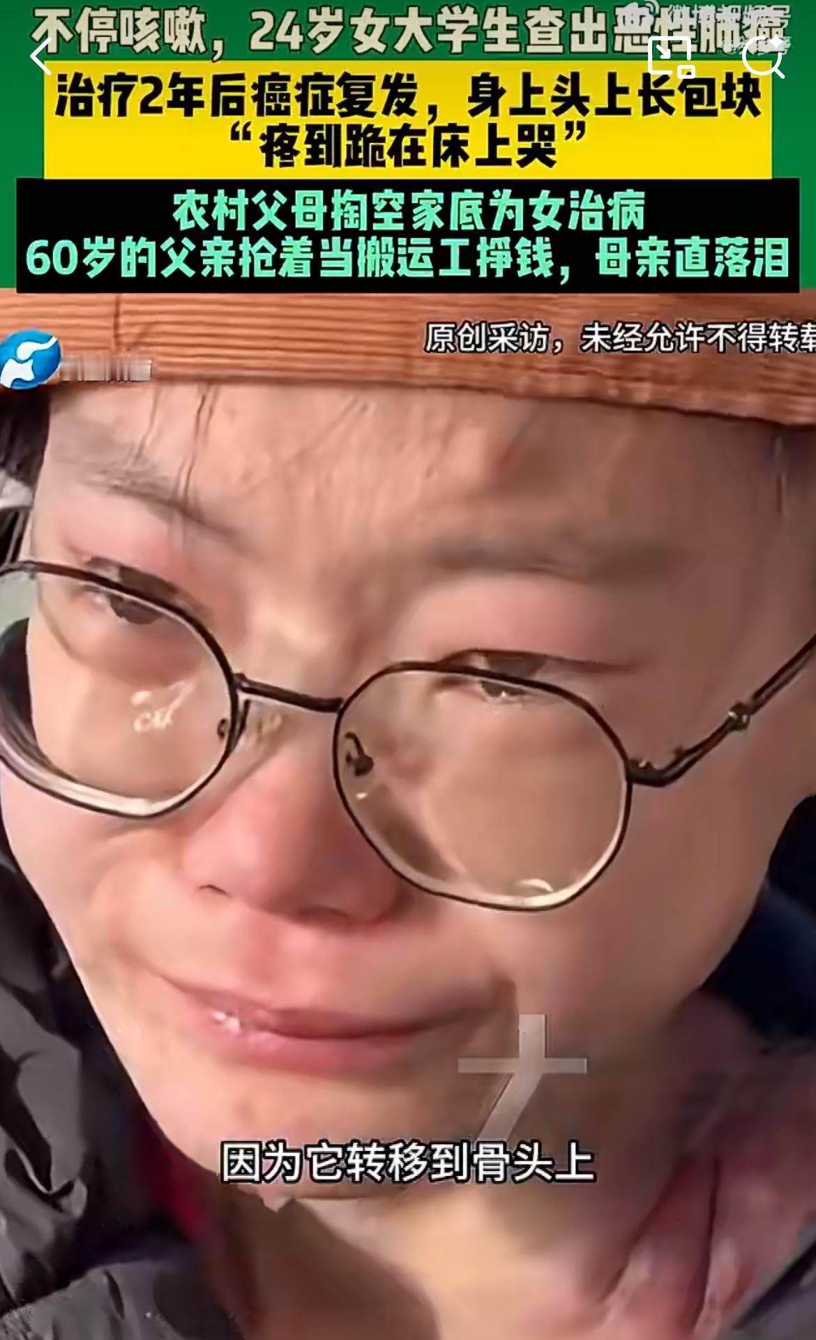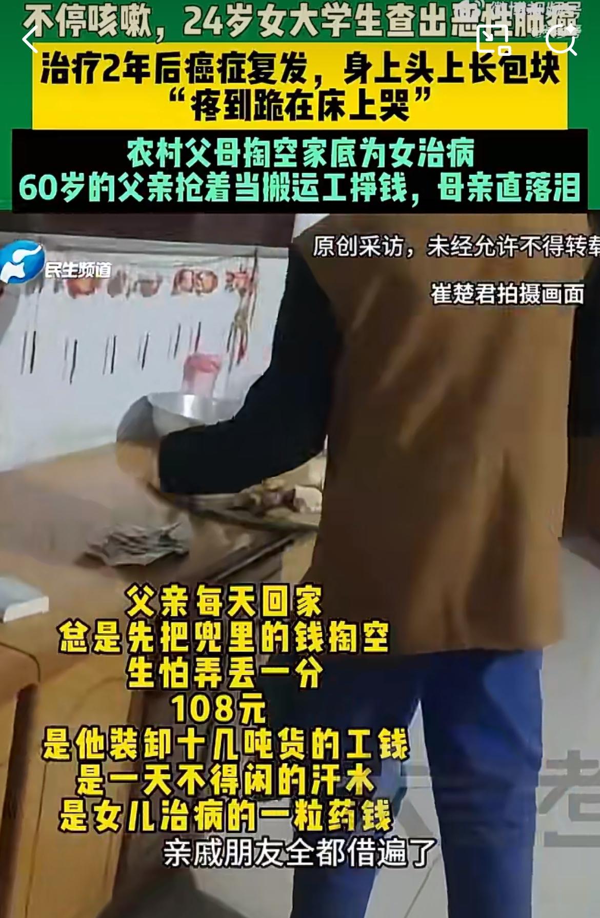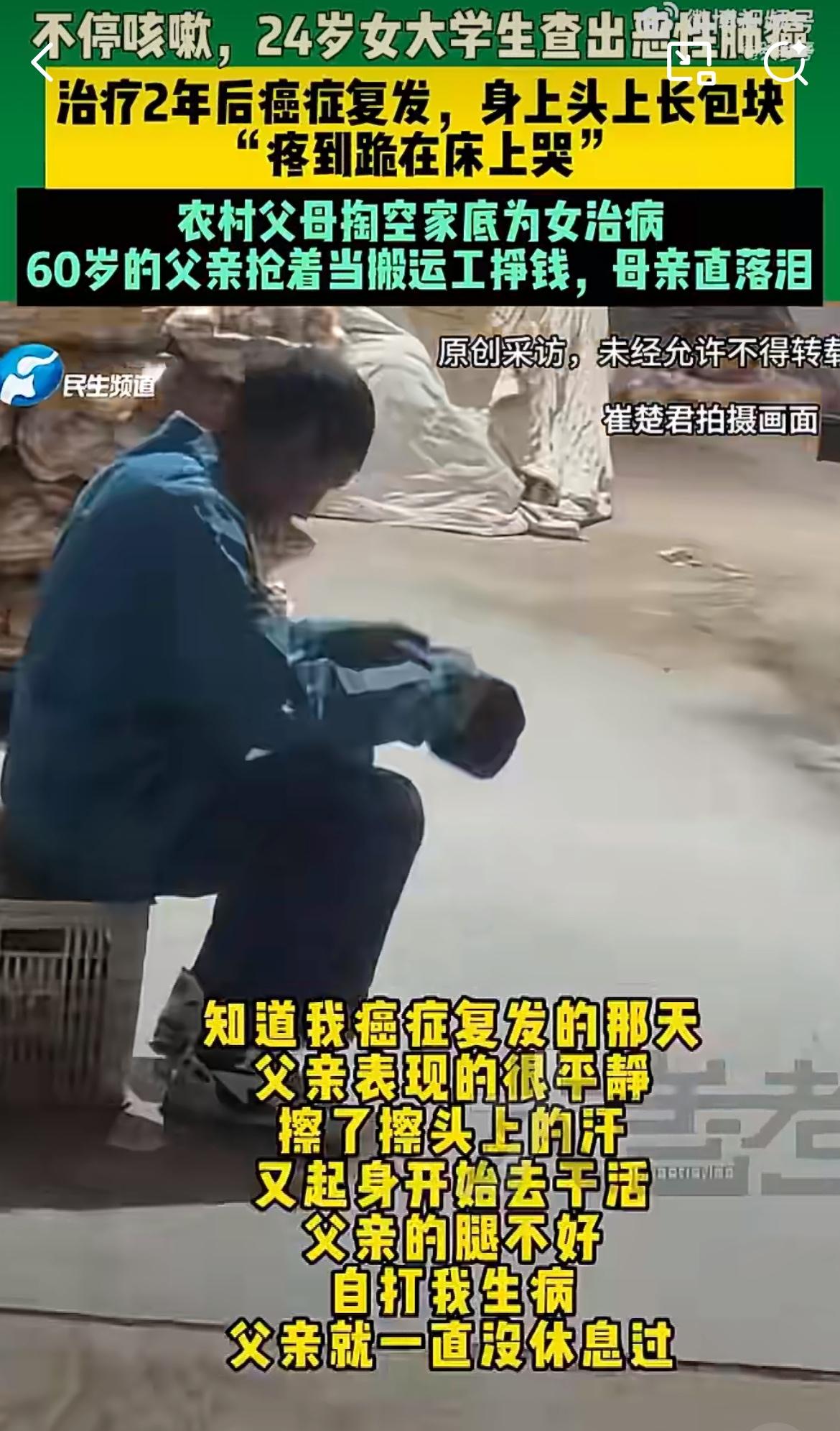 河南焦作这个24岁女孩太惨了,得了肺癌晚期,60岁的父亲做搬运工筹医药费。年纪轻轻,没有不良生活习惯,莫名持续咳嗽查出恶性肺癌,治疗两年债台高筑,却还是抑制不住癌细胞扩散。身体疼痛难受,父母想让她活下去,可是这样的病很难治,花钱却是无底洞。