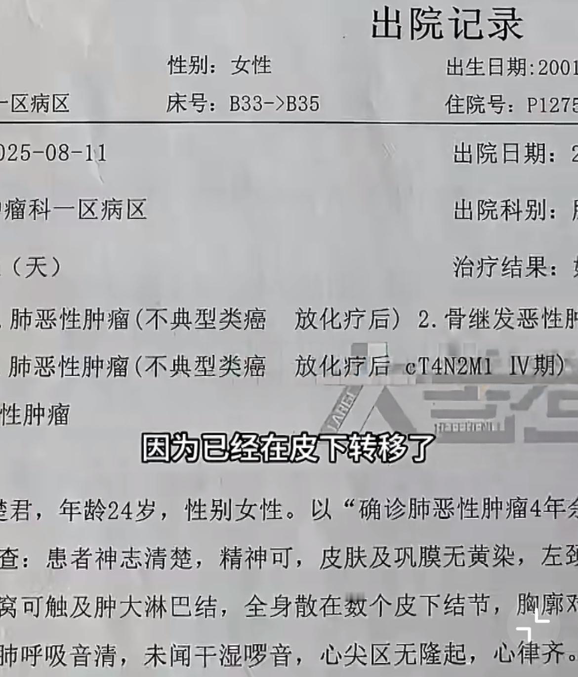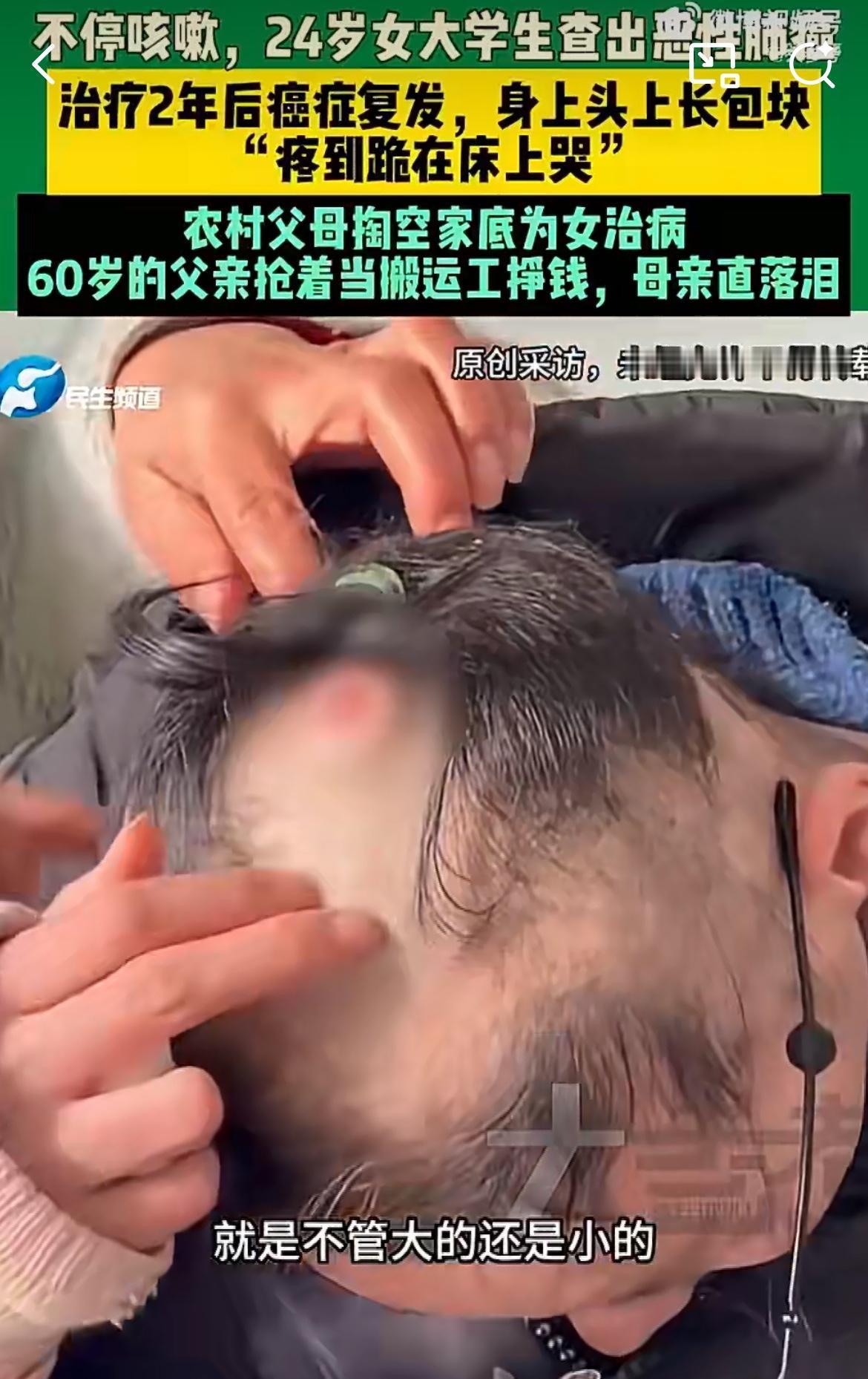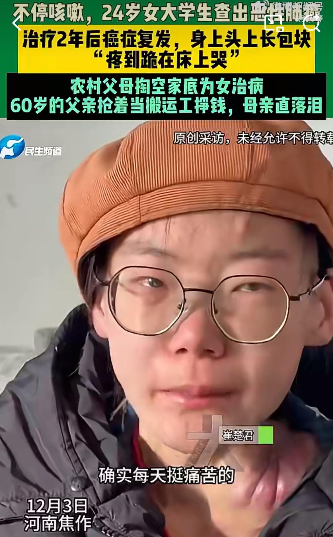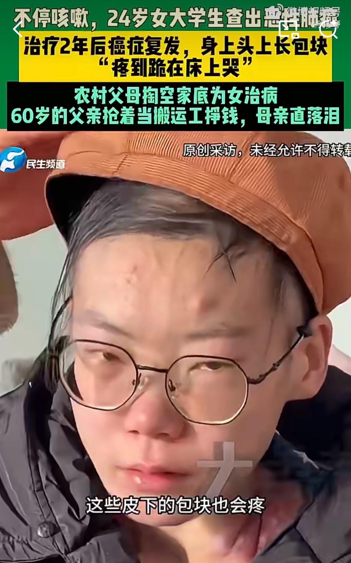 河南焦作这个24岁女孩太惨了,得了肺癌晚期,60岁的父亲做搬运工筹医药费。年纪轻轻,没有不良生活习惯,莫名持续咳嗽查出恶性肺癌,治疗两年债台高筑,却还是抑制不住癌细胞扩散。身体疼痛难受,父母想让她活下去,可是这样的病很难治,花钱却是无底洞。