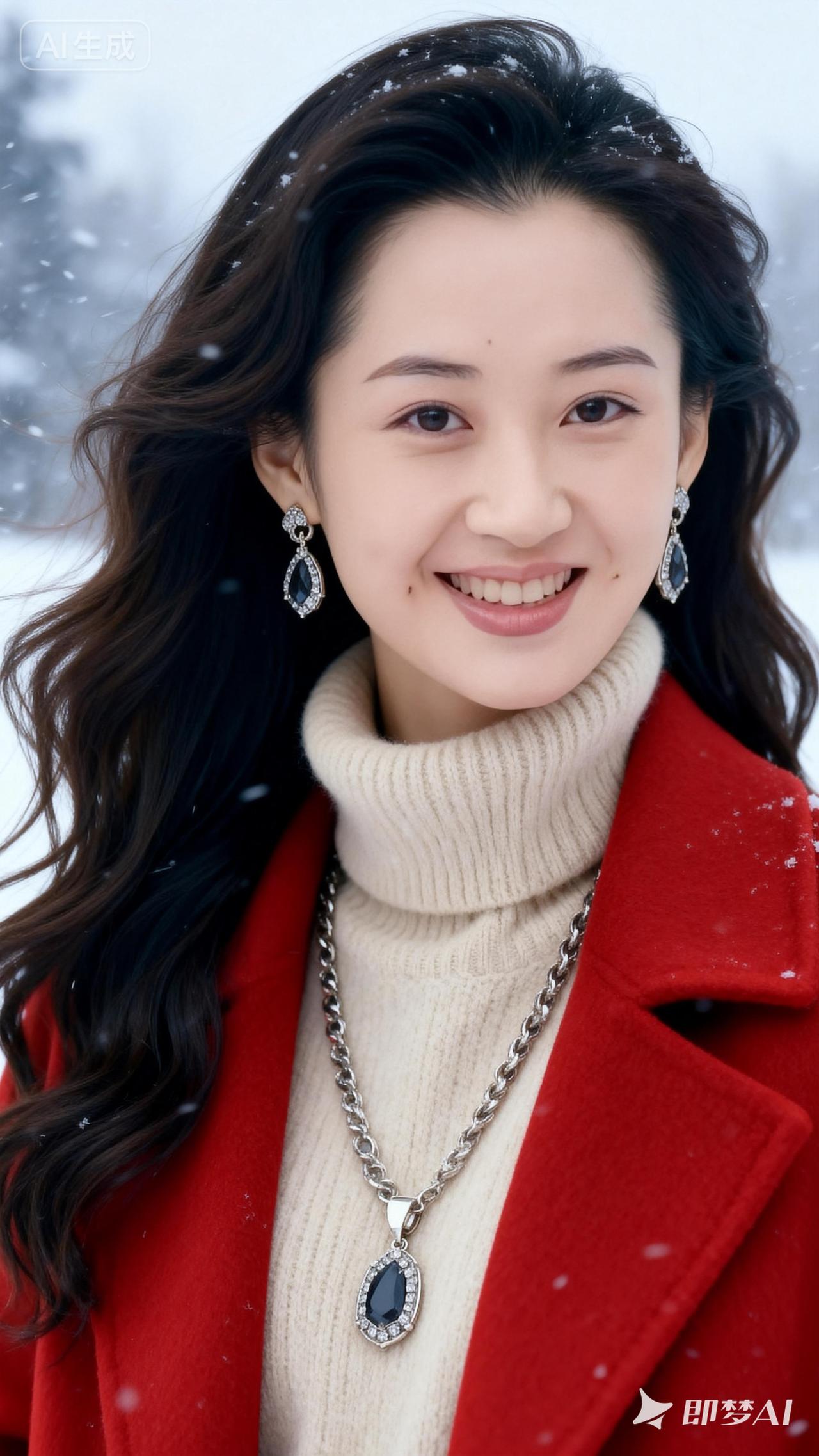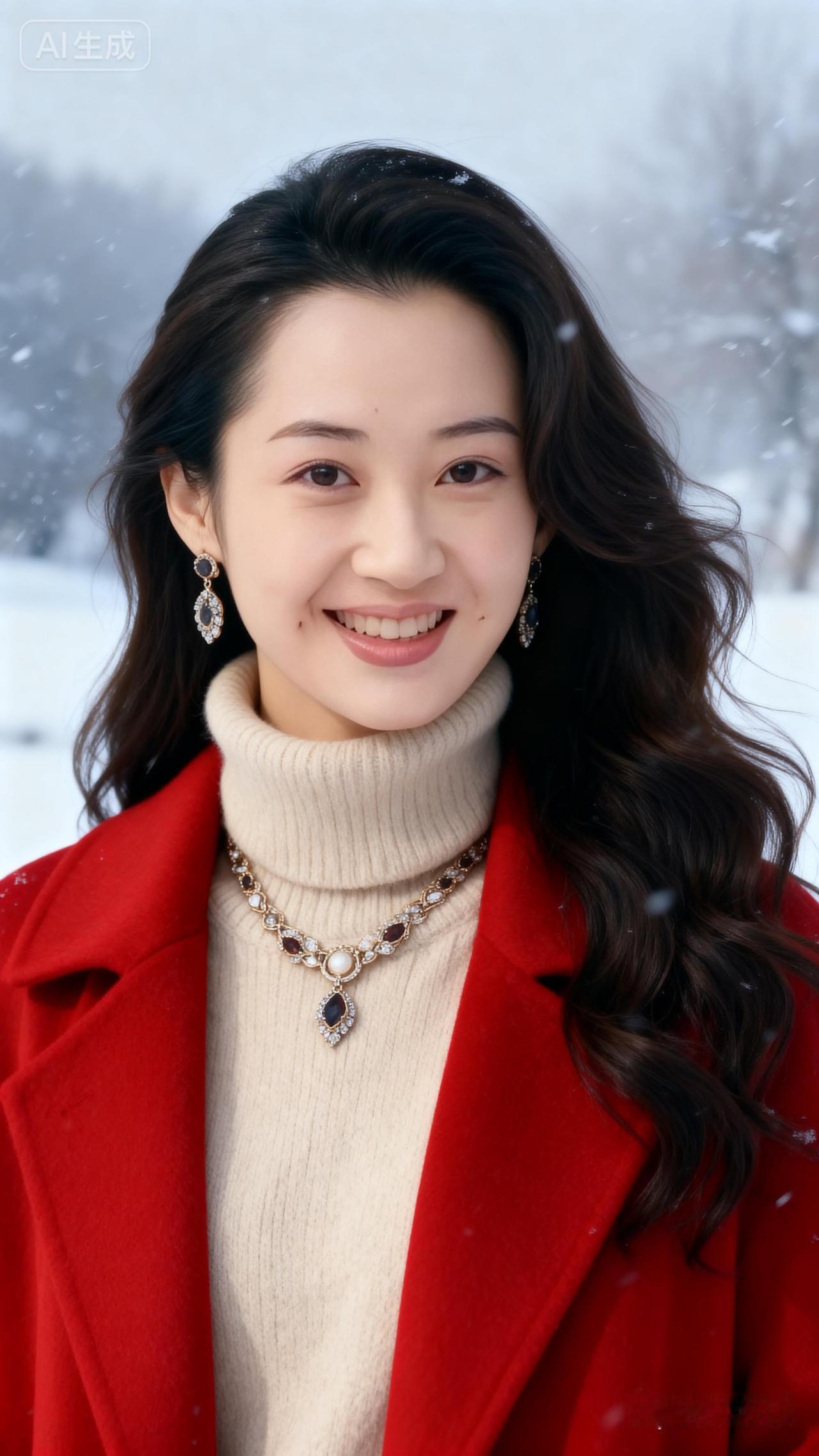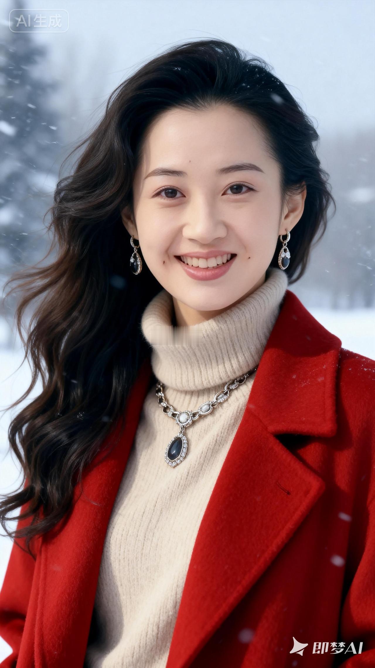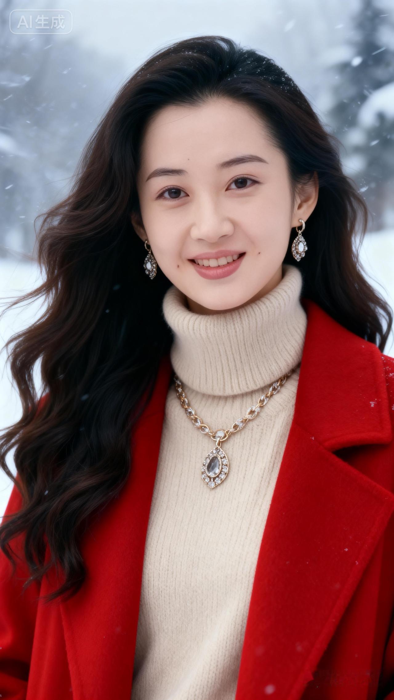 冬日暖阳下的红衣少女,雪中漫步,甜美笑容