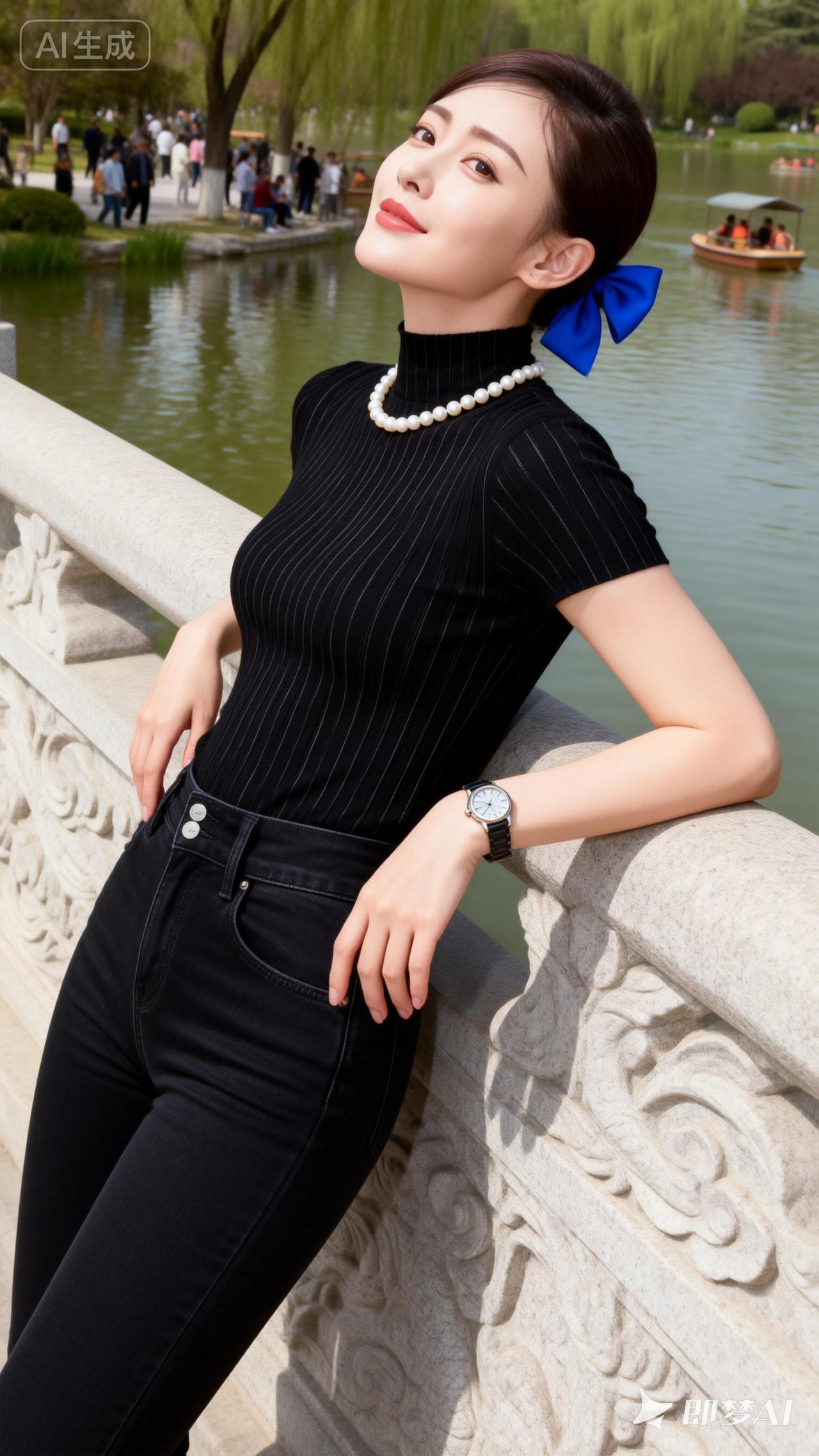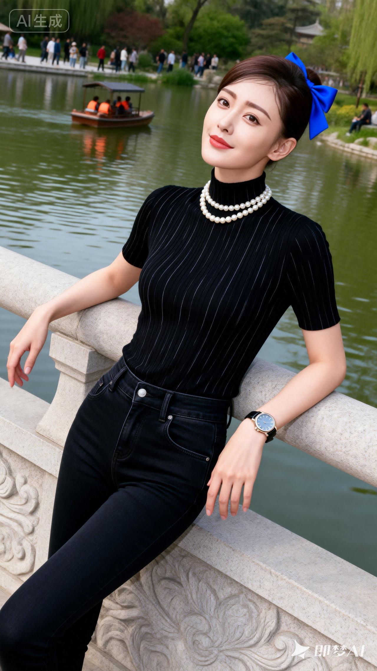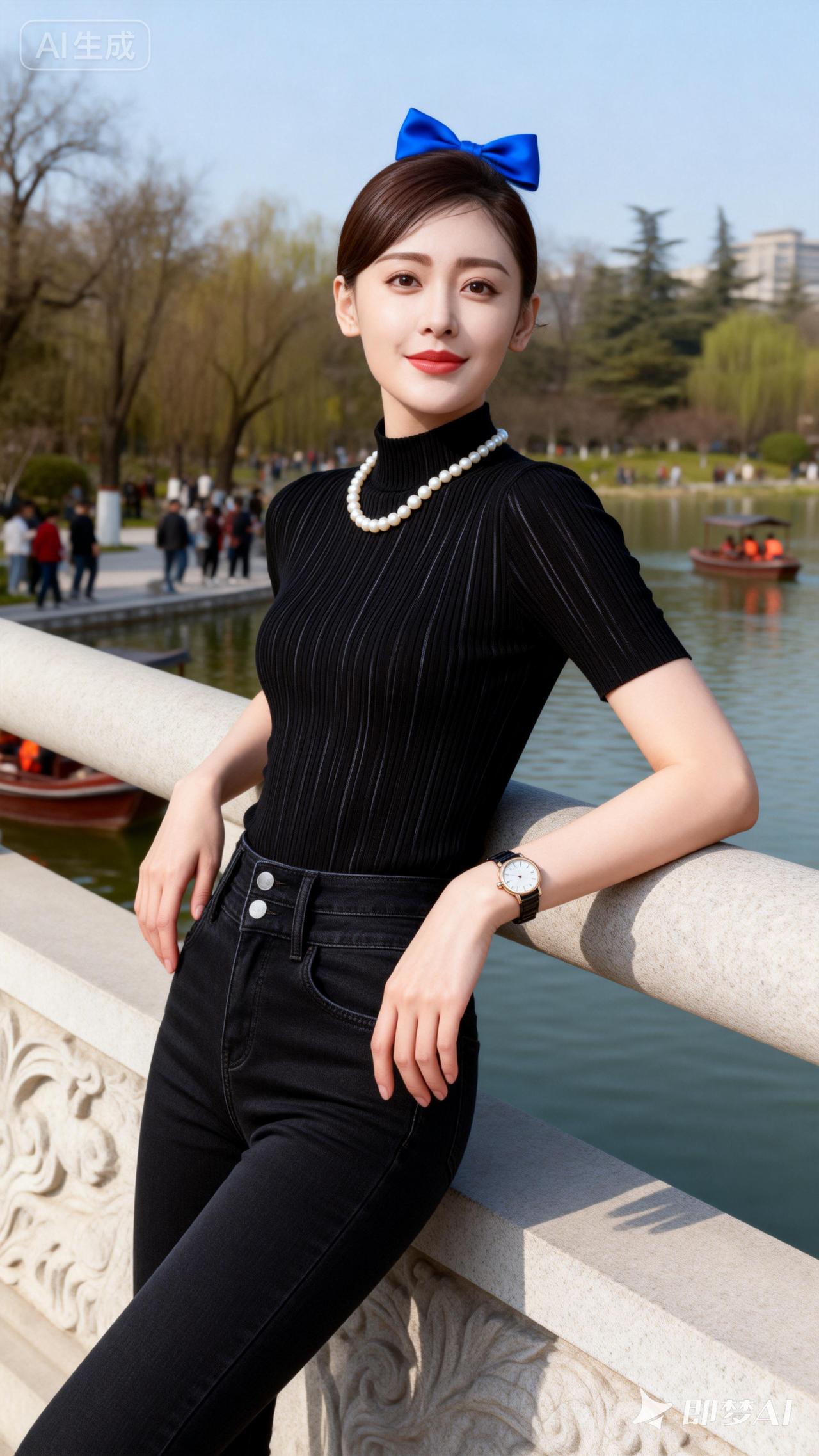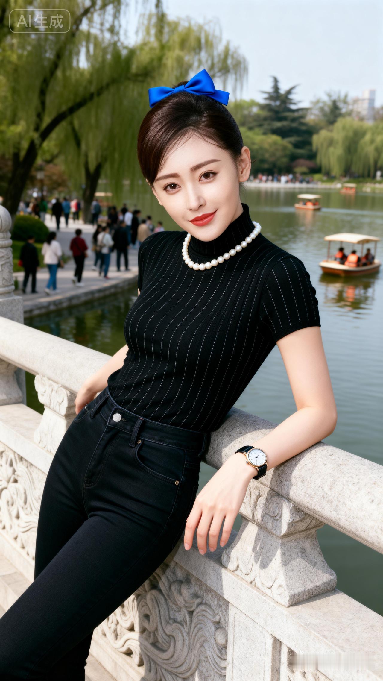 蓝丝带映碧水,笑颜如花绽。