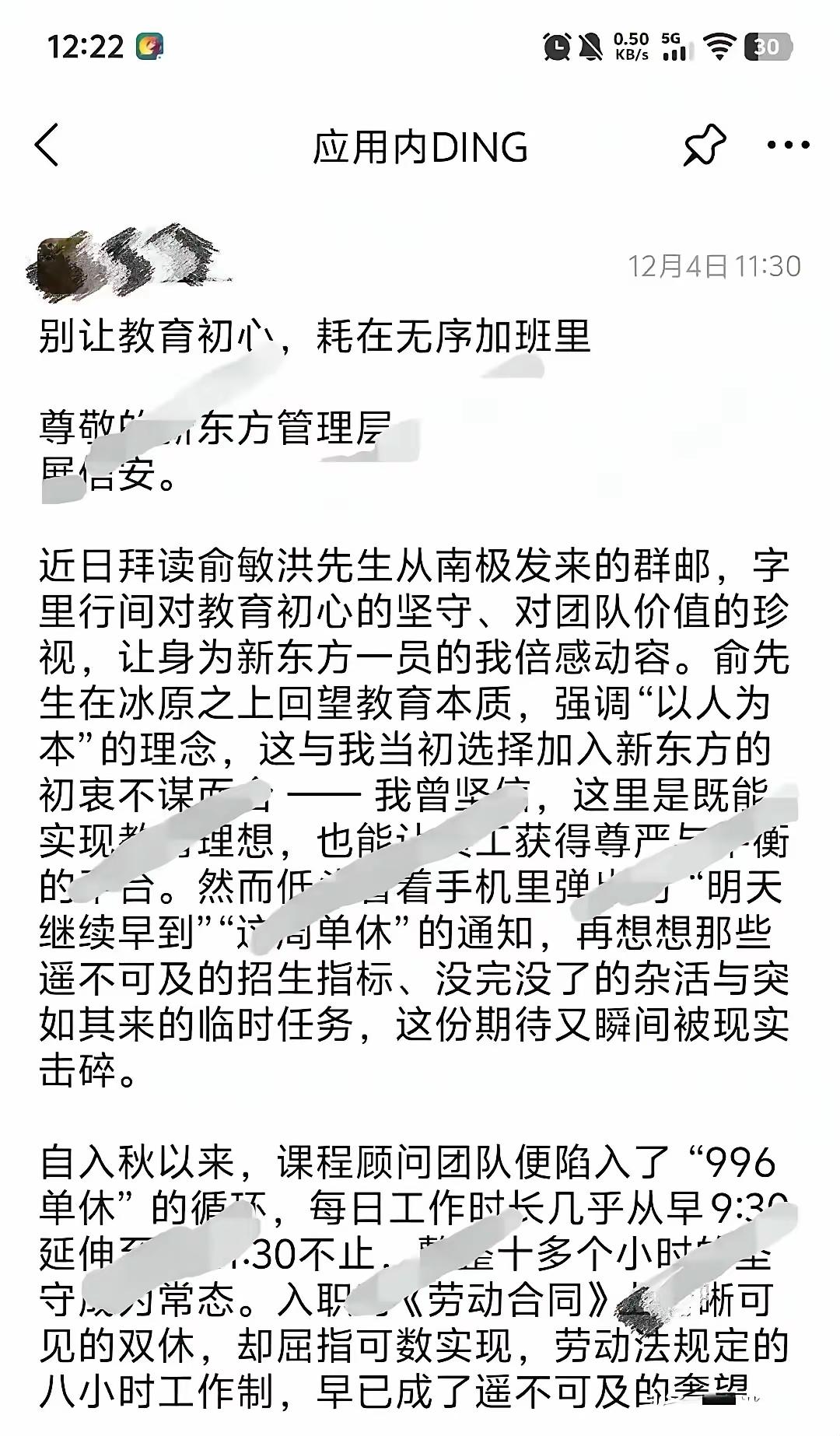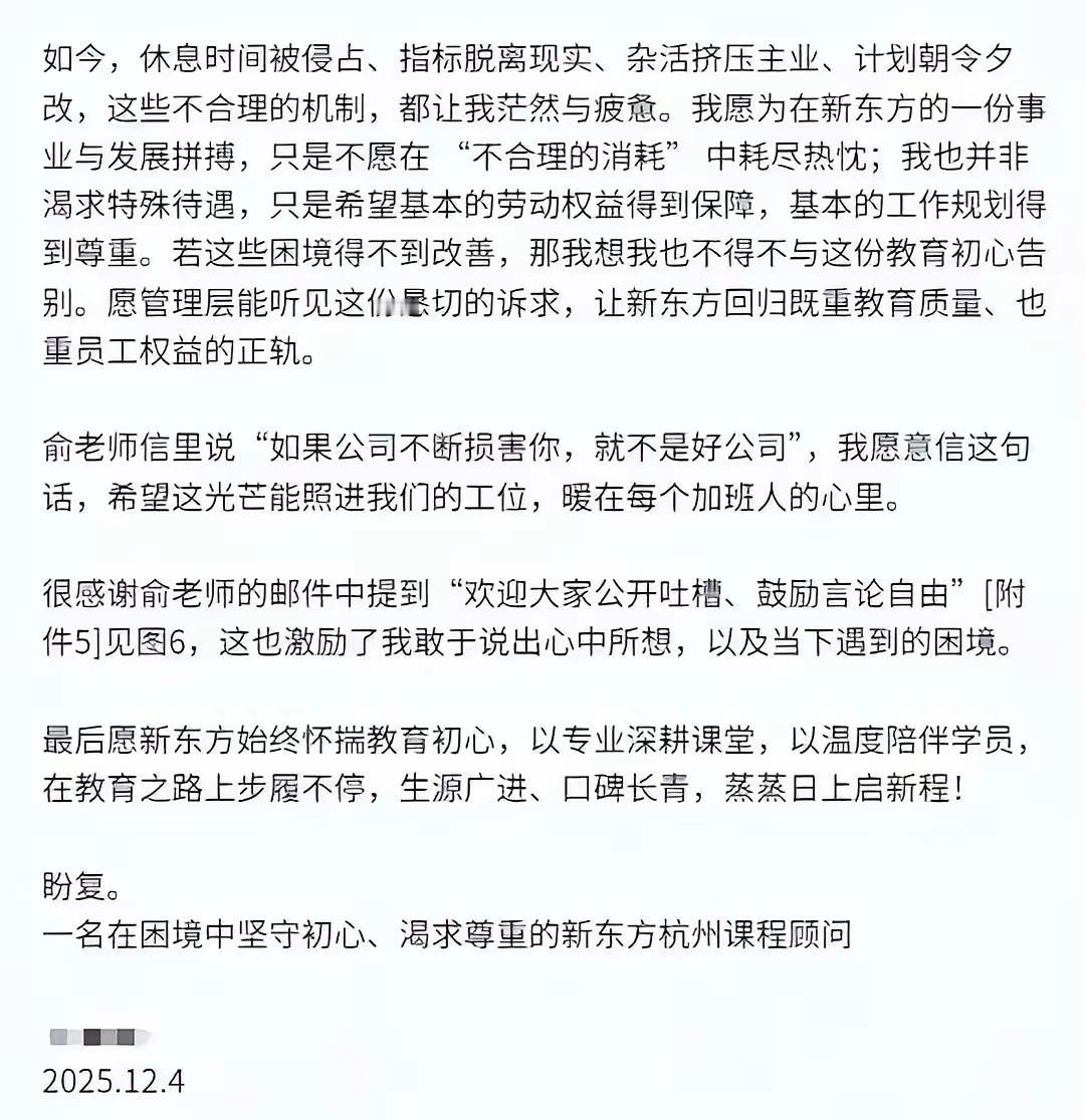 泰山归来不看岳,南极归来一地雪。 俞老师刚从南极发完诗意群邮,杭州新东方员工就甩出一封“血泪控诉信”,直接把他钉上了打工人的热搜榜。 说好的双休?现在一周休半天都算恩赐。 说好的8小时工作制?如今早9晚9,周末轮岗,活儿永远干不完。 考核指标高到离谱,KPI像雪片一样砸脸——原来“南极归来一地雪”,不是风景,是压垮打工人的一地加班单! 员工在全员信里第一句就扎心:“拜读俞敏洪先生从南极发来的群邮后……” ——话没说完,心已凉透。你在极地看极光,我在工位看打卡倒计时;你写诗谈理想,我写周报求生存。 想当年,俞老师一句“在绝望中寻找希望”激励了多少人。可如今,当理想主义照进KPI现实,剩下的只有CPU干烧、眼泪流干、尊严被考核表反复摩擦。 新东方转型不易,教育行业寒冬难捱,我们理解。但别用“奋斗”包装压榨,别拿“情怀”当降本增效的遮羞布。 员工不是永动机,热血会冷,人心会散。 俞老师,下次出差前,能不能先看看杭州办公室的灯,是不是又亮到了凌晨一点? 你说,这班还值得上吗? 新东方 俞敏洪 职场真相 996 打工人日常 内耗 双休变单休 南极归来一地雪