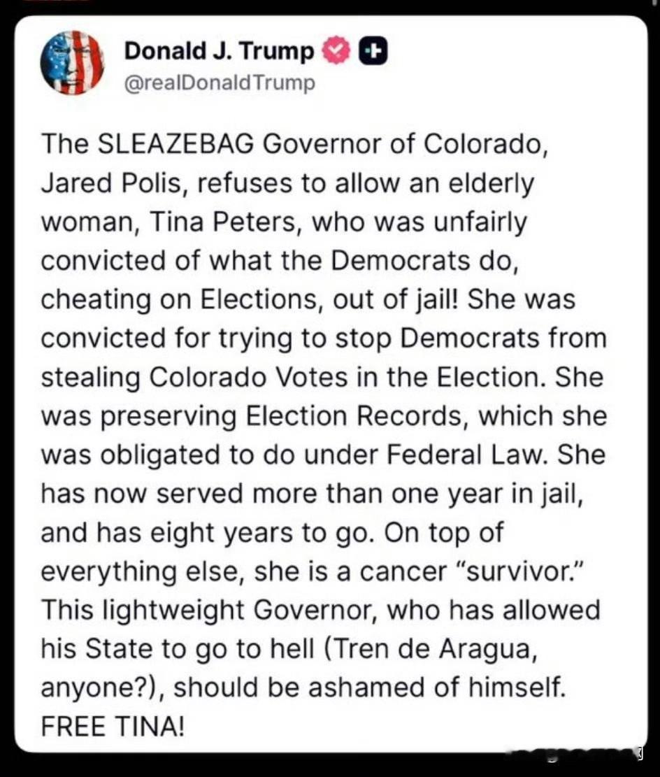 唐纳德.J.特朗普 @realDonaldTrump 科罗拉多州的流氓州长贾里德·波利斯(Jared Polis)拒绝释放一位名叫蒂娜·彼得斯(Tina Peters)的年长女性。蒂娜被不公正地定罪,罪名是民主党人在选举中作弊。她之所以被判有罪,是因为她试图阻止民主党人窃取科罗拉多的选票。她本有义务保存选举记录,这是联邦法律所规定的。如今,她已经在监狱中服刑超过一年,还有八年时间要服完。除此之外,她还是癌症"幸存者"。这位轻浮的州长竟然放任自己的州陷入混乱(有谁还记得特伦德·阿拉瓜【Tren de Aragua】事件吗?),他应该为自己感到羞愧。 释放蒂娜!