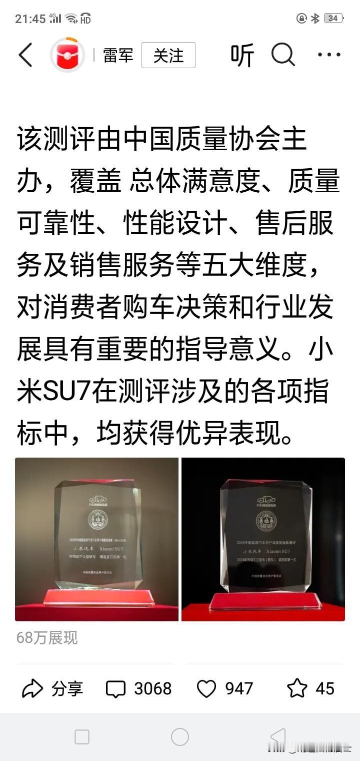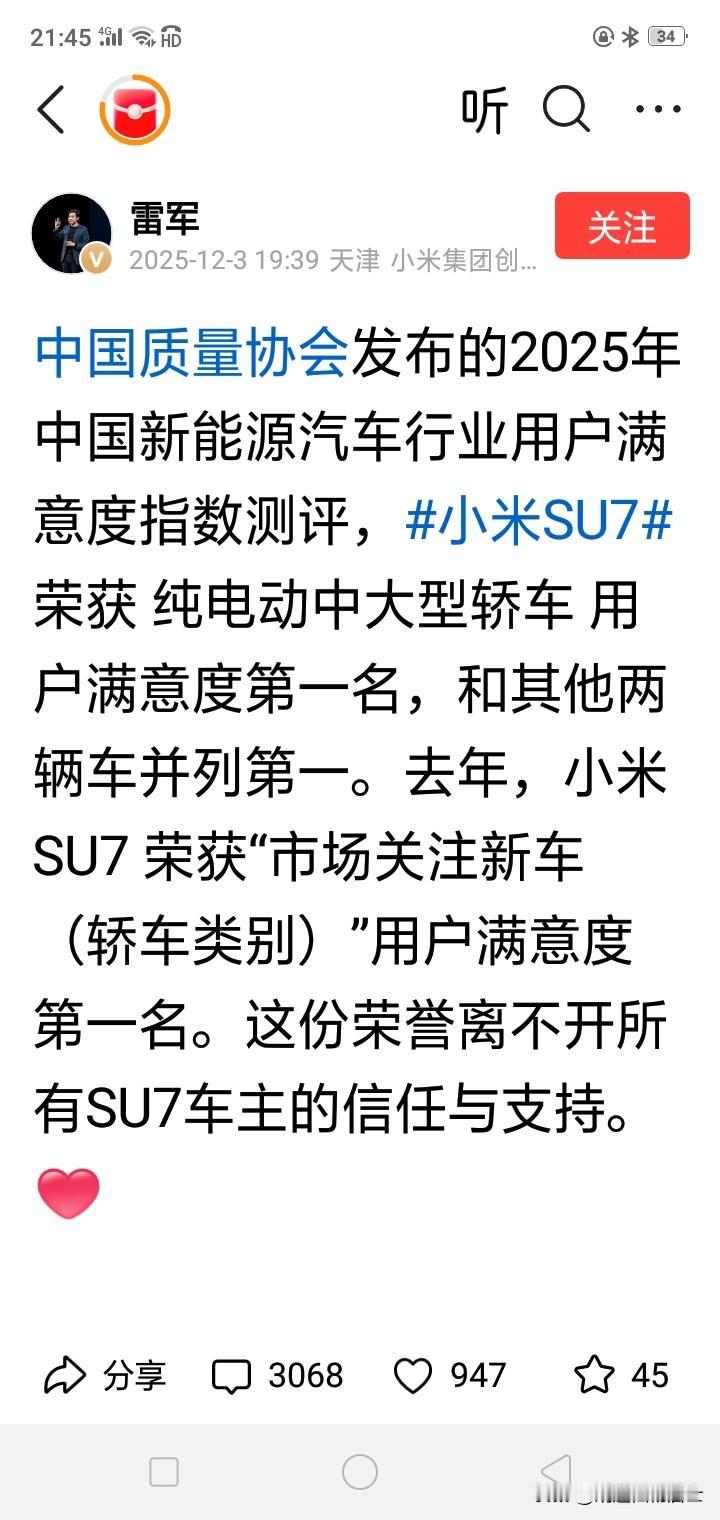 热烈祝贺小米SU7荣获中国质量协会颁发的2025年中国新能源汽车行业用户满意度指数纯电动中大型轿车满意度并列第一名的光荣称号! 这是小米汽车SU7继去年荣获中国质量协会颁发的2024年市场关注新车(轿车)满意度第一名荣誉之后,再次荣获第一名! 这是雷军2025年12月3日19:39分在今日头条上发布的微头条消息。 我刷到消息后又Al了一下中国质量协会这个单位,发现这是一家成立于1979年8月31日的非营利性社会组织,已经有46年多的光荣历史了。 雷军是2018年2月经中国质量协会理事会选举,正式担任该协会副会长至今的。 中国质协现任会长贾福兴,副会长包括驻会副会长段永刚、王琳、李高帅,以及陈士林、高立刚、贺晓柏、黄永章、雷军、杨超群、曾从钦、张浩等。 看着这么多大人物担任会长副会长,这个质量协会颁发的奖牌,一定都是大字没有那些小字了吧。su7小米汽车 小米SU7