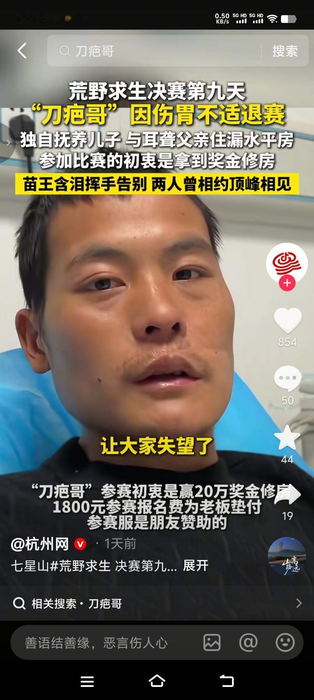 如果没说错的话,荒野求生已经变味了,大部分选手不是来求生的,而是奔着来造星的。都想趁机抓住这波流量,都想在这档节目中当网红,都想急于流量兑现,都想逆天改命。 网红的尽头就是带货,荒野求生的尽头就是退赛,为什么退赛?因为急于开直播,否则流量没了就等于错失了一次人生逆袭的机会。 刀疤哥大家最看好的选手,最后也选择了退赛,原因是身体出现了不适。我们无从考证真假,但从12月2号退赛,3号就急于开直播这样的速度来说,好像感觉不太正常。一个就是奔着奖金20万来的山区贫困选手,而且是有备而来,他能轻而易举放弃吗?他能因为一次小小的胃不适退赛吗?如果确实是身体扛不住了,胃口出现了毛病,为什么不在医院住几天,而是第二天便开了直播。所以说网络你永远看不到真相,因为你的眼睛总在背叛你的心。