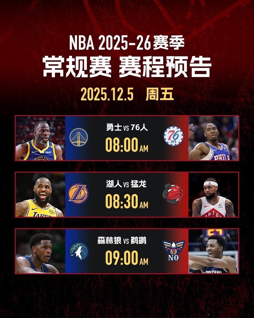 明日NBA将有5场比赛即将打响,数量虽少但多场精彩比赛仍然看点满满。下面一起来看看有哪些焦点赛事吧!勇士vs76人据最新伤病报告显示,勇士这边巴特勒、库明加等5位主力球员目前均受到伤病困扰出战成疑,而领袖库里还将缺席三场。此役客场挑战76人,勇士全队上下都透露出疲惫,局势不容乐观。好消息是梅尔顿即将迎来复出,球队后卫线的火力将得到增强。76人目前排名东部第9,状态也不比勇士强多少。球队核心恩比德已经确定小概率出战,而乔治和格莱姆斯目前仍是出战成疑。好在目前马克西状态火热,托底能力非常强,目前已经多次在关键时刻拯救球队。双方核心球员都缺席或出战成疑,你看好哪队笑到最后呢?湖人vs猛龙今日的早些时候,湖人主教练雷迪克表示:东契奇将因为自己的第二位孩子出生缺席比赛,同时斯玛特也会因伤缺席。此役东契奇缺席,詹姆斯将会担起球队的重任,湖人在进攻方的表现可能会受到影响。猛龙这边,后场核心巴雷特将继续缺席,进攻方面的火力一定会受到影响。但是这支猛龙依旧不可小觑,奎克利、巴恩斯、英格拉姆这三位的前场组合足以让联盟的大多数球队头疼。上一场比赛中,詹姆斯的个人表现十分挣扎,球队大比分输球,你看好他这场比赛反弹吗?森林狼vs鹈鹕鹈鹕这边多位球队核心已经确定伤缺,目前应该是墨菲带队。但不可小觑的是,队内的两位新秀费尔斯与奎因近几场比赛发挥出色。在上一场对阵森林狼比赛中,二人关键时刻屡立奇功,险些掀翻森林狼。与鹈鹕不同,森林狼这边可以说是整装待发,全主力阵容几乎都可出战,健康状态良好。在昨日的比赛中,双方刚刚相遇过,森林狼加时险胜,本场鹈鹕有机会爆冷取胜吗?nba吐槽大会勇士vs76人