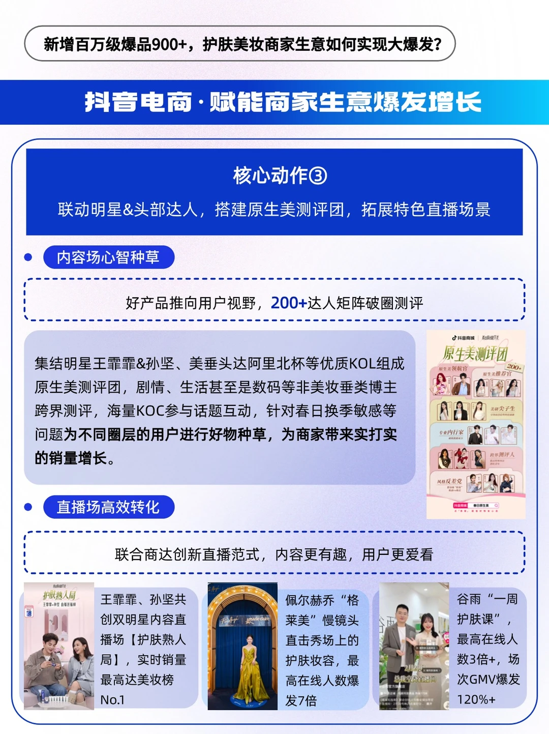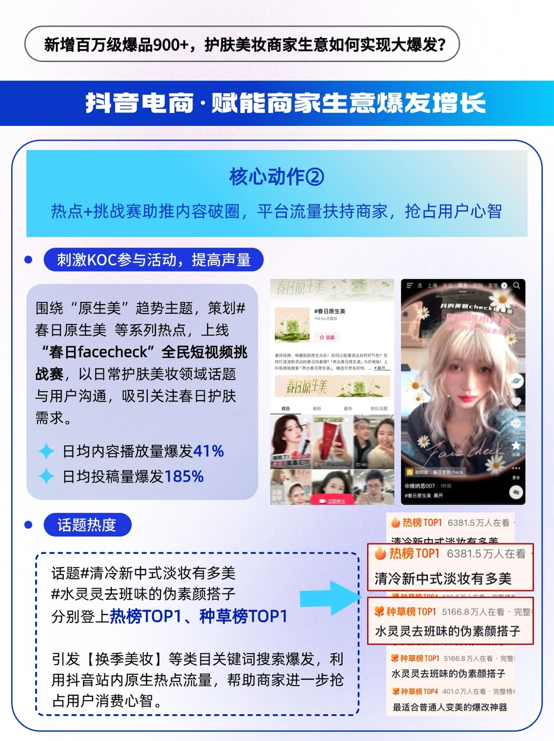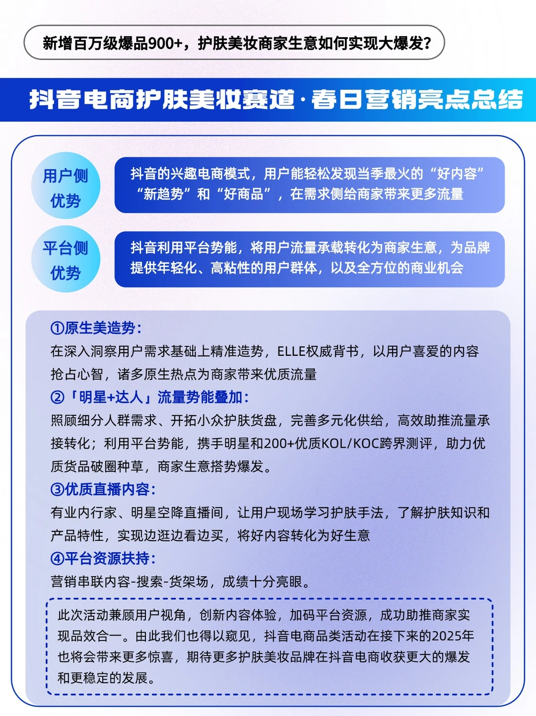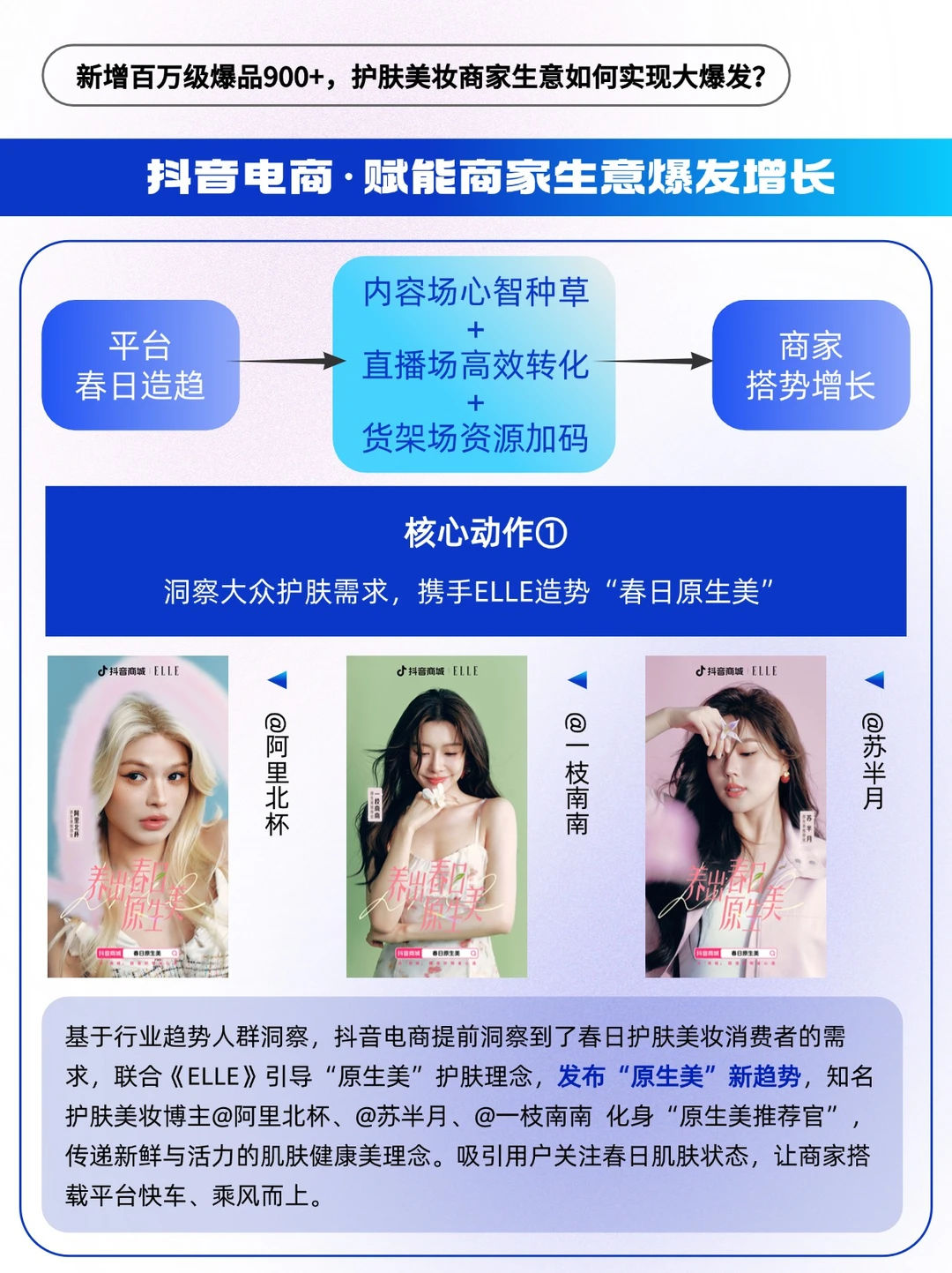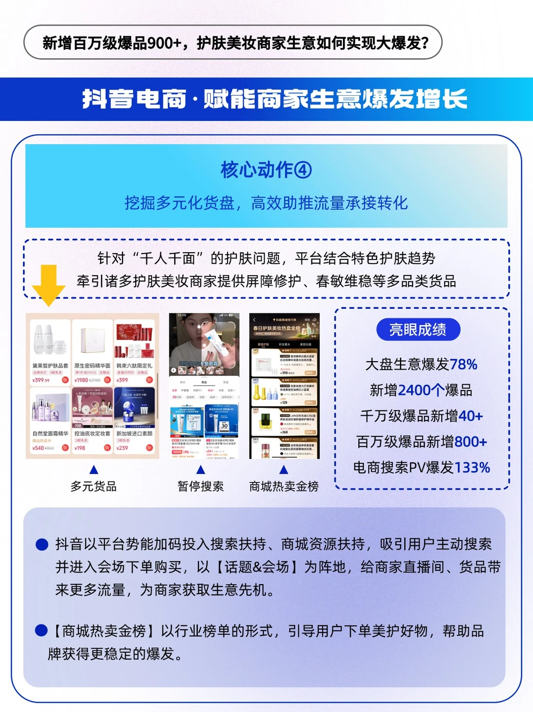🔵平台春日造势,发布趋势好内容,用户层植入心智;加码搜索场、货架场资源扶持,顺利承接转化流量,百万级/千万级爆品频出,满足商家“做生意”和“做品牌”的两大需求,实现“品效合一”。
