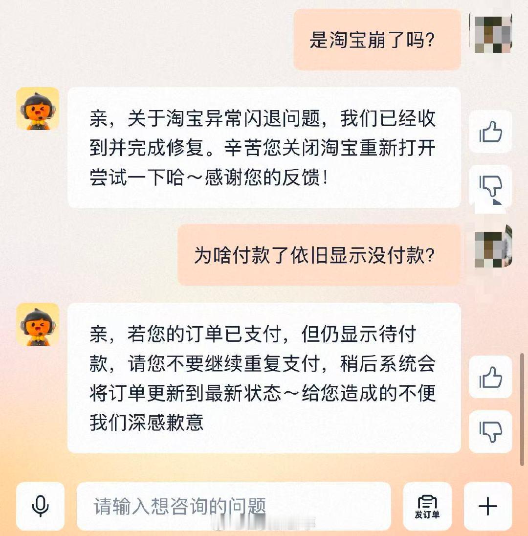 【淘宝回应支付异常】淘宝回应付款了显示待付款12月4日,针对淘宝崩了淘宝客服回应称,“若您的订单已支付,但仍显示待付款,请您不要继续重复支付,稍后系统会将订单更新到最新状态~给您造成的不便我们深感歉意!”