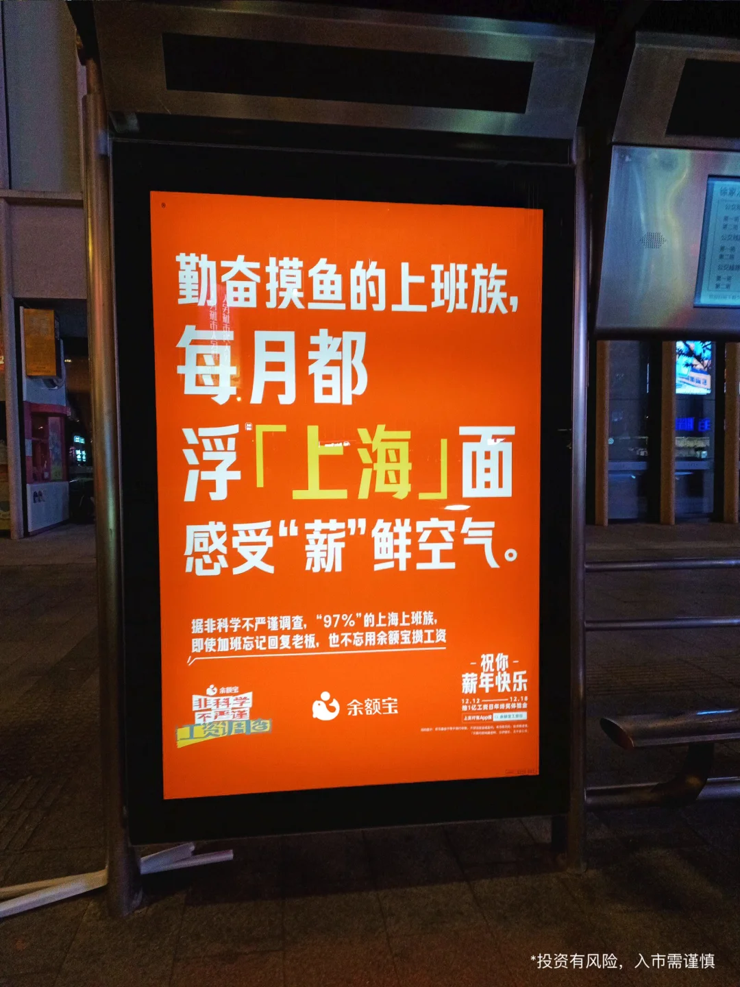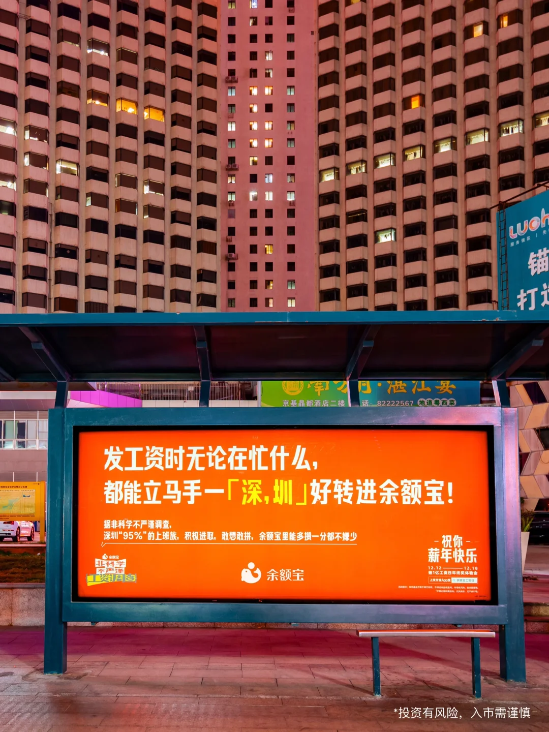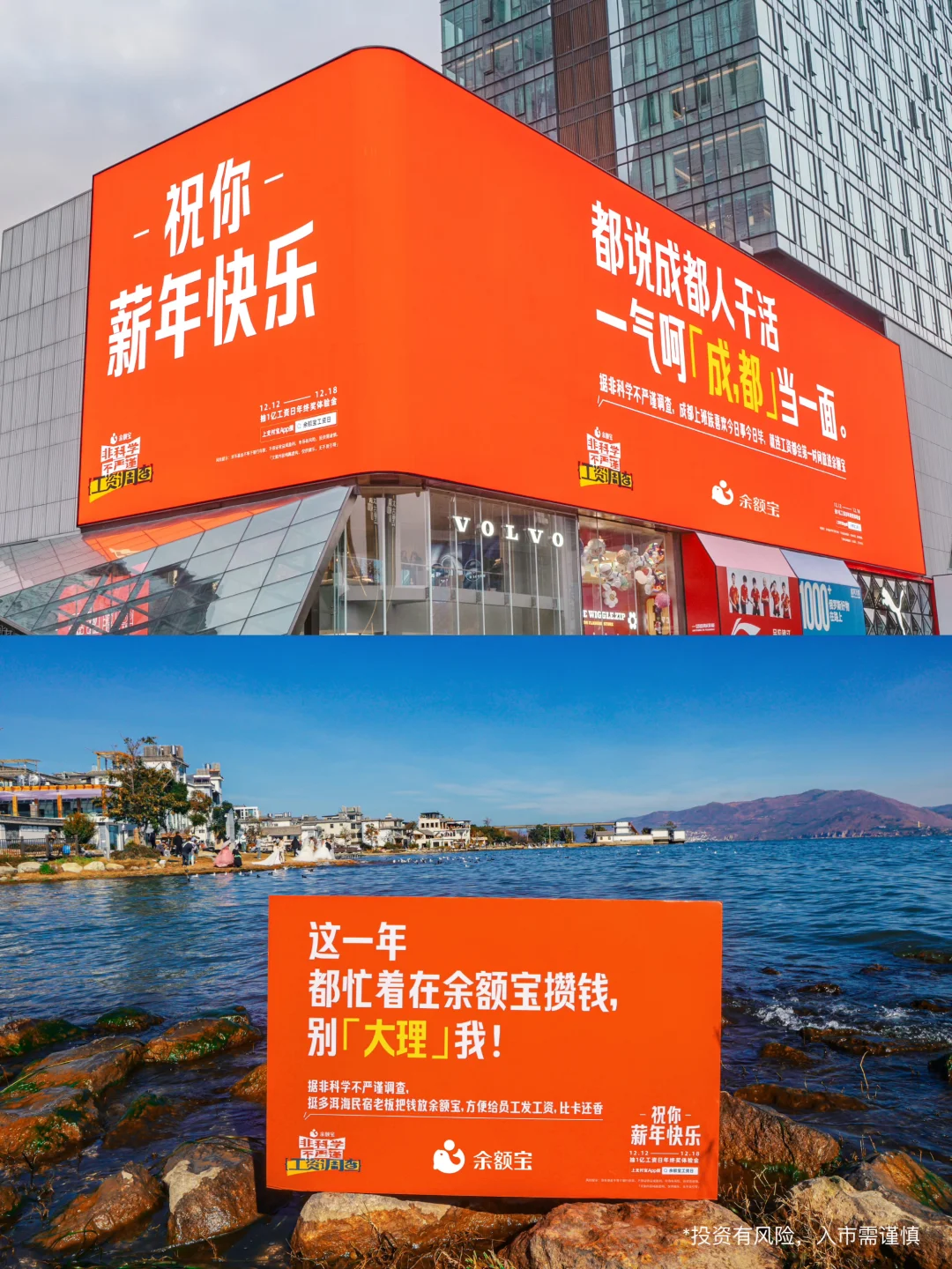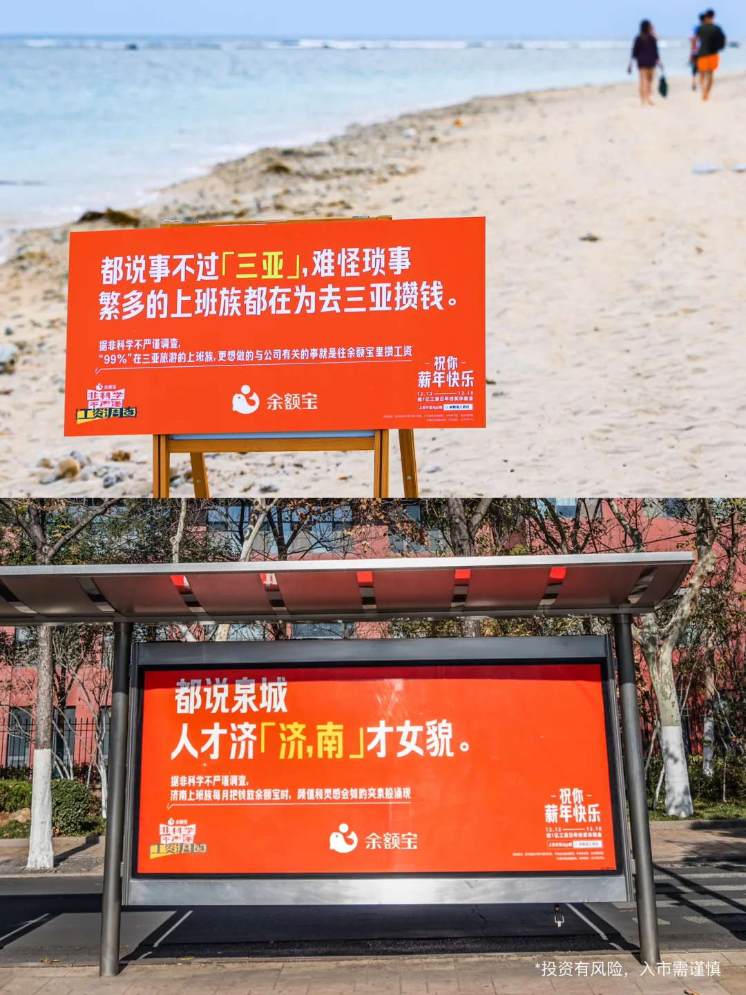 在年底这个特殊时间点,大伙对奖金的期待也比以往更加浓厚,余额宝将城市名称与打工人的情绪丝滑结合,创意策略再次让人眼前一亮。🫡延续了以往的嘴替风格,同时也把“工资一发就放余额宝,收益总比工资卡香”的品牌核心心智带出,再次加深了用户印象。