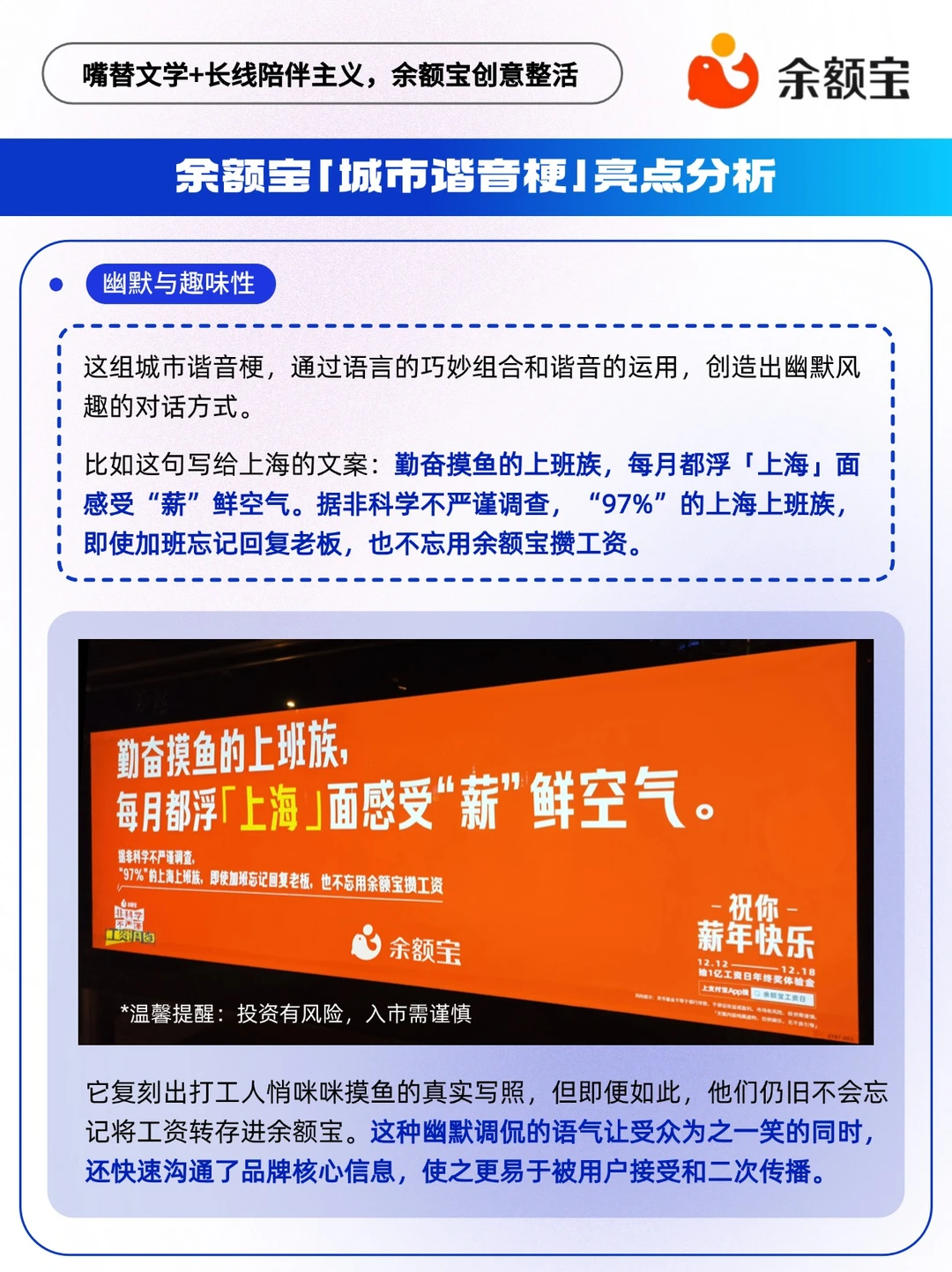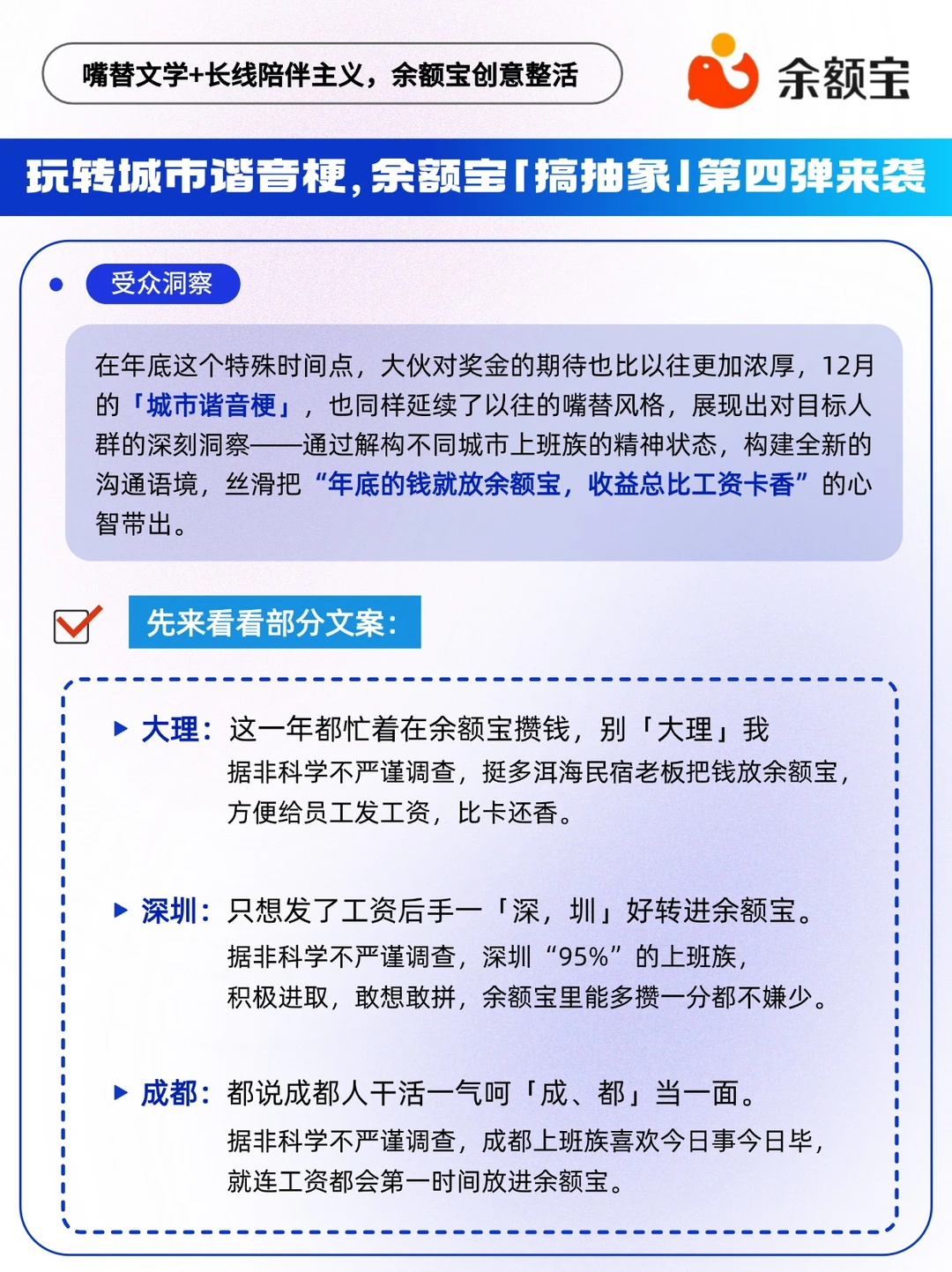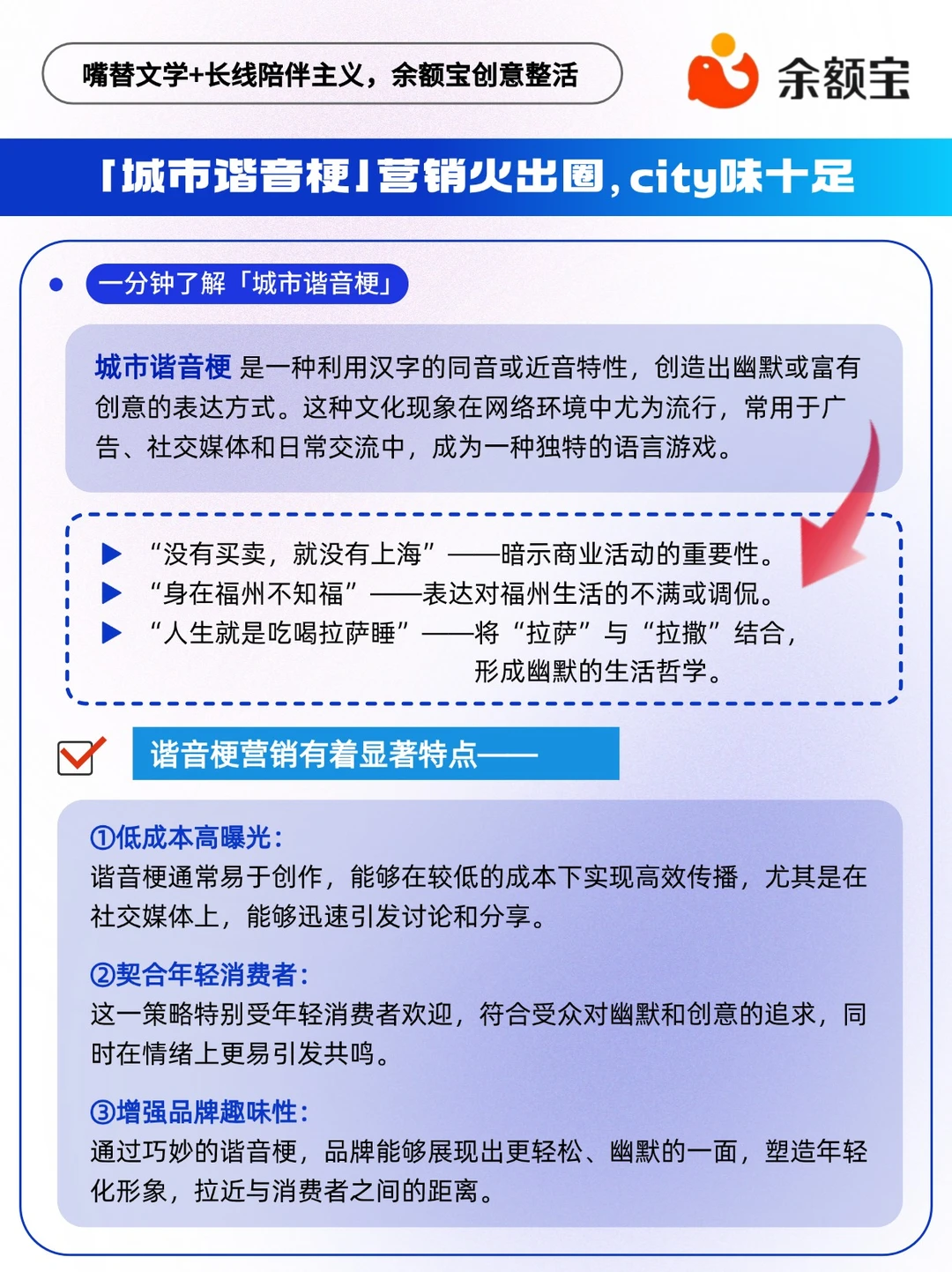 我们来聊聊余额宝这波城市谐音梗的创意表达与营销亮点。