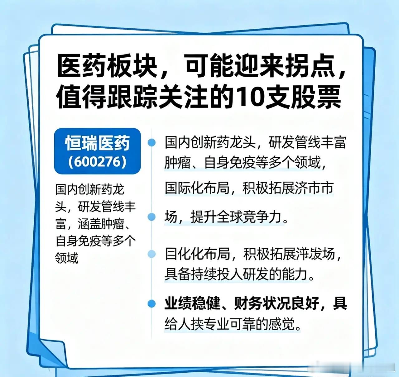 医药板块,可能迎来拐点,值得跟踪关注的10支股票,具体分析如下:1.恒瑞医药(