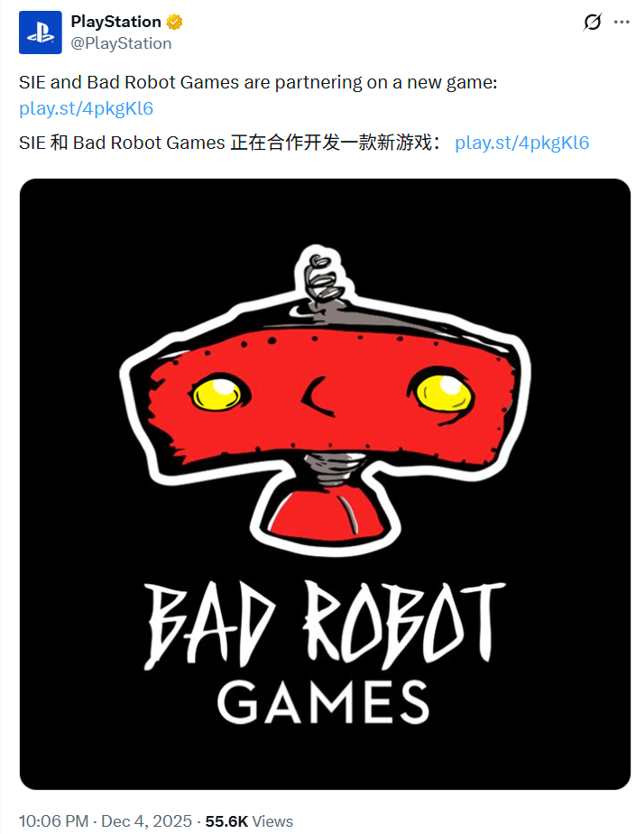 【索尼官宣正携手《求生之路》之父合作研发新游戏】索尼今日官宣,正与Bad Robot Games工作室合作研发一款全新的4人合作射击游戏,这是一款未公布、支持四人合作的射击游戏,由Mike Booth(《求生之路》制作人)作为游戏制作人。该游戏目前正在为PS5和 PC平台开发中。更多游戏详情将在日后公布。Bad Robot Games的CEO表示“与索尼互动娱乐合作使我们能够将我们的新 IP 带入现实,拥有一个宏大的新宇宙愿景,在PlayStation的支持下,我们希望为玩家带来一个大胆、创新且真正特别的游戏体验。我非常兴奋Mike Booth能够担任创意总监,打造一款合作冒险游戏,让玩家与朋友共同创造难忘的时刻。”Bad Robot Games是Bad Robot的一个部门,他们曾制作《迷失》、《科洛弗档案》、《碟中谍》、《星球大战》、《星际迷航》等影视作品。该部门由 J.J. 艾布拉姆斯和一群热衷于游戏创新的团队组建而成,其唯一使命是:持续重塑故事的游玩方式。