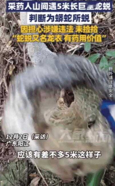广东一男子上山采药,突然发现草丛里有动静,他看到白色的皮,以为是蛇!结果凑近一看,发现竟然是一个5米长的巨型蛇蜕,他判断是蟒蛇蜕的,蛇蜕可是有药用价值的,这么大的蛇蜕值不少钱,可男子不敢要,直接转身就下山了! 男子是专业采药人,平时见蛇蜕见得多了,可5米长的还是第一次见。 视频里,一整张灰棕色的蛇蜕挂在灌木枝上,顺着斜坡往下拖,最宽的地方能盖住他的巴掌,纹路还清清楚楚,边缘沾着点黏糊糊的蛇油,一看刚蜕没多久。 但他没有去捡,蛇蜕还在山上,因为蟒蛇是保护动物,捡了怕有麻烦,而且,既然蛇蜕在这里,说明蟒蛇并没有走远,为了安全他还是先下山为妙。 其实,男子没捡太对了——钱没了能再挣,要是留个案底,孙子考公都受影响,划算吗? 《野生动物保护法》第27条说了:“国家重点保护野生动物的‘衍生物’——就是皮、毛、蛋、蜕的皮这些,都受保护,私自猎捕、交易、占有都违法!” 但也分两种情况:要是只是捡了没卖,算‘非法占有’,罚两千到两万;要是拿去卖了,金额超五千就可能够‘刑事立案’,要坐牢的! 有人插话说:“蛇自己蜕的皮,又不是杀了蛇,咋还犯法?” 你想啊,要是允许捡着卖,就会有人故意守着蛇洞等蜕皮,甚至为了要大蜕,给蛇喂催长药,更狠的直接杀蛇取皮!法律管着‘衍生物’,就是从根上断了这个念想。就像老虎掉的毛、大象脱的牙,哪怕是自然掉的,也得由林业部门收走,个人碰都不能碰。 山里的东西看着“无主”,实则不少都沾着“法律红线”,蟒蛇蜕、穿山甲鳞片、野鸟蛋,哪怕是自然脱落、自然孵化的,也不能私自拿。这不是“小题大做”,是为了护着山里的生灵,也护着自己的安稳。 采药人山间遇5米长巨型蛇蜕