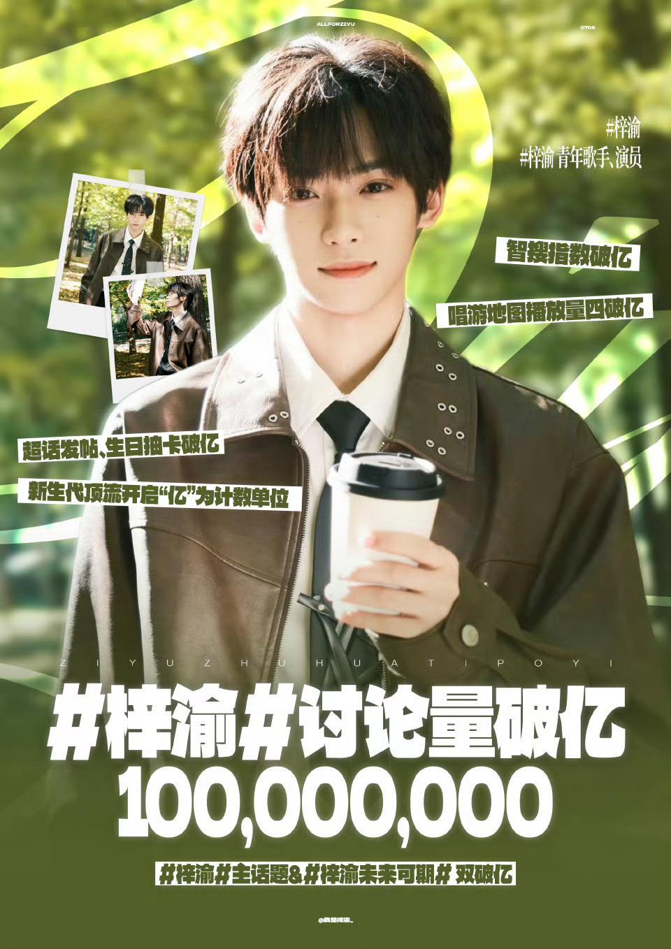 梓渝主话题梓渝讨论量破亿。超话生日抽卡活动卡片破亿、超话发帖量破亿,唱游地图播放量四破亿、智搜指数破亿,杂志销量1.86亿、带动文旅消费31亿。太火了起步就是破亿梓渝