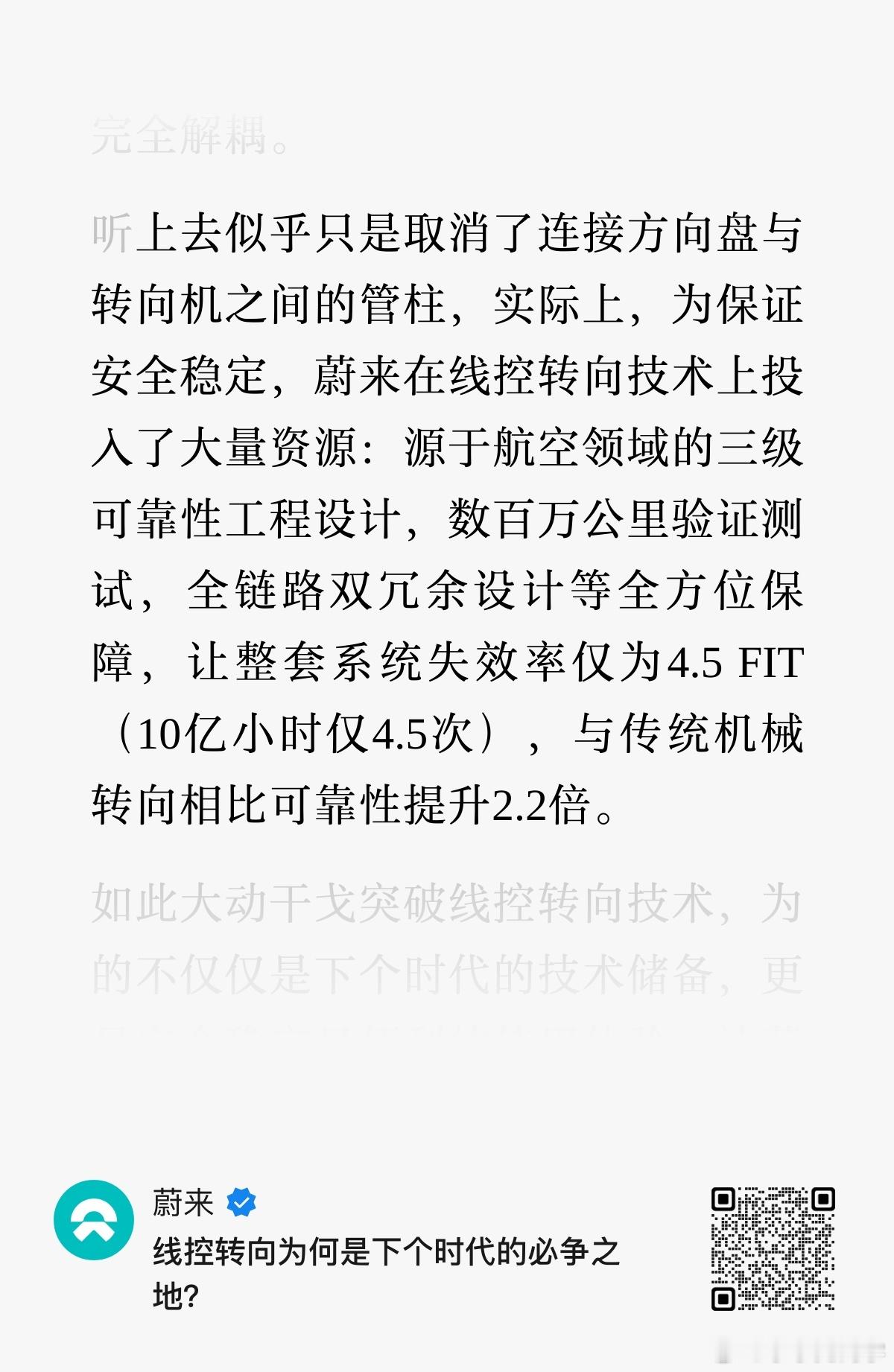 关于线控转向,我问过蔚来的工程师,怎么保证可靠性和安全性。当时那个工程师,莞尔一笑,说你只要记住,蔚来采用的线控转向,失效概率比传统的机械转向还低2倍,就行了。大v聊车