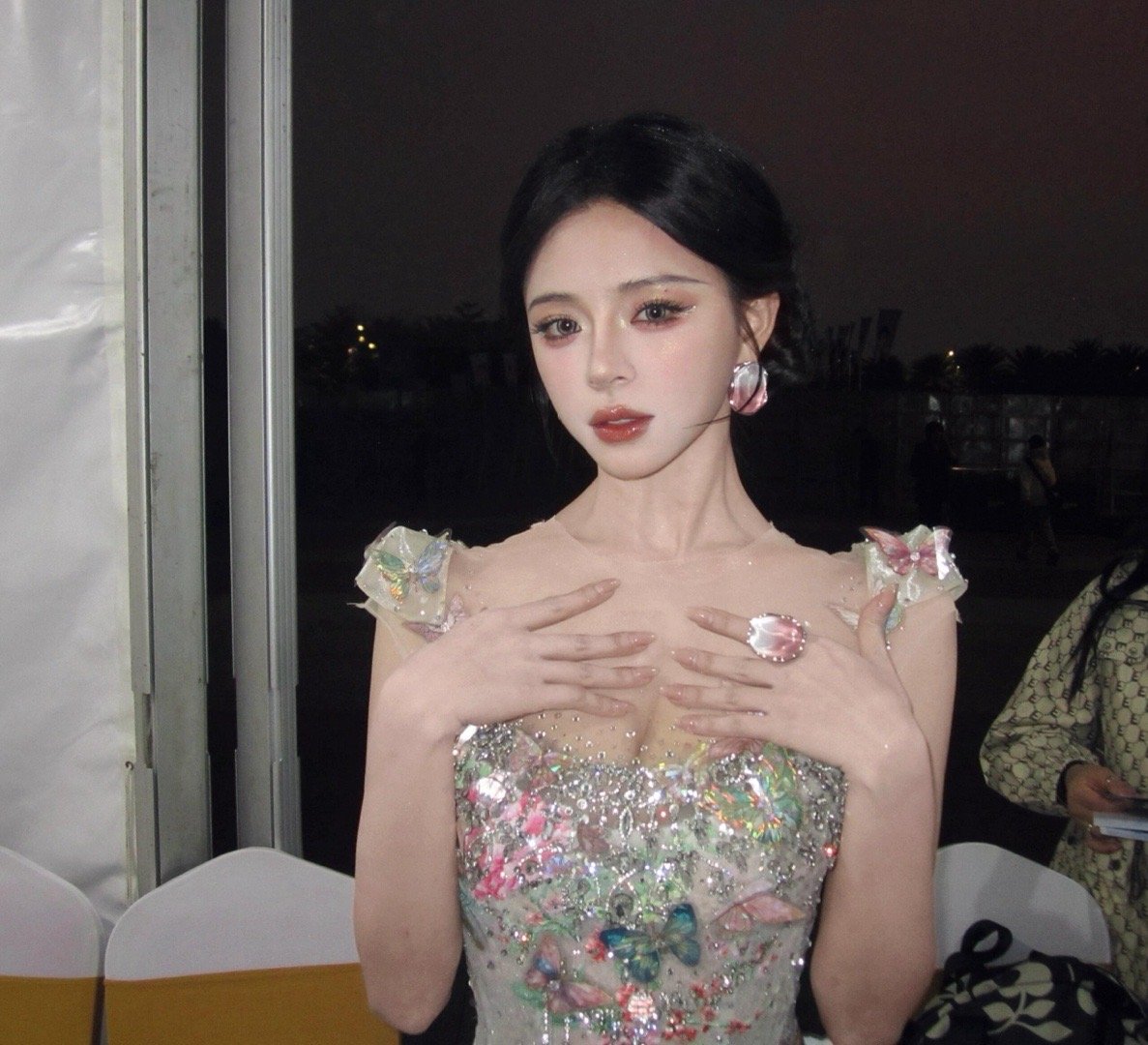 高圆圆旁边这是谁啊??身材好好啊,就是这个裙子的布料……