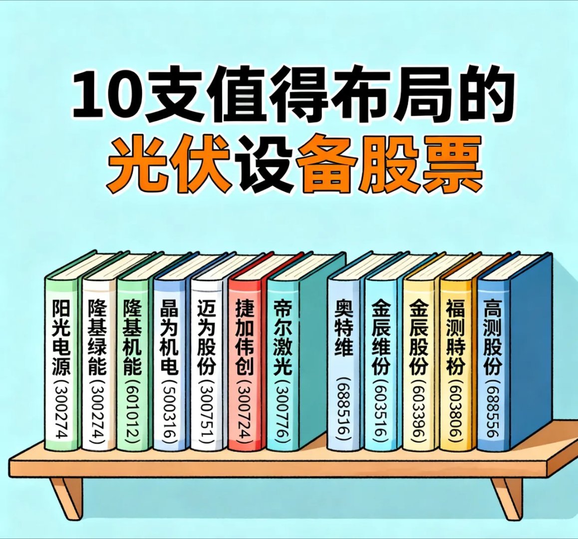 长期看好光伏储能赛道!10只光伏设备核心标的深度解析,技术+市占率双驱动光伏储能行业长期成长逻辑清晰,受益于全球能源转型与政策支持,以下10只光伏设备龙头凭借核心技术壁垒、高市场份额与多元化布局,成为值得长期关注的优质标的:1. 阳光电源(300274):光储一体化领军者,全球逆变器王者作为储能逆变器全球龙头,市占率高达35%,光储系统精准适配工商业场景,海外市场布局成熟,收入占比达60%。凭借光储协同技术优势,深度受益于全球储能装机热潮,是行业一体化解决方案核心供应商。2. 隆基绿能(601012):电池技术标杆,产品溢价优势显著HPBC电池转换效率达27.3%,钙钛矿叠层中试效率突破32.6%,技术研发实力领跑行业。分布式组件凭借性能优势实现0.08元/W溢价,在电池片技术迭代与产品盈利性上具备核心竞争力,龙头地位稳固。3. 晶盛机电(300316):设备龙头跨界突破,多元业务打开增长空间单晶炉全球市占率90%,联合中环研发超低氧单晶炉,完美适配N型硅片生产需求。同时切入碳化硅长晶设备赛道,已获三安光电订单,预计2025年该业务营收占比将达20%,技术壁垒与业务多元化优势凸显。4. 迈为股份(300751):HJT设备绝对龙头,技术迭代引领行业HJT整线设备市占率79%,独创钢板印刷技术使银耗降低40%,显著提升客户盈利空间。钙钛矿叠层设备进入中试阶段,转换效率达31.27%,持续引领高效电池设备技术方向,成长确定性高。5. 捷佳伟创(300724):全技术路线覆盖,盈利韧性突出光伏电池设备龙头企业,是国内TOPCon产线设备主力供应商,同时覆盖HJT、XBC、钙钛矿等所有主流及前沿技术路线,产品适配性强。2025年第三季度毛利率逆势提升至28.06%,在行业竞争中展现出强劲的盈利韧性。6. 帝尔激光(300776):激光设备霸主,全电池技术适配光伏激光设备绝对龙头,全球市占率遥遥领先,在BC电池激光图形化领域技术独占鳌头。产品全面覆盖PERC、TOPCon、BC、HJT、钙钛矿等各类电池技术的激光加工需求,深度绑定行业技术迭代节奏。7. 奥特维(688516):串焊机王者,跨界锂电打开增量串焊机全球市占率超80%,SMBB技术可适配所有电池路线,产品竞争力无出其右。同时成功跨界锂电设备领域,获宁德时代20亿模组PACK线订单,2024年单季新签单56亿元,同比激增223%,增长动能强劲。8. 金辰股份(603396):组件设备龙头,跨界攻坚电池设备组件层压机、串焊机等核心设备全球市占率领先,是组件制造环节核心供应商。自主研发的TOPCon用PECVD设备已通过中试线验证,成功向电池片设备领域跨界突破,打开第二增长曲线。9. 福斯特(603806):胶膜行业霸主,盈利韧性行业领先全球胶膜市占率高达50%,形成绝对垄断优势,POE胶膜完美适配N型组件抗PID需求,产品结构持续优化。2024年毛利率维持25%,在行业价格战背景下净利率仍稳定在15%,盈利韧性远超同行。10. 高测股份(688556):切片技术龙头,降本核心助力者金刚线切片机全球市占率70%,代工切片业务毛利率高达45%,盈利水平突出。120μm超薄硅片切割方案碎片率<0.1%,可帮助客户降低成本10%,在硅片降本趋势中占据核心地位,技术与成本优势双领先。