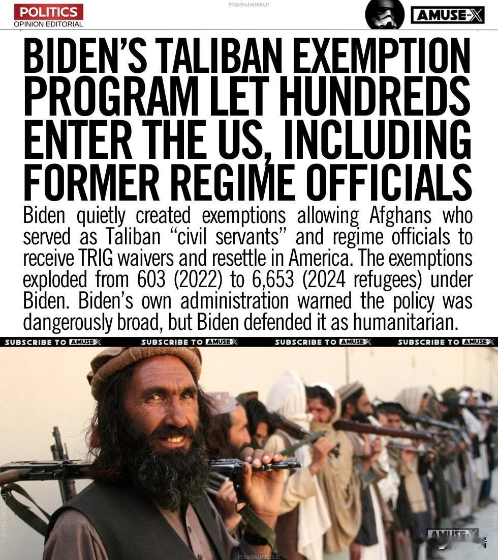 拜登任内不仅引进了2000多名阿富汗死亡小队成员,而且还引进了7000多名塔利班公务员和政权官员。 拜登时期的国土安全部和国务院制定了范围广泛的豁免条款,涵盖了在塔利班第一政权时期(1996-2001年)以及2021年8月之后为塔利班工作的阿富汗人,使得数百名通常因违反反恐法而被禁止入境美国的人员得以进入美国。2024财年,TRIG豁免数量飙升至6848人,其中绝大多数是难民,包括374名塔利班公务员和3000多名曾向一级或二级恐怖组织提供“有限”支持的人员。如今,在阿富汗国民拉赫曼努拉·拉坎瓦尔伏击杀害一名西弗吉尼亚州国民警卫队士兵后,批评人士指出,拜登明知故犯地将巨大的安全风险引入了美国社区。
