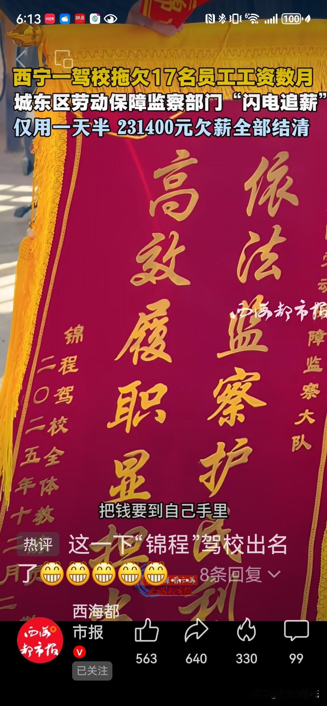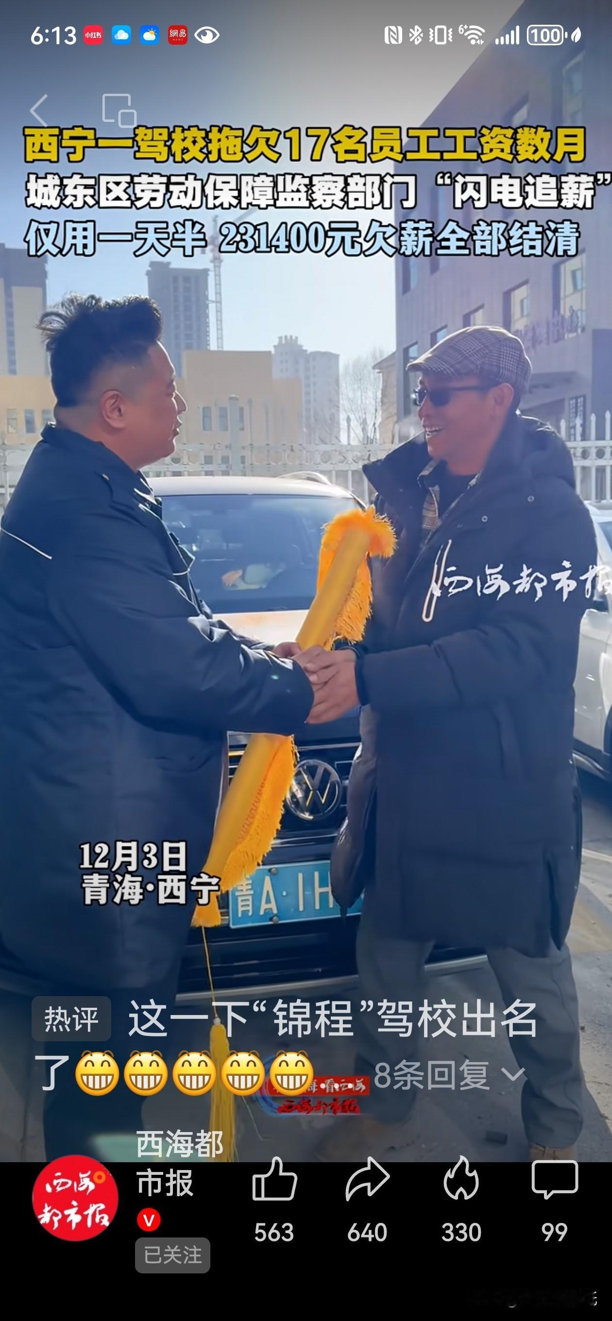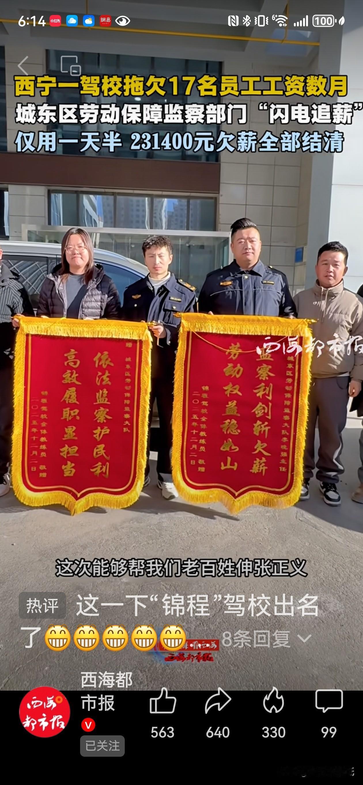 点赞!西宁为17名驾校员工追回被拖欠的工资231400元! 近日,西宁城东区劳动监察部门接到投诉,一家驾校拖欠17名员工工资长达数月,总额23.14万元。没想到,仅用一个工作日,所有欠薪全部到账! 立案后,监察大队启动“快立快处”机制,一边联系驾校负责人讲明法律后果,一边督促筹集资金。第二天,员工们就拿回了自己的血汗钱。 年关将至,这样的“闪电速度”值得点赞,更值得深思。每逢年底,“讨薪难”总反复上演。多少打工者奔波在冷风中,只为结清一年的辛苦钱;多少家庭等着这笔钱过年、结账、看病。 干活拿钱,天经地义。不能让劳动者“画梅止渴”!企业要自律,部门要发力,法律要亮剑。唯有让欠薪者付出代价,让维权路畅通无阻,才能守住打工人的尊严与安心。 这份工资,是养家糊口的依靠,更是公平正义的温度。为西宁的效率叫好,更期待每一天、每一地,劳动者都能堂堂正正地拿到应得的报酬。 拒绝拖欠,守护辛苦钱! 员工讨薪工资