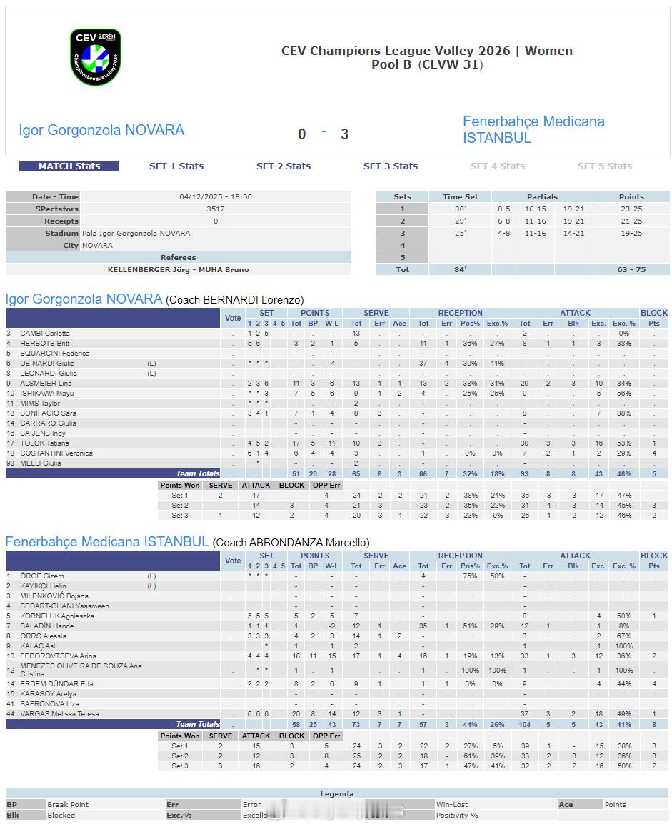 【欧冠女排费内巴切3-0完胜诺瓦拉 MVP巴尔加斯20分】国际排坛战报速递 12月4日诺瓦拉,欧冠女排第四轮第二回合,B组土耳其费内巴切客场3-0(25-23/25-21/25-19)完胜意大利诺瓦拉,取得两连胜。MVP巴尔加斯20分、费多罗夫采娃18分、克里斯蒂娜伤愈复出短暂上场得到1分,托洛克17分、阿尔斯迈尔11分。