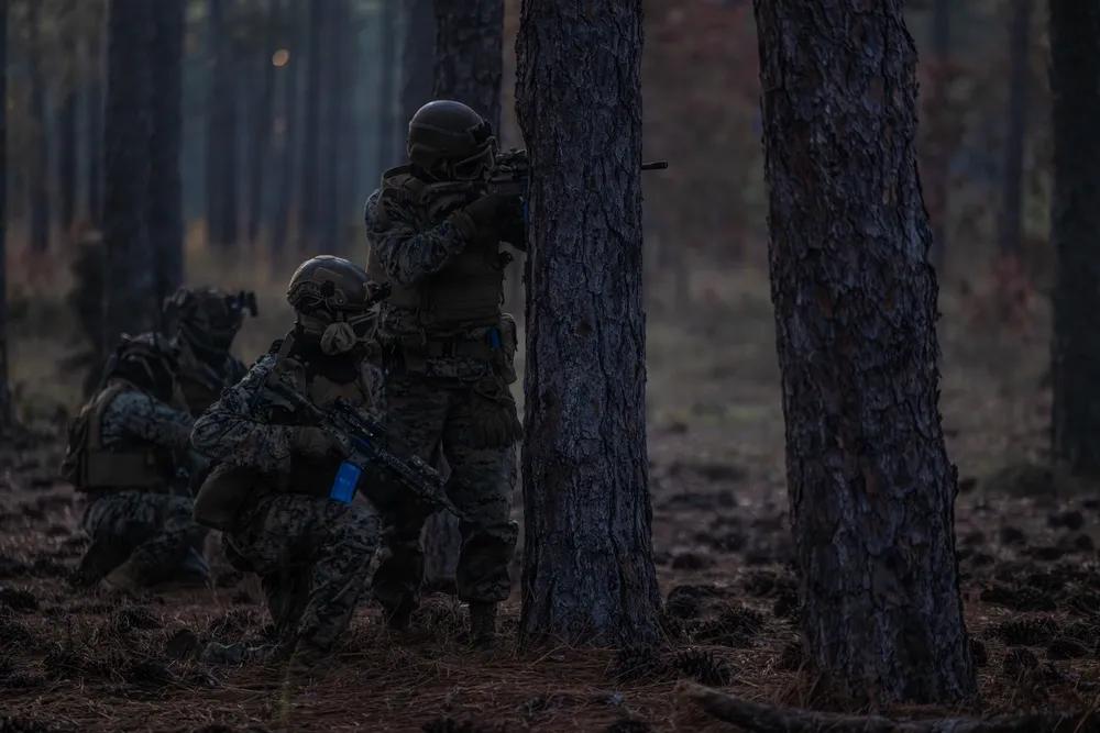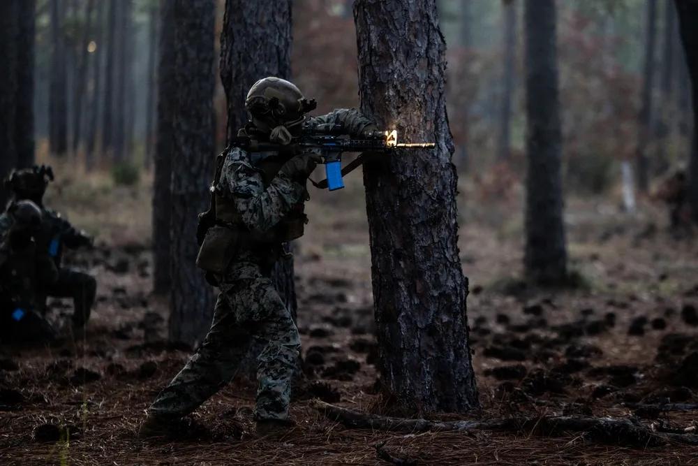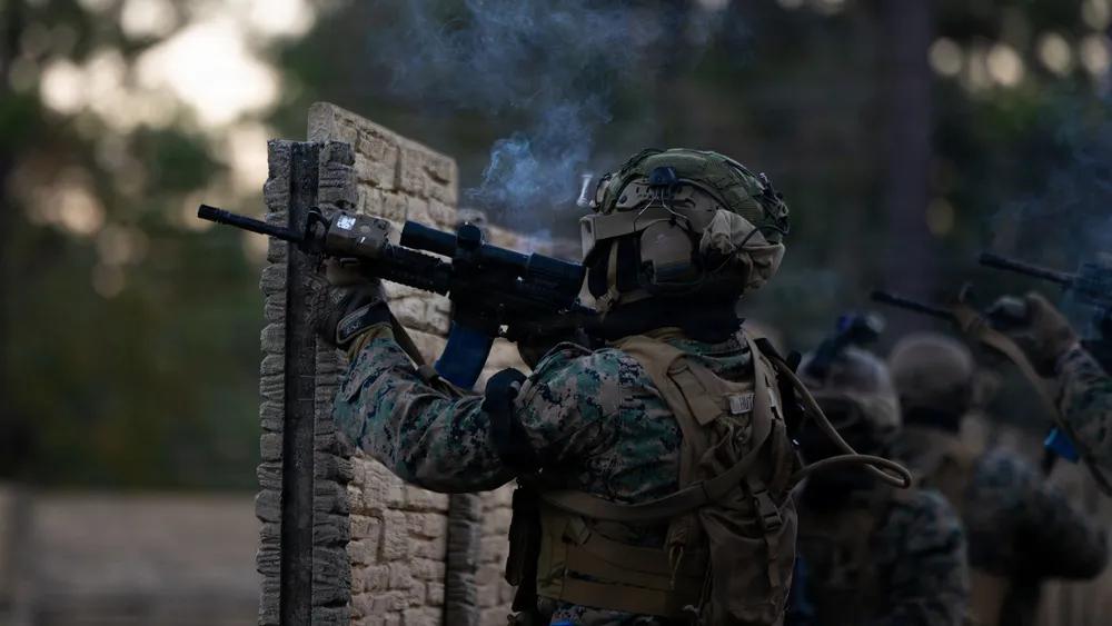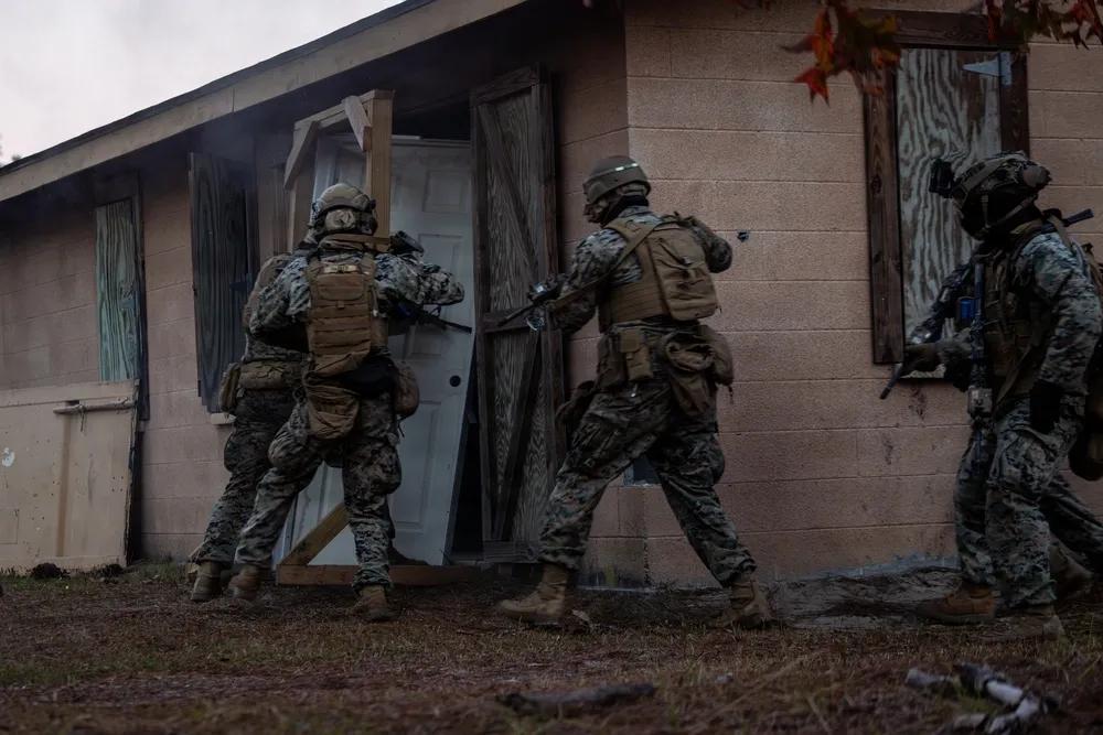 美军一直在频繁演习“巷战”作战的标准流程。 2025年11月18日,美国海军陆战队第2师第2战斗工兵营的海军陆战队员在北卡罗来纳州勒琼海军陆战队基地参加工兵领导课程期间,在城市突击射击训练场进行射击和机动。该课程测试小单位领导技能,并强化先进的战斗工兵技术。