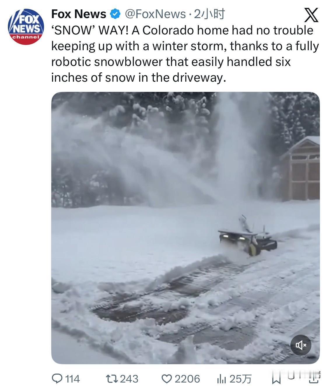 开出一条“雪”道!美国科罗拉多州的一户人家轻松应对了冬季暴风雪,这要归功于一台全自动扫雪机,它轻松清理了车道上六英寸厚的积雪。这台扫雪机可不便宜,售价5000美金。