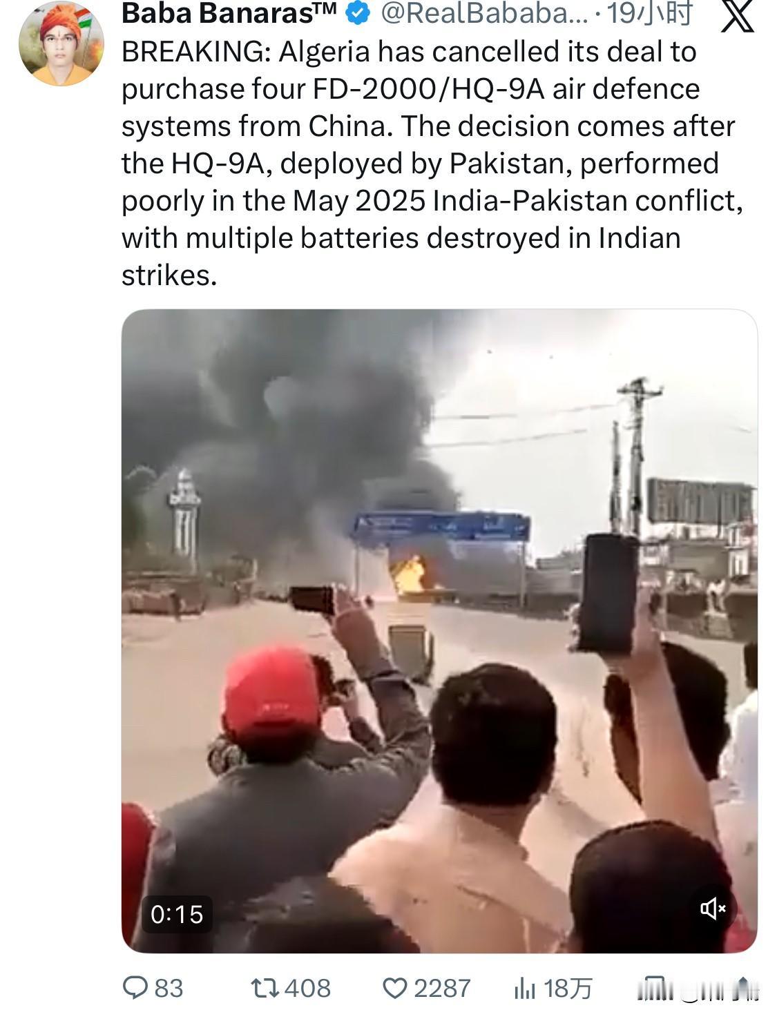 重大新闻:阿尔及利亚刚刚取消了一项价值超过5亿美元的巨额交易,该交易原计划从中国购买4套FD-2000/HQ-9A防空导弹系统! 为什么?巴基斯坦的HQ-9系统在2025年5月印巴激烈冲突中暴露并遭受重创——尽管巴基斯坦声称其系统“无敌”,但多个HQ-9系统阵地还是被印度的精确打击摧毁。