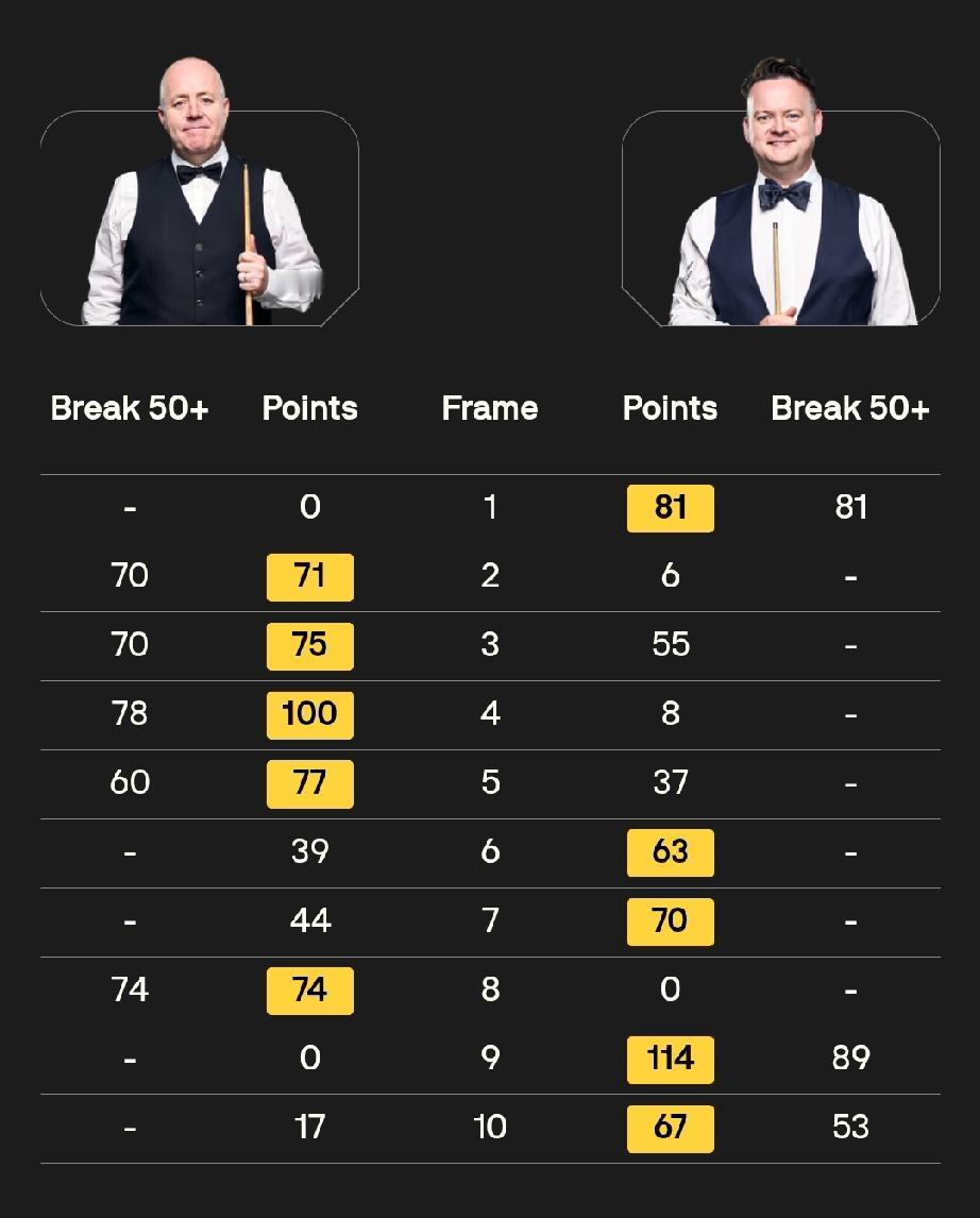 巴里·霍金斯 6-0 埃利奥特·斯来塞 约翰·希金斯 5-5 肖恩·墨菲 2025年斯诺克英锦赛最后两场16进8轮次的比赛。巴里·霍金斯六连鞭埃利奥特·斯来塞,8强战,巴里·霍金斯对阵马克·塞尔比。 约翰·希金斯与肖恩·墨菲的比赛比分胶着,胜者下轮对阵张安达。
