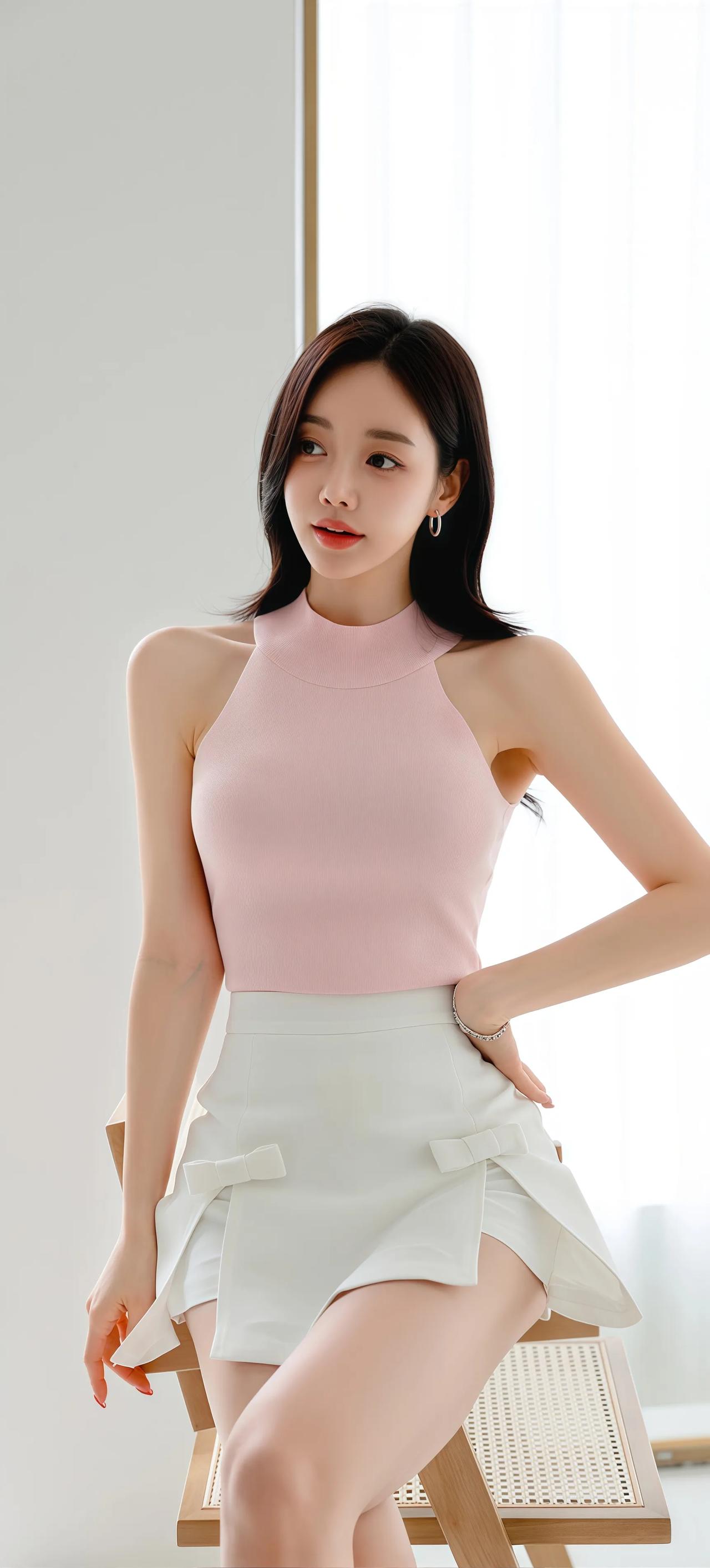少女心满满,粉色连衣裙,坐在窗边,阳光洒满全身