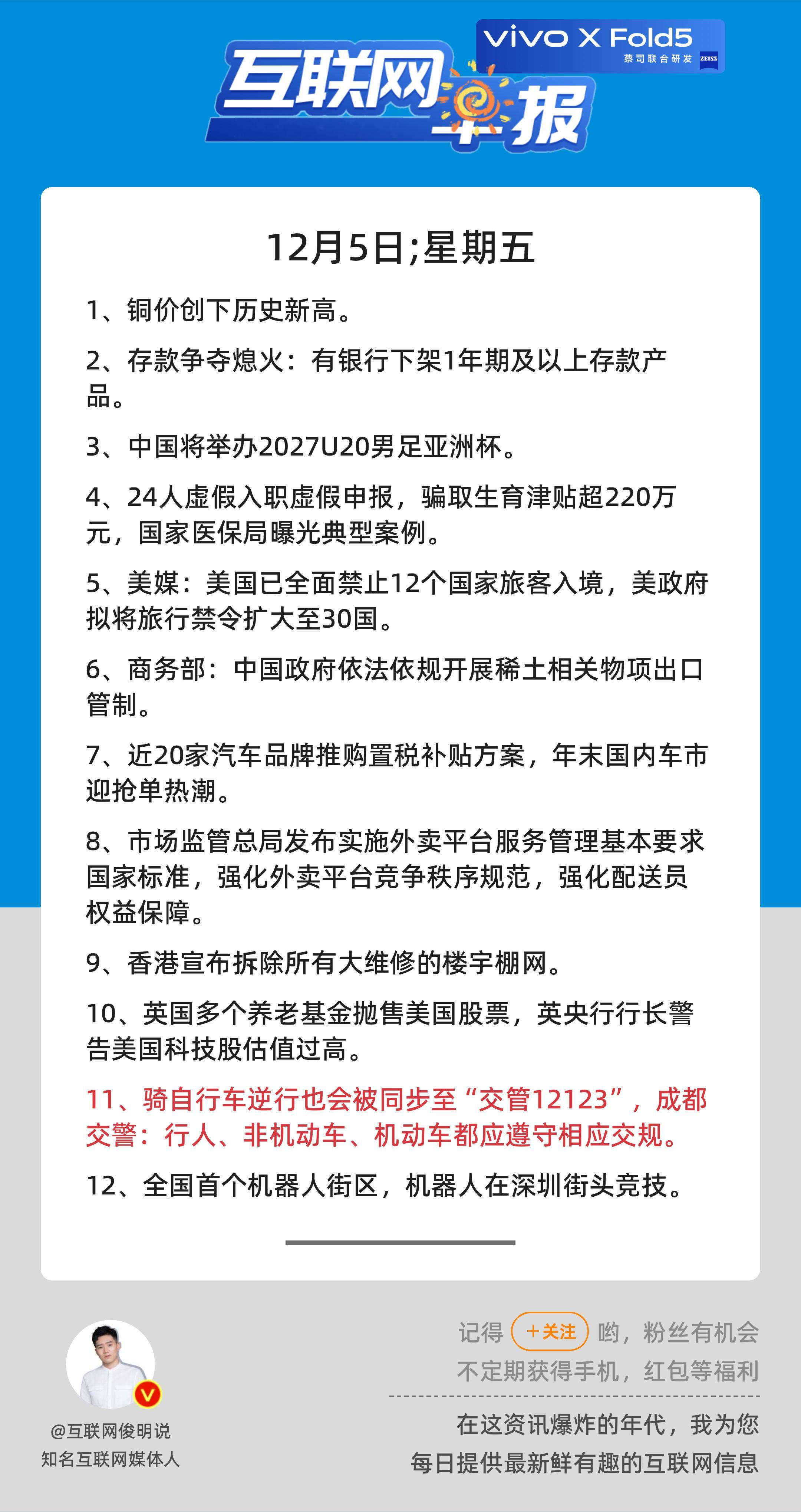 12月5日,星期五,《第2978期》;互联网早报,众览天下事关心第11条:骑自行车逆行也会被同步至“交管12123”,成都交警:行人、非机动车、机动车都应遵守相应交规;早安————————————点击右上方关注每天一分钟众览天下事,互联网早报值得拥有! 更多精彩,欢迎加入粉丝群俊明和他的朋友们