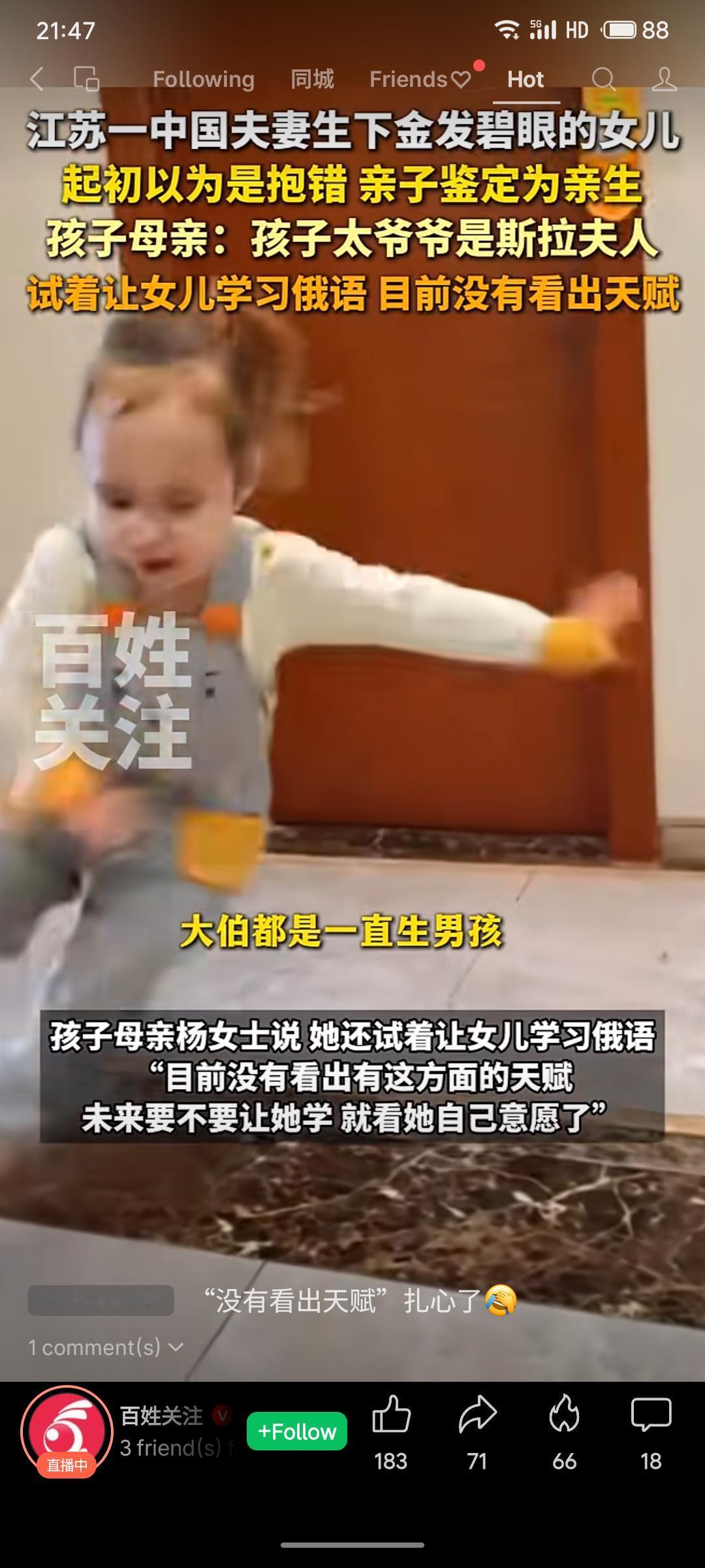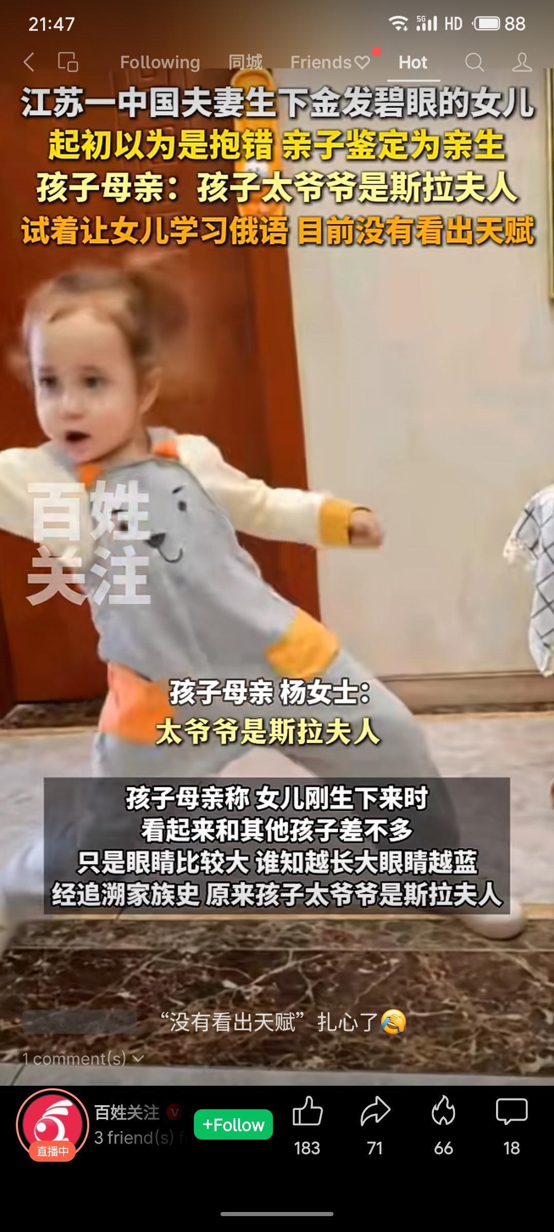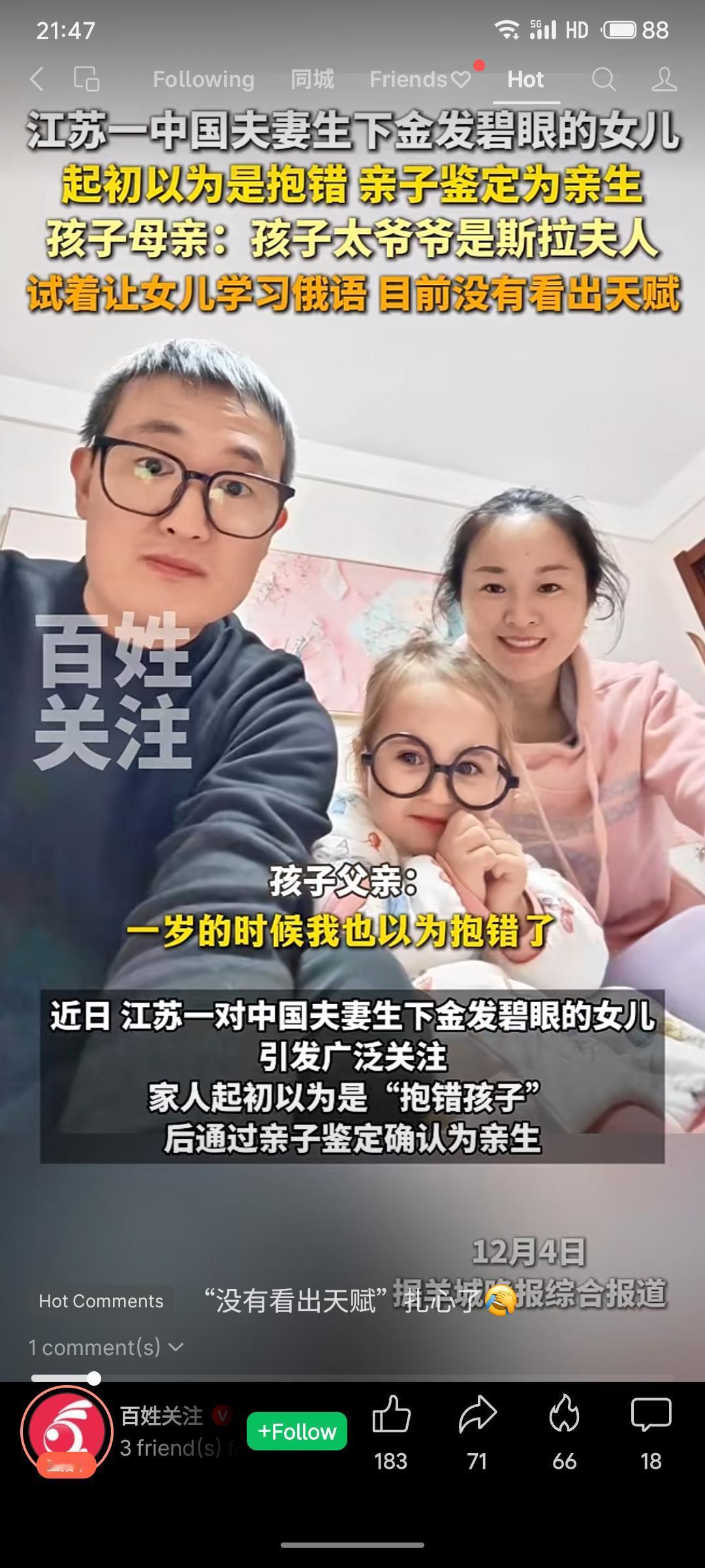 江苏一对中国夫妻生下金发碧眼的女儿,起初被怀疑抱错,亲子鉴定证实为亲生。母亲解释,孩子的太爷爷是斯拉夫人,隐性基因隔代显现。父母尝试让女儿学习俄语,但目前未展现出相关天赋。此事体现了基因遗传的奇妙与多样性。