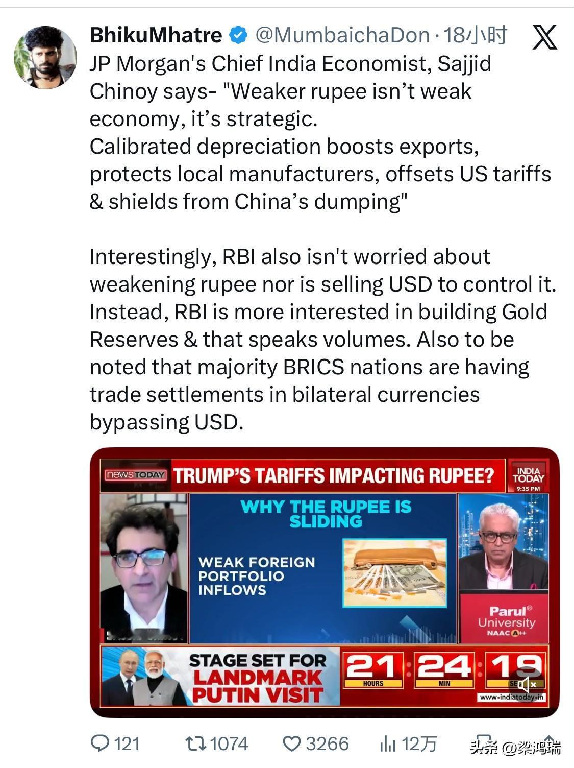 摩根大通首席印度经济学家萨吉德·奇诺伊表示:“卢比贬值并不代表经济疲软,而是战略性的。” 有控制的贬值可以促进出口,保护本地制造商,抵消美国关税,并抵御中国的倾销。 有趣的是,印度储备银行(RBI)既不担心卢比贬值,也没有抛售美元来控制卢比汇率。相反,RBI更热衷于增加黄金储备,这本身就说明了很多问题。此外,值得注意的是,大多数金砖国家都采用双边货币进行贸易结算,绕过了美元。