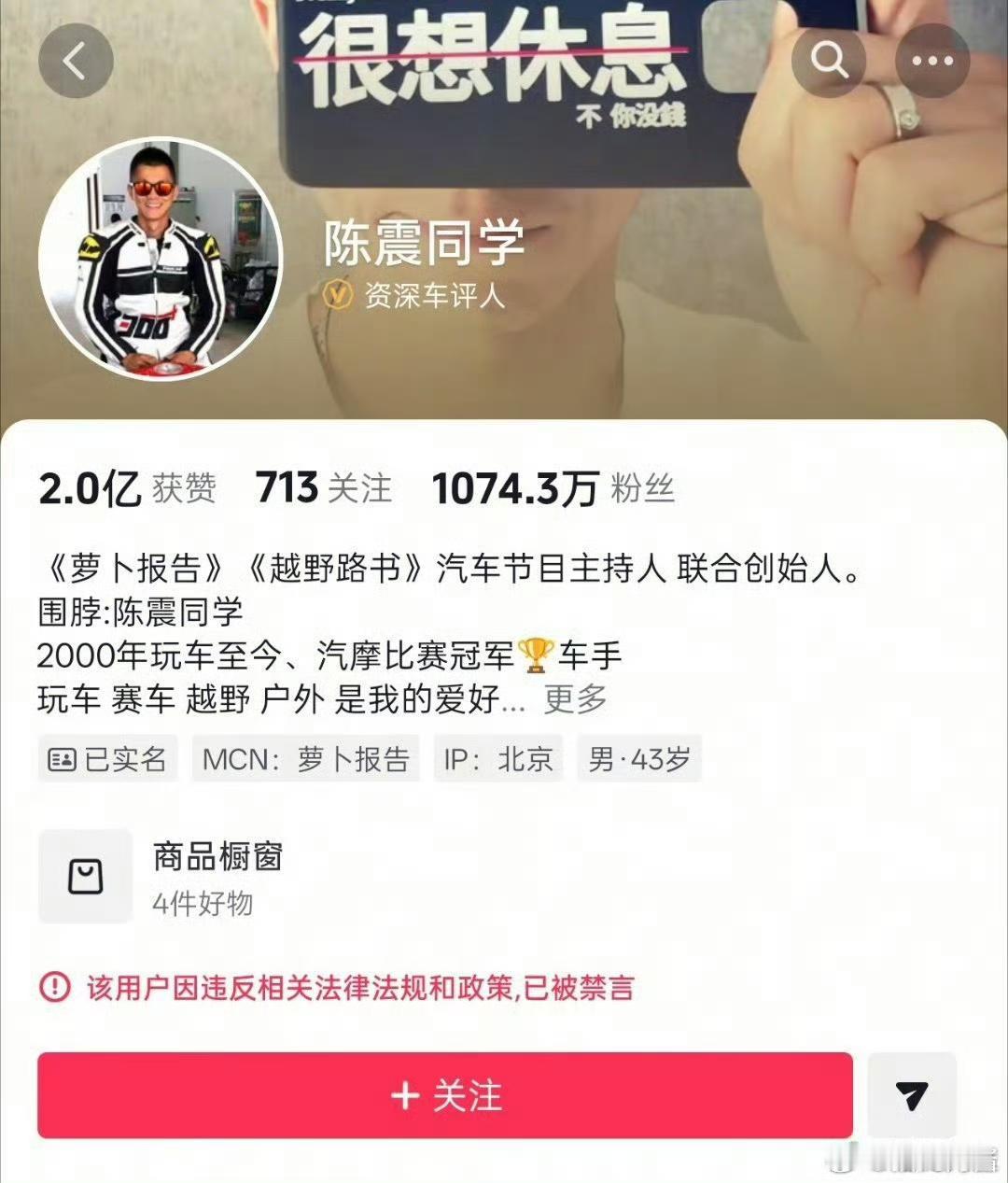 家人们谁懂啊!2400万粉车评大V陈震,抖音封面还写着“很想休息”,这下真得彻底歇着了! 微博、抖音全禁言,B站直接封账号,这波操作比他开劳斯莱斯撞车还刺激!原来不是一直正能量,最近先是阴阳小米捐款引争议,又造谣“7000法务”传虚假信息,叠加之前的车祸全责,争议攒满直接触发平台“休长假”套餐~ 只能说,大V说话可得有分寸,不然想休息就变成被迫停更啦!