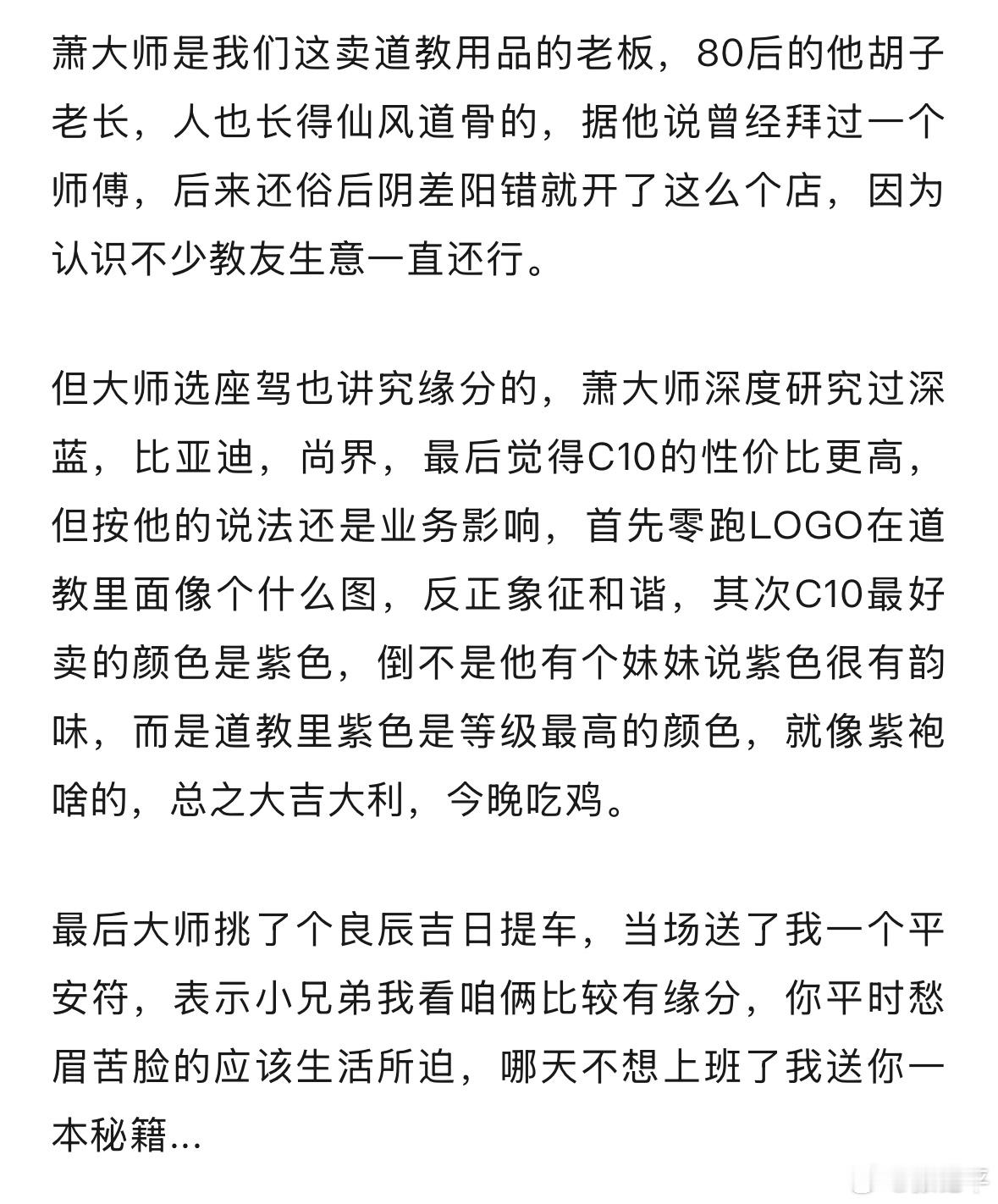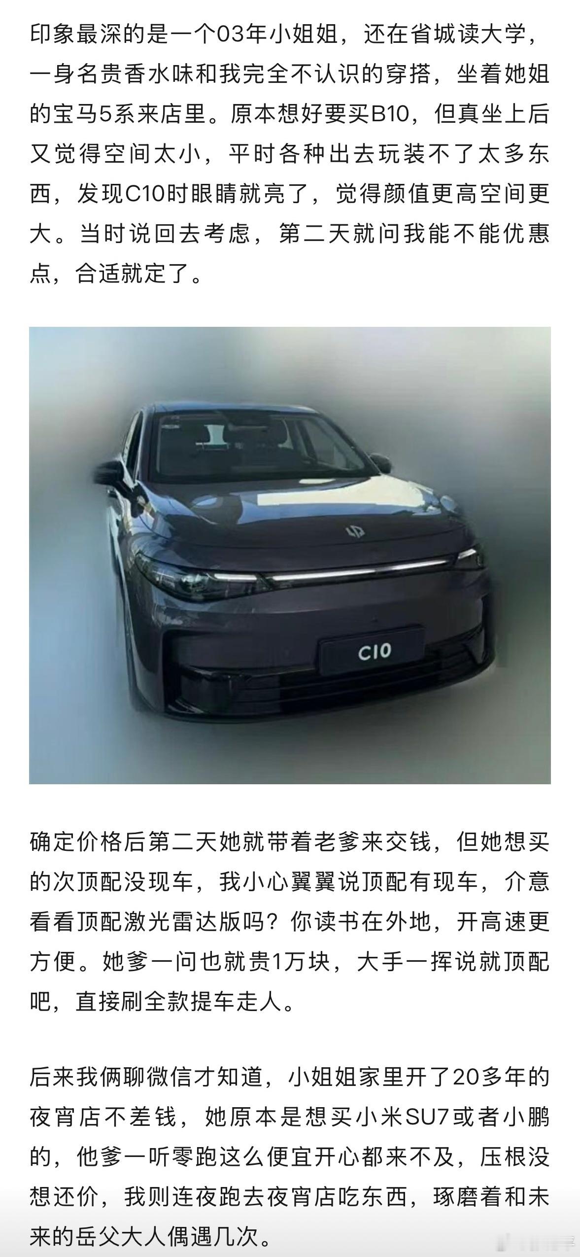零跑C10销售反馈:1,这家店买C10的客户有两大类,一是30~40岁的男性客户,自己做生意或者在私企上班,绝拿家里的老车来置换,在乎的是讲究的是性价比和实用性。二是正上大学或者工作不久的年轻小姑娘,看车不差钱凭眼缘。2,厂家内训竞品是比亚迪宋PLUS、深蓝S07、长安启源Q07和银河L7。客户实际对比最多的还得是比亚迪,电池和品牌是客户最关心的点。3,C10刚上市的时候(5月份)有优惠,从8月份行情逐渐松动,目前店里能优惠5000块左右,可以叠加超级置换再优惠2000。注意几乎所有称作“超级置换”的政策,都可以理解为直接优惠。4,最好卖的是次顶配650悦享版,占比60%,紫色最受欢迎。选择最少的是530舒享版,大家觉得530续航少了点。注:这篇车型文章的客户案例很有意思,贴出来给大家看看。新能源汽车大v聊车零跑C10