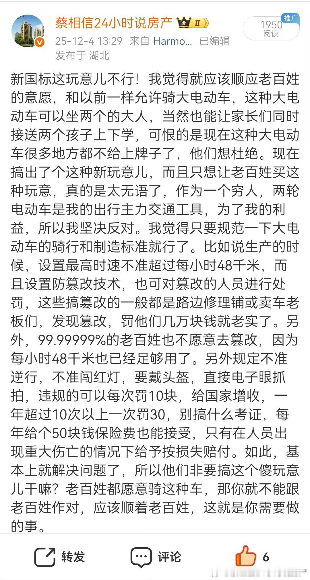 工信部回应个别电动车不够人性化明明是你的整体标准不行,好吧。 现在搞新国标是个什么行为?就是有了新国标后,以后不再让大家卖其他的电动车了,只让大家买这种新国标。比喻下就是:大家以后只能买宏逛mini这种剁椒鱼头了,不能买普通的轿车和SUV了。但是大部分人都更喜欢普通的轿车和SUV啊,他们现在不让大家买了,只让买这种剁椒鱼头,那大家肯定不愿意啊。剁椒鱼头车身太小,所以跑起来稳定性相对来说差一点(因为它短且窄,而又高),速度慢,续航短,动力差,带人少,载货少。低速电动车新国标惹争议