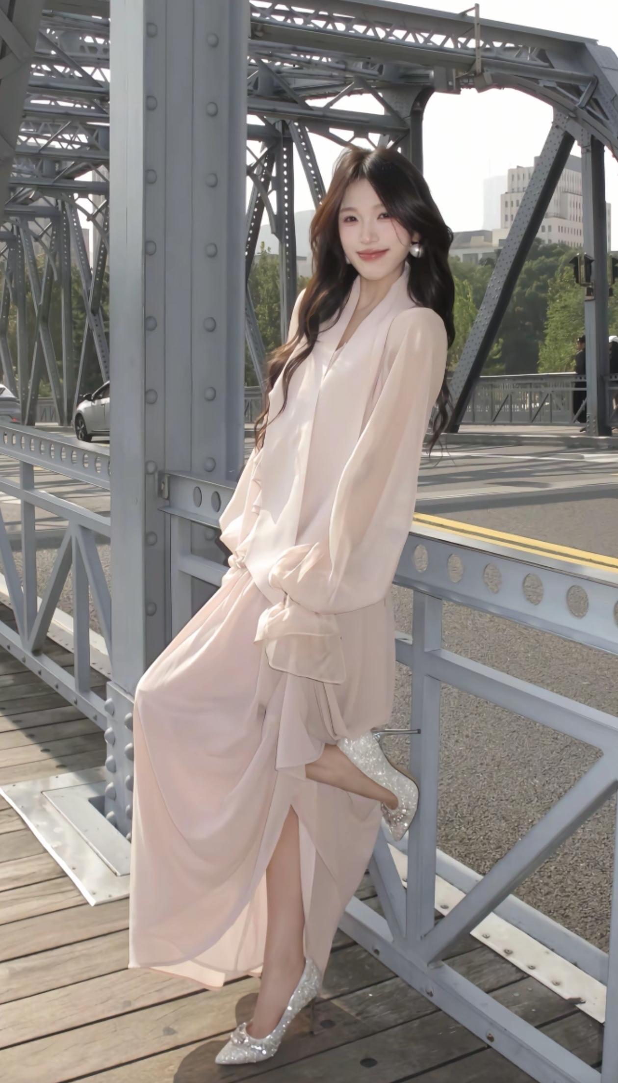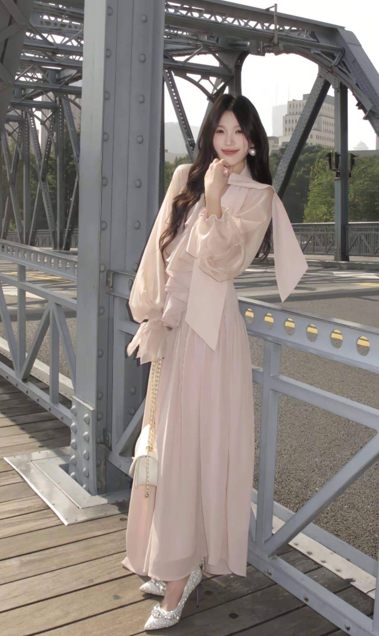 上海外滩的浪漫时光,粉裙飘飘,与东方明珠塔相映成趣。
