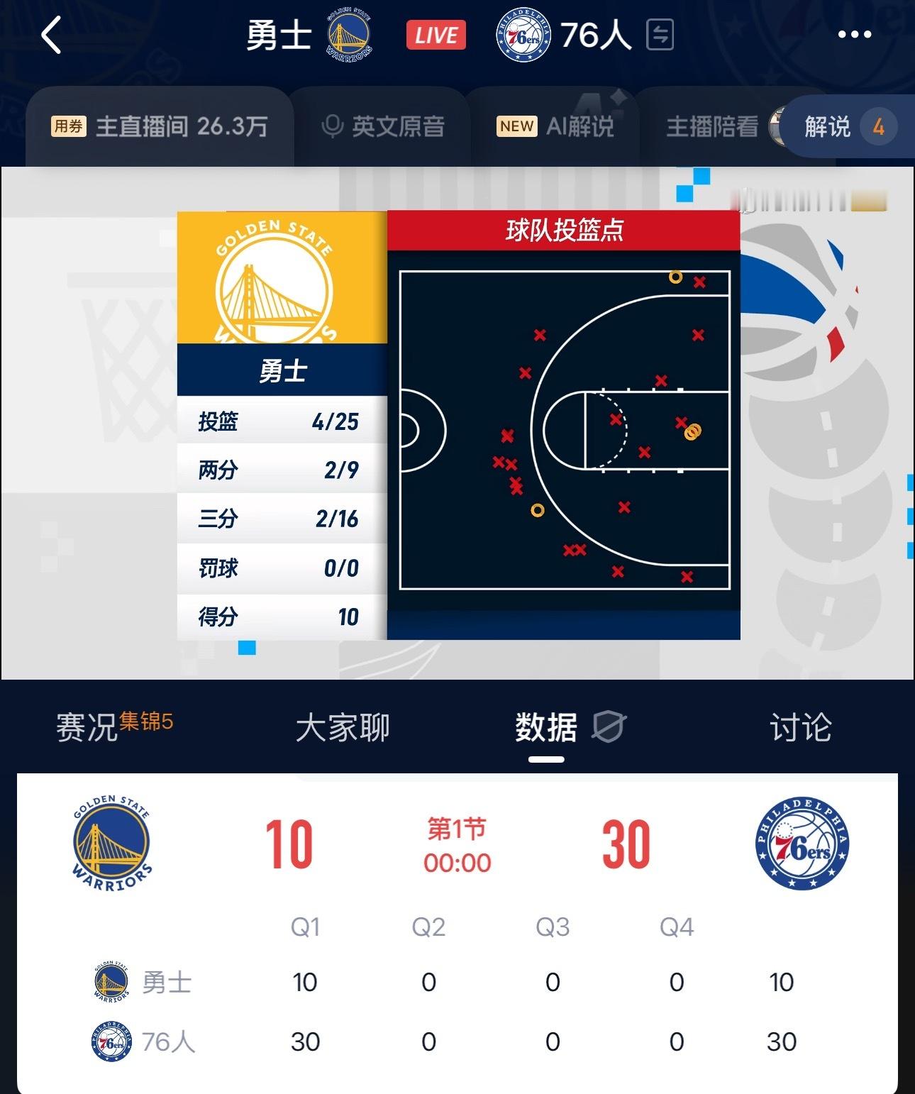 第一节的金州勇士有多离谱投篮25中4,三分球9中2,三分球16中2,落后费城20分,对面甚至没有给你上身体强度….勇士vs76人
