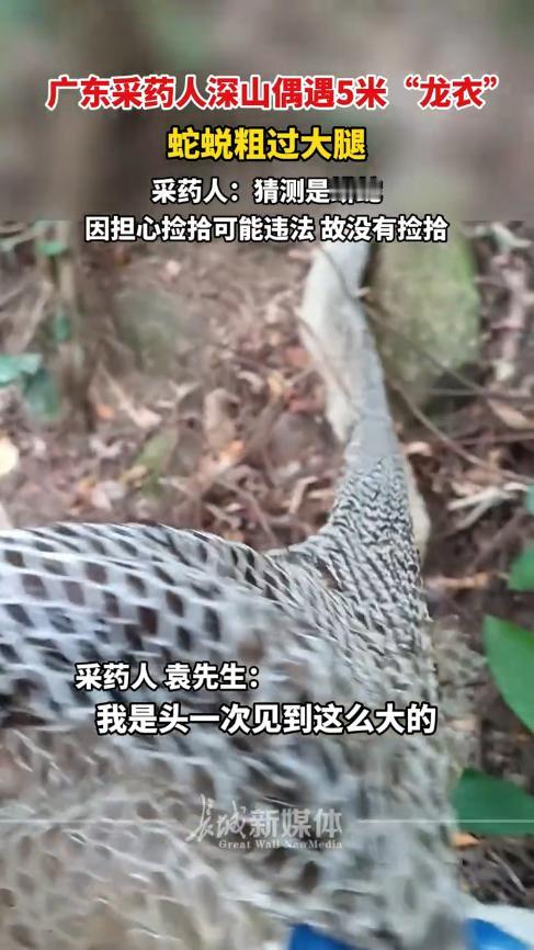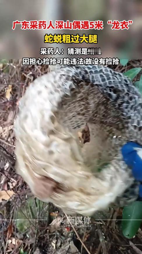 “开眼界了!”12月2日,广东阳江,一男子在山上采药时,突然发现不远处有一条白白的“丝带”,他出于好奇,就过去看了下,走近后才发现是一张蛇皮!长度大约有5米,展开比自己的手都要粗,因担心违法所以并没有捡走。网友:错过一个亿! 如今已经12月份了,北方地区的温度下降的非常明显,野外也基本上见不到蛇了,估计已经找到地方冬眠了,但是南方有些地区的温度依然很高,还没有达到蛇类冬眠的温度,所以进山时依旧要小心。 当天一大早,袁先生就背着筐子进山采药了,辛苦了一上午后,收获却不是很多,正当他在山间穿行时,突然看到不远处有什么东西在随风飘动。 在好奇心的驱使下,袁先生过去查看情况,走近后发现是一张蛇皮,但是这张蛇皮却异常庞大,至少有5米长,他把手放上去比较了一下,推测这应该是条蟒蛇,而且绝对能吞下人! 袁先生听说野外的蟒蛇皮不能乱捡,更不能拿去买卖,所以拍了几张照后就赶忙离开了,生怕等会遇到这条蛇。 网友看后表示,蟒蛇皮是可以捡的,虽然蟒蛇是保护动物,剥皮属于违法行为,但这种自然脱落的没有问题,鉴定的话也能看出来区别,所以无须担心。 信息来源:《12月2日,广东阳江。广东采药人深山偶遇5米“龙衣” ,蛇蜕粗过大腿。采药人:猜测是蟒蛇,因担心捡拾可能违法,故没有捡拾。》长城新媒体