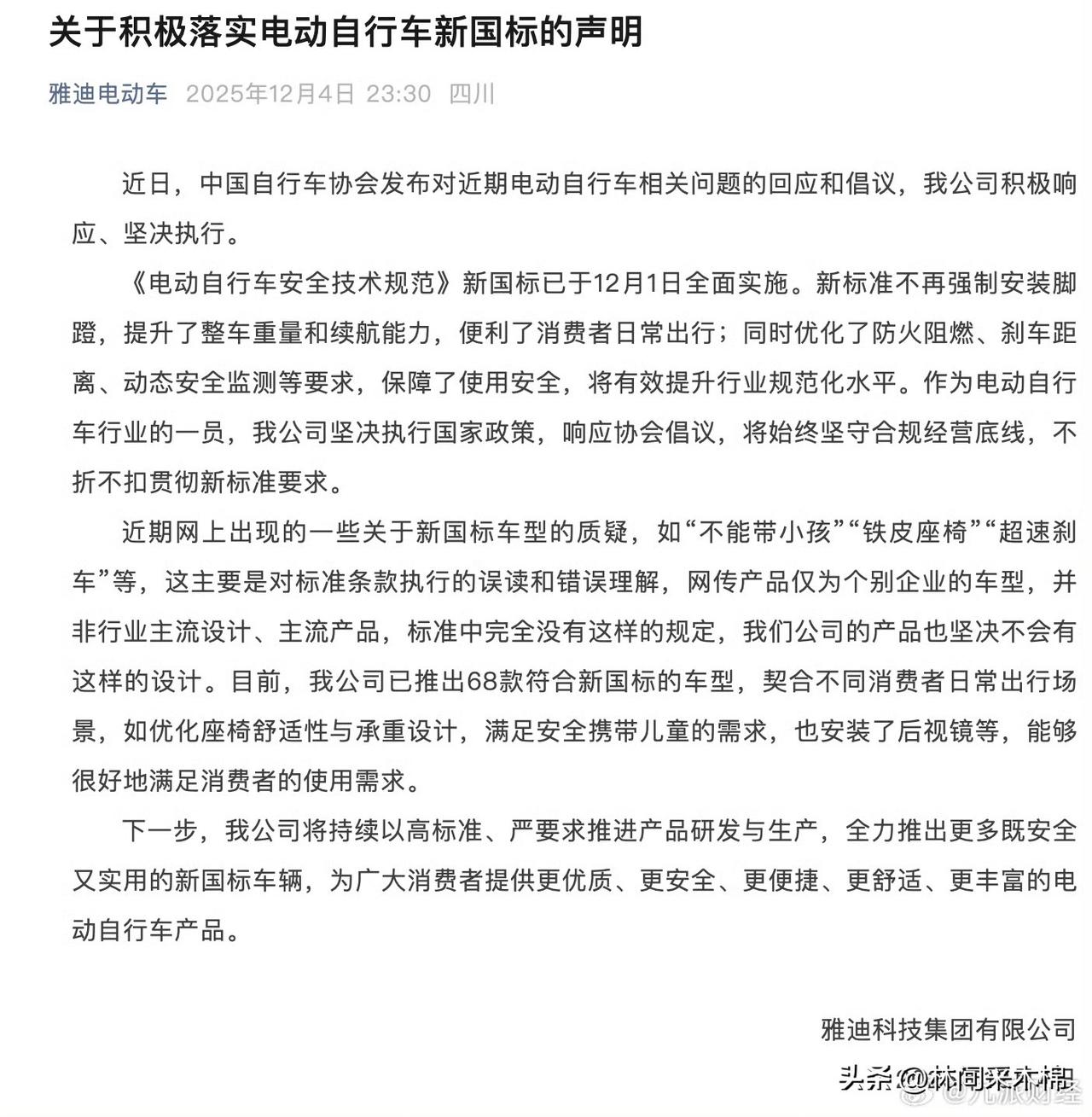 雅迪声明,被全网吐槽铁坐垫,限时速,无储物箱,不能带娃,没后视镜的新国标电动车,只是个别企业车型,并不是市场主流车型,主流产品。 雅迪已经推出68款新国标车型,优化了座椅,能安全带娃,有后视镜。但是雅迪没有提到有没有储物功能?座椅能不能拆下? 雅迪称会积极落地,坚决执行新国标标准。这波声明倒像是立军令状,面对新标,积极配合的态度是好的。 但无论雅迪如何说,新车实不实用,老百姓买不买账才最重要。很多人都说了,要是新车不实用,还得多掏钱,那就不换车了,光换电池,总不能不让旧车上路吧!