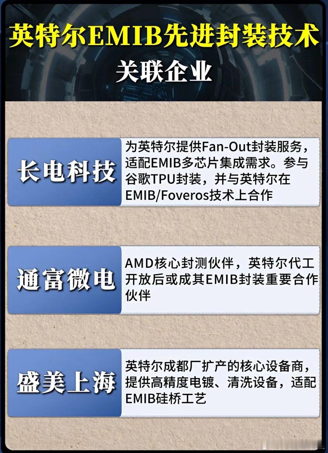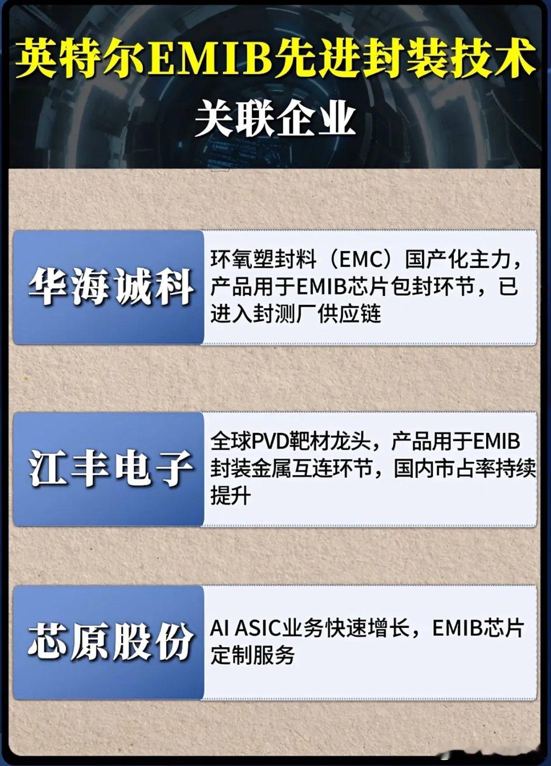 英特尔EMIB封装的“中国伙伴”覆盖封测、设备、材料及定制服务等多个环节,长电科技、通富微电等企业均在核心供应链中占据关键位置。英特尔EMIB(嵌入式多芯片互连桥)先进封装技术的落地,早把中国企业拽进了“高端芯片制造的核心局”——从封测到设备,从材料到定制,一批企业已经成了这项技术的“刚需拼图”。封测环节是直接绑定者:长电科技不仅给英特尔提供Fan-Out封装服务,适配EMIB多芯片集成需求,还和英特尔在EMIB/Foveros技术上深度合作,甚至参与了谷歌TPU的封装;通富微电作为AMD核心封测伙伴,在英特尔代工开放后,正成为其EMIB封装的潜在主力。这两家企业的技术能力,直接决定了EMIB芯片的量产效率。设备与材料是隐形支撑者:盛美上海是英特尔成都厂扩产的核心设备商,其高精度电镀、清洗设备,正好匹配EMIB的硅桥工艺;华海诚科的环氧塑封料(EMC),已经打进封测厂供应链,负责EMIB芯片的包封环节;江丰电子的PVD靶材,则卡在了封装的金属互连步骤,国内市占率持续走高。定制服务是延伸玩家:芯原股份靠AI ASIC业务的增长,提供EMIB芯片定制服务,补上了“设计+封装”的协同缺口。从封测到设备、材料,中国企业已经在EMIB产业链里实现了“环节全覆盖”——不是简单的“配套商”,而是能影响技术落地效率的“核心参与者”。