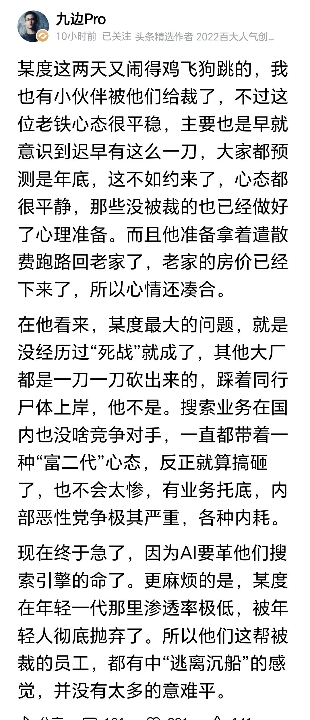 其实不只是某度,全球头部都在裁员收缩,头部裁员的人还能挺一段时间,特别中下的裁员,简直要命,单身还好,有家有小孩的就处在崩溃的边缘!