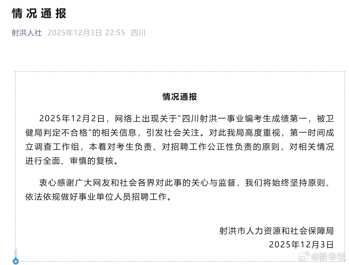 【#当地回应女子考编第1却落选#】#女子考编第1落选四川射洪成立调查组#详↓↓(射洪人社微信公号)