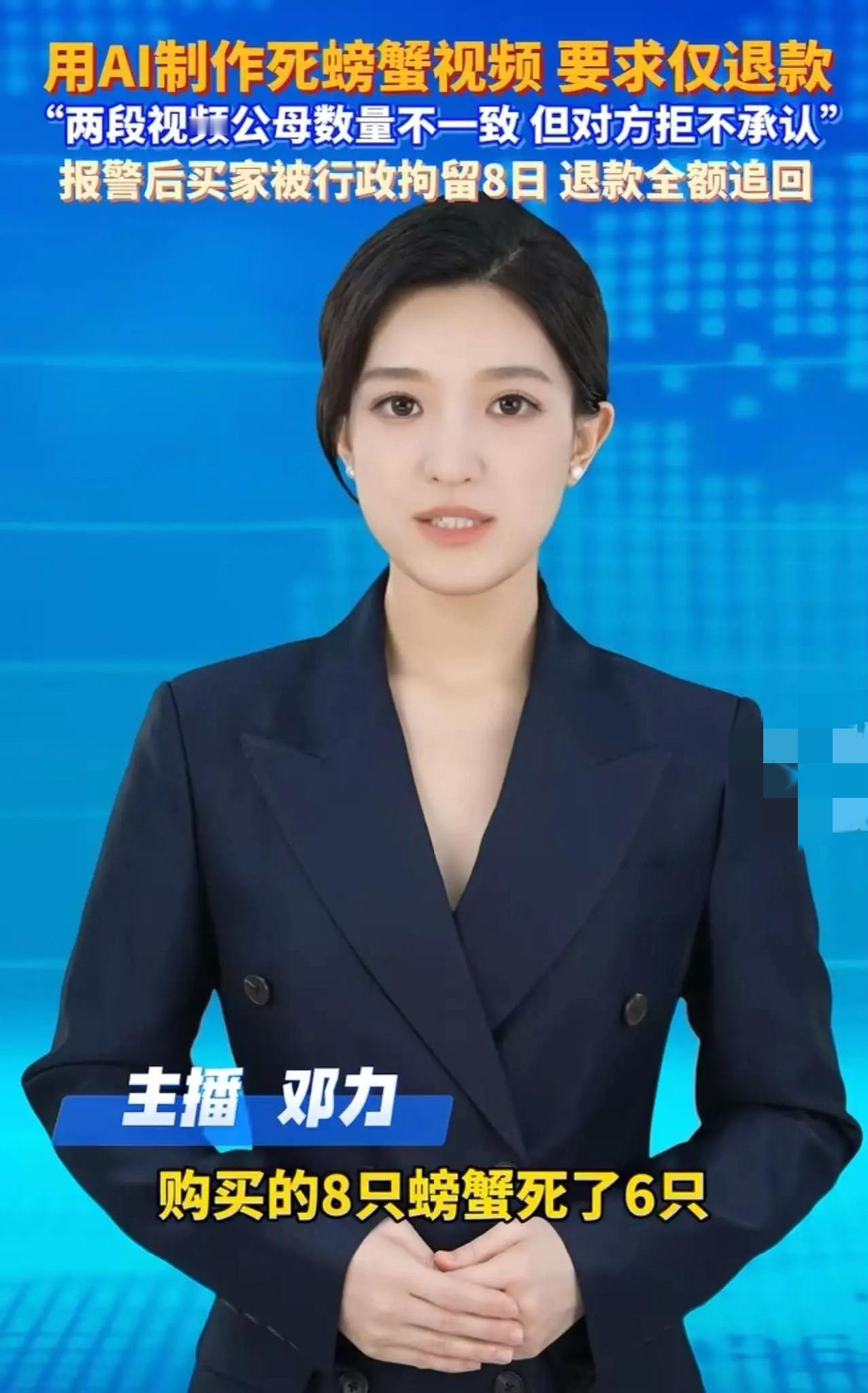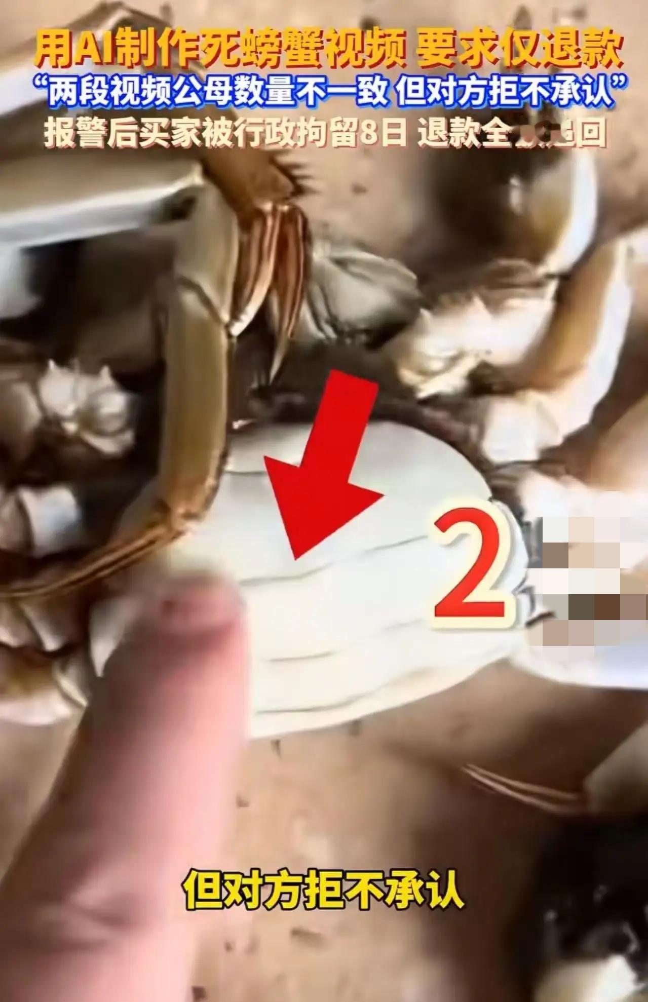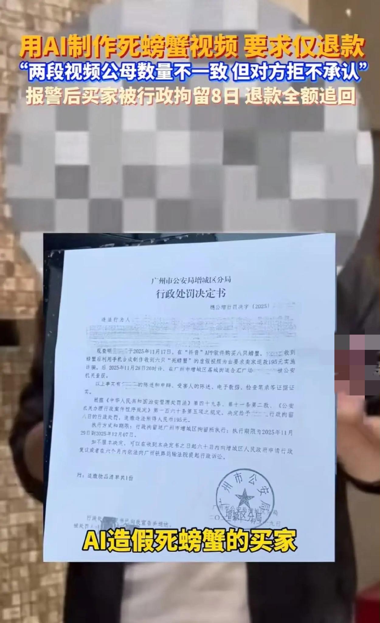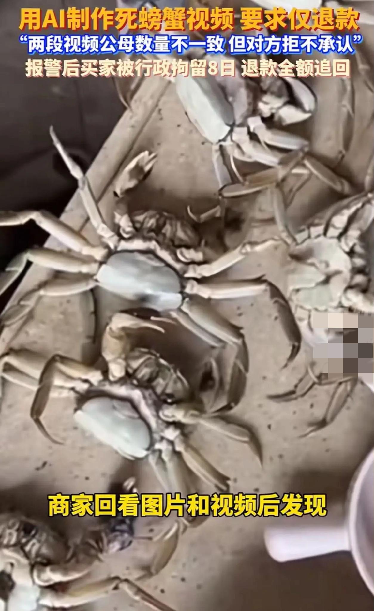 大快人心!买家用AI生成“6只死螃蟹”视频骗取仅退款,最终被警方行政拘留8日,并全额退还195元赃款。 - 事件经过:11月17日,广东一男子网购8只螃蟹,收货后声称死了6只,并先后发来两段“死蟹”视频。商家高女士起初退款195元,但回看发现两段视频里死蟹的公母数量不一致,怀疑系AI伪造,于是整理证据报警。 - 警方处理:广州市公安局增城区分局认定其“利用手机合成制作虚假视频实施诈骗”,依法处以行政拘留8日,追缴全部退款。 - 商家回应:高女士表示,AI视频太逼真,客服肉眼难辨,希望平台尽快上线AI图片/视频识别功能,减少商家被“白嫖”损失;同时呼吁同行“遇到恶意退款不要忍,一定要依法追责”。 - 网友热评:又馋又穷又坏,全占了!这回真是“白嫖”不成反被拘留,给想动歪脑筋的人敲了警钟。 AI新型骗局 AI骗局 AI虚假内容