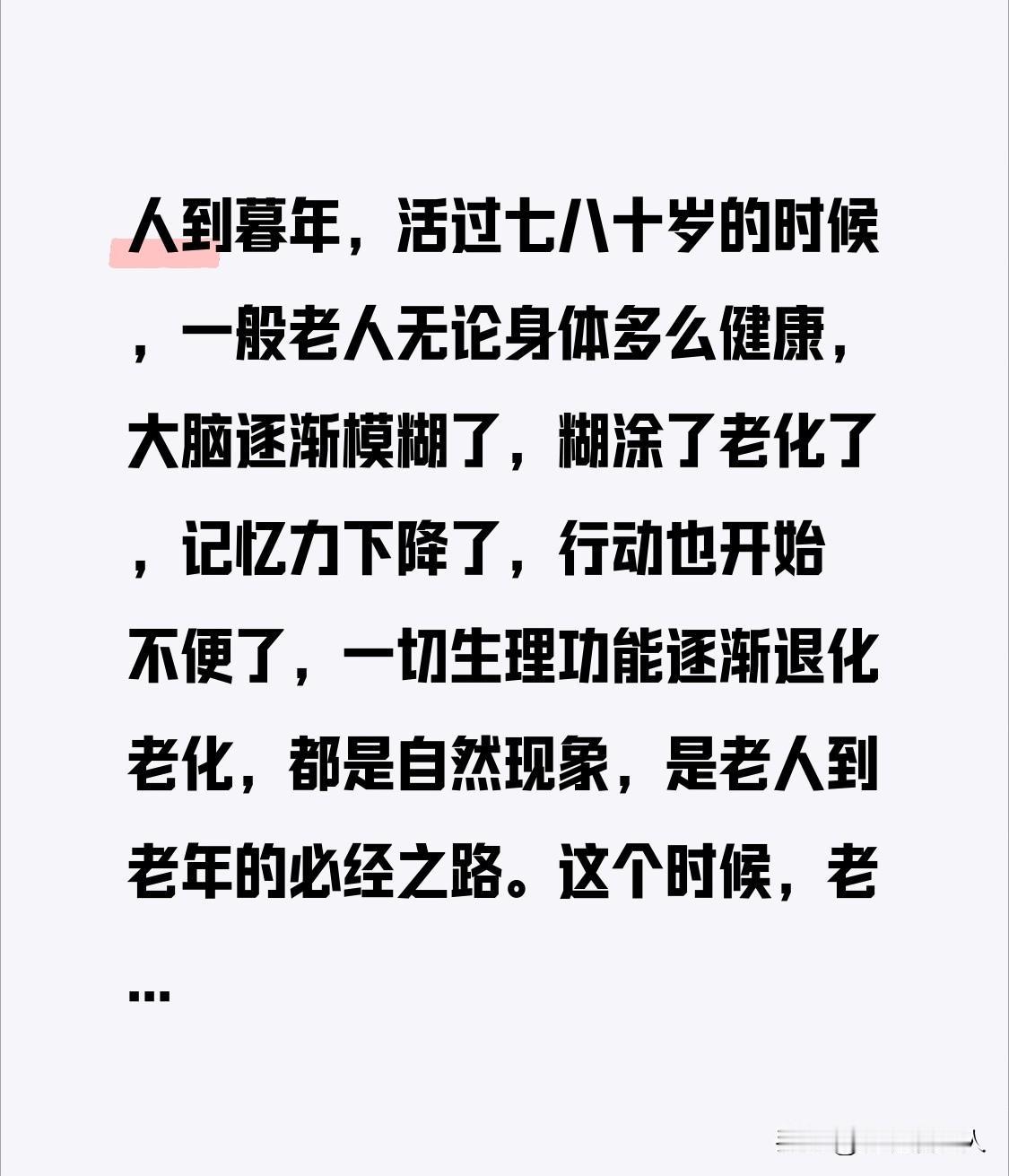 人至暮年,年届七八十,一般而言,无论身体多么康健,老人的大脑都会渐趋混沌、老化,记忆力衰退,行动也开始不便,一切生理机能逐渐退化,这皆是自然现象,是步入老年的必经之路。 此时,老人的养老模式已然固定,不会有太大变动。 到了这个阶段,老人无论手中钱财多寡,甚至身无分文,都不必思虑,切勿过度操心。毕竟自己的养老时光已近尾声,生命也快到终点,需求渐少,况且还有子女为自己的养老兜底。 人到暮年,只需好好活着。因为大脑已不再清晰,思绪愈发模糊,想得越多,只会越糊涂,越觉空白,越无结果,所以别再想了。 老人晚年的最后时光,千万别胡思乱想。无论何事,怎么想都无济于事,只能顺其自然,别想得太多,上天自会有安排。 活到暮年,有子女的老人,无论子女是否孝顺、有无能力为自己养老送终,都不必忧心。老人切勿胡思乱想,把这些事和身后事都交给时间、交给孩子,莫要自我折磨。 此时,子女必须为老人养老送终,这是我国多部法律明文规定的。法律保障子女要为赡养父母付出代价,这是子女的责任和义务,老人们尽可放心,别再为身后事操心。 没有子女的孤寡老人或单身老人,更不必担忧能否活下去、身后事如何处理。这些都应置之度外,别去想、别挂心,更别唠叨,想这些毫无意义。 如今国富民强,国家极为重视无力养老的孤寡老人。社会上好人众多,善人频出,做好事者不绝。要相信他们,自己年老体衰时,会有人为自己买单。有专业养老机构照顾陪伴老人,有社会和国家做后盾,老人千万别再挂念这些事,实无必要。 以上是本人观点,如有不妥,请大家在留言区留下宝贵意见,并积极参与评论,特邀请大家关注和探讨养老问题。和孙颖莎搭在一起 70后的你,想过自己怎么养老吗? 人到晚年最聪明的活法是什么?