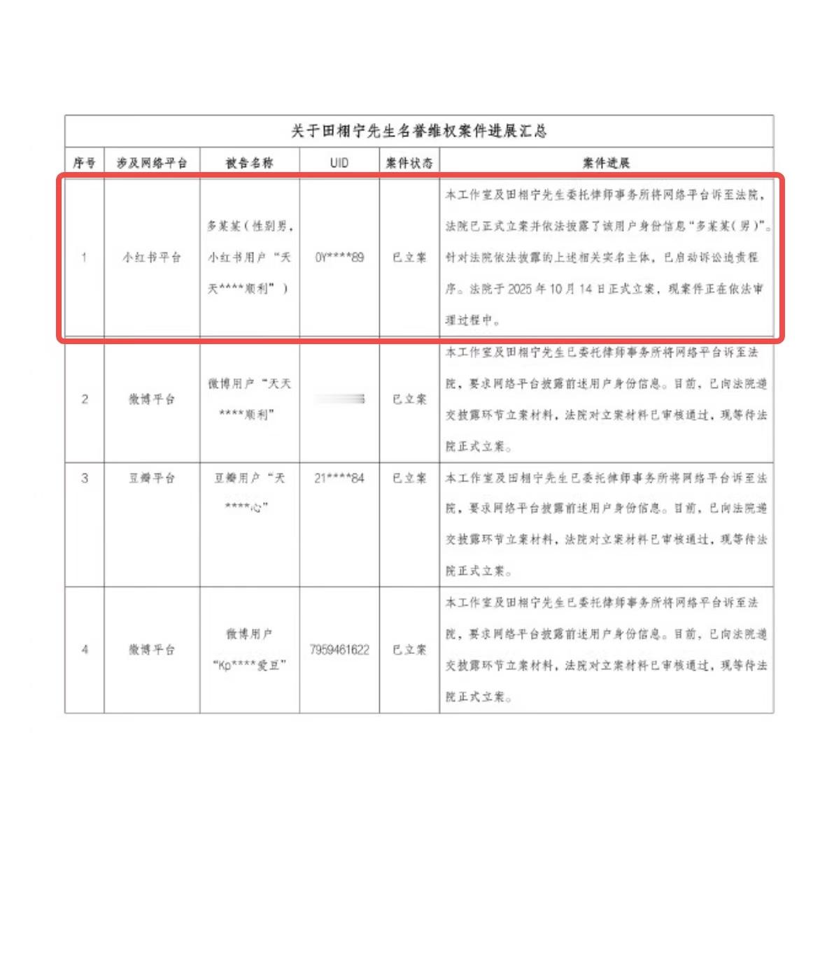 田栩宁告天天开心案即将开庭田栩宁新增维权案件天眼查天眼风险信息显示,近日,田雷(田栩宁)与多某等相关网络侵权责任纠纷案件新增开庭公告,原告为田雷(田栩宁),该案将于12月10日在上海市黄浦区人民法院开庭审理。此前,田栩宁方面委托兰迪律师事务所发布声明,并发文致歉回应婚育相关争议,否认已婚已育、孕期出轨等传闻。关于田栩宁先生名誉维权事宜之案件简讯显示,针对“天天开心生活顺利”等用户发起维权。