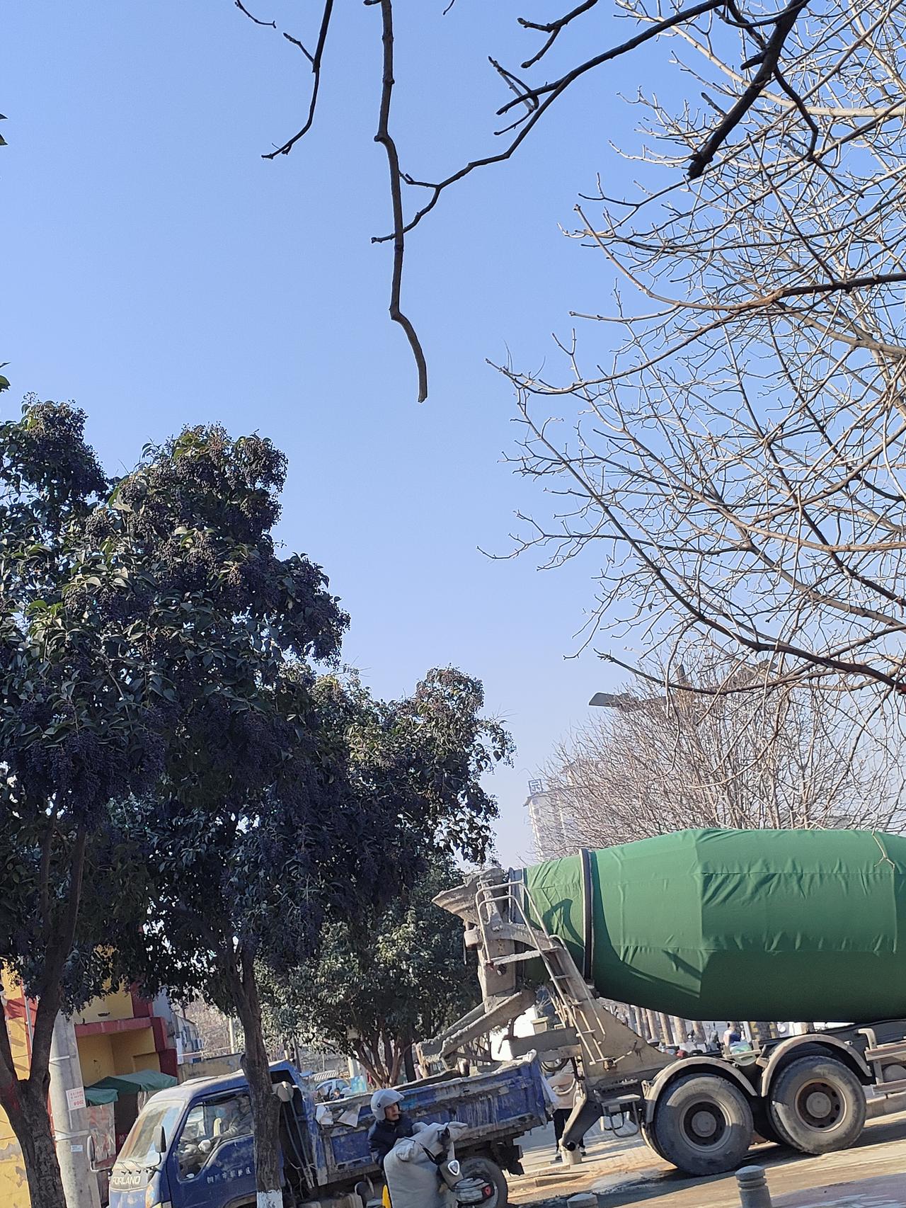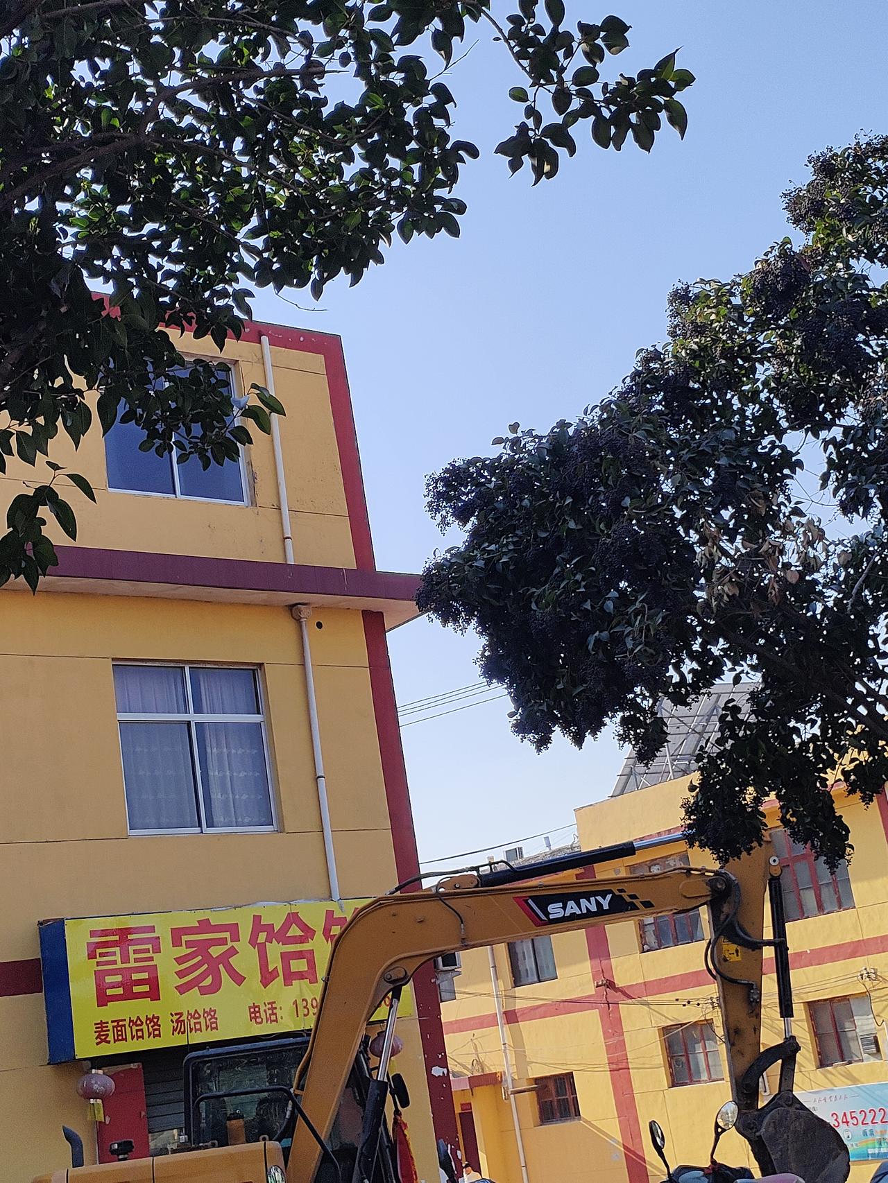 黄墙红边的小楼裹着烟火气,“雷家饸饹”的招牌亮得实在,挖机往门口一停,像是给这日常添了点忙活的劲儿。树枝坠着紫盈盈的果,蓝天衬得日子都敞亮——市井里的踏实,就是铺子开着、活儿干着,连风里都裹着热乎的生活味。
