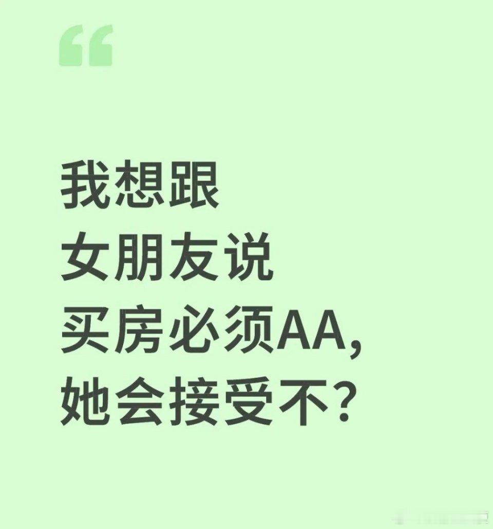 跟女朋友说买房必须AA,她会接受不?有时候需要想想跟着你图什么;虽然说天价彩礼不合适,但是如果是正常的要求呢(有很多都是想想谈了好几年了有感情了,谈彩礼伤感情,但是后面如果去相亲的要多少就给多少的,何尝不是另外一种打脸);买房AA,彩礼呢,后续装修呢,女方陪嫁是不是也惦记。
